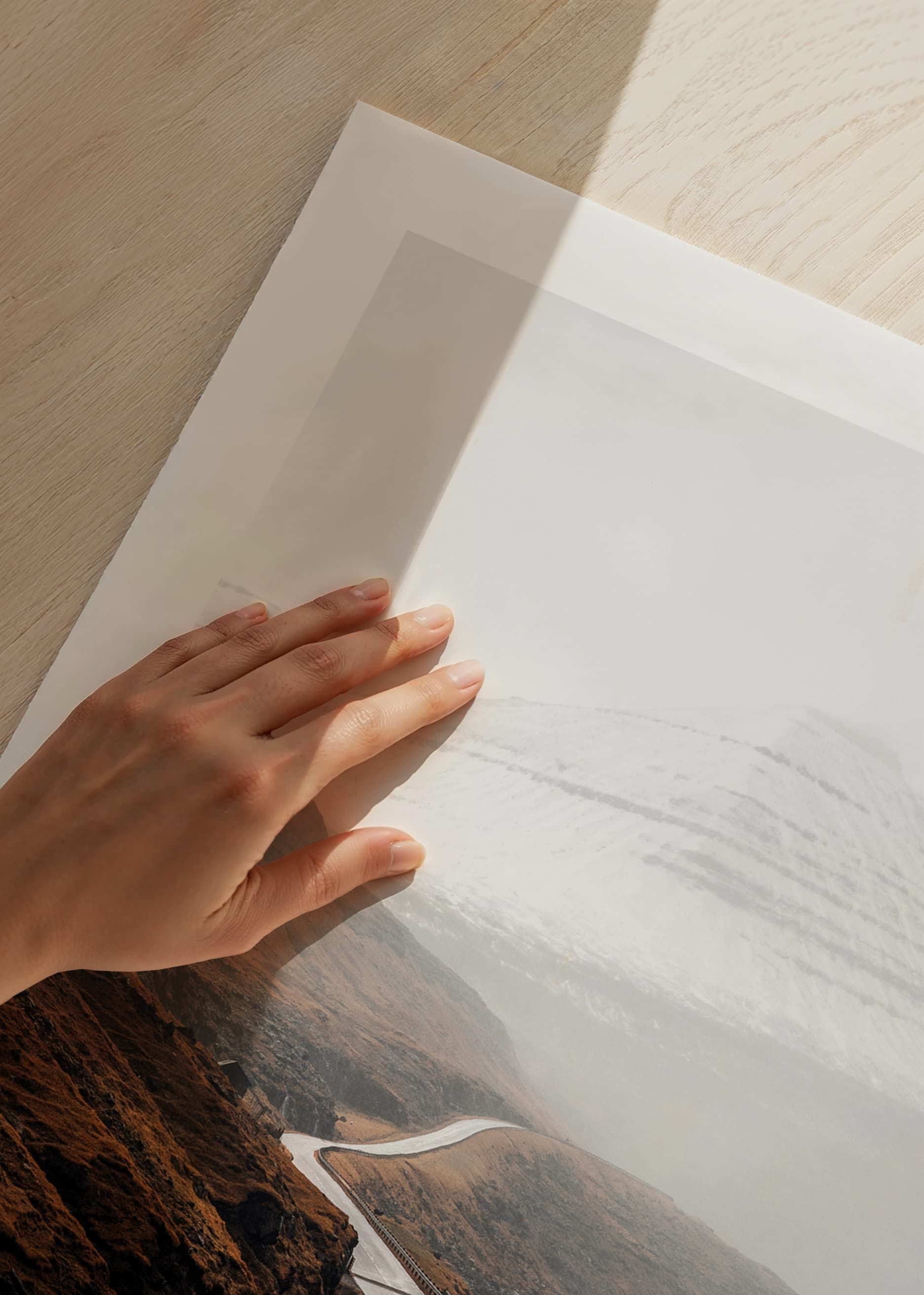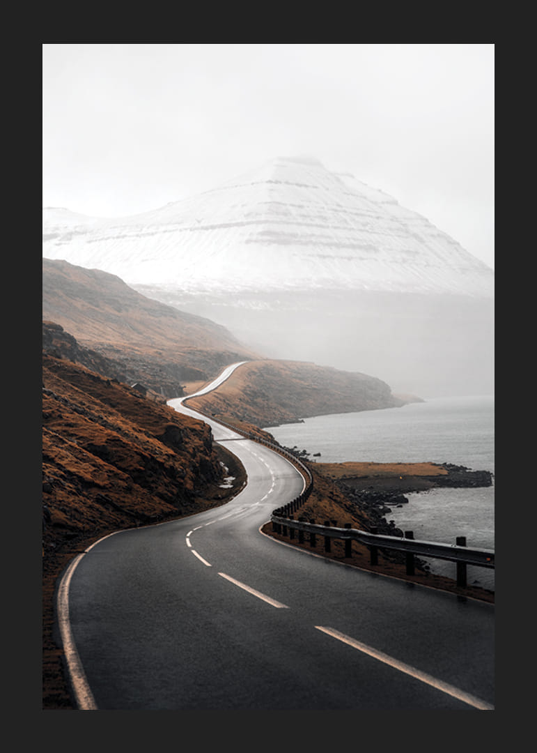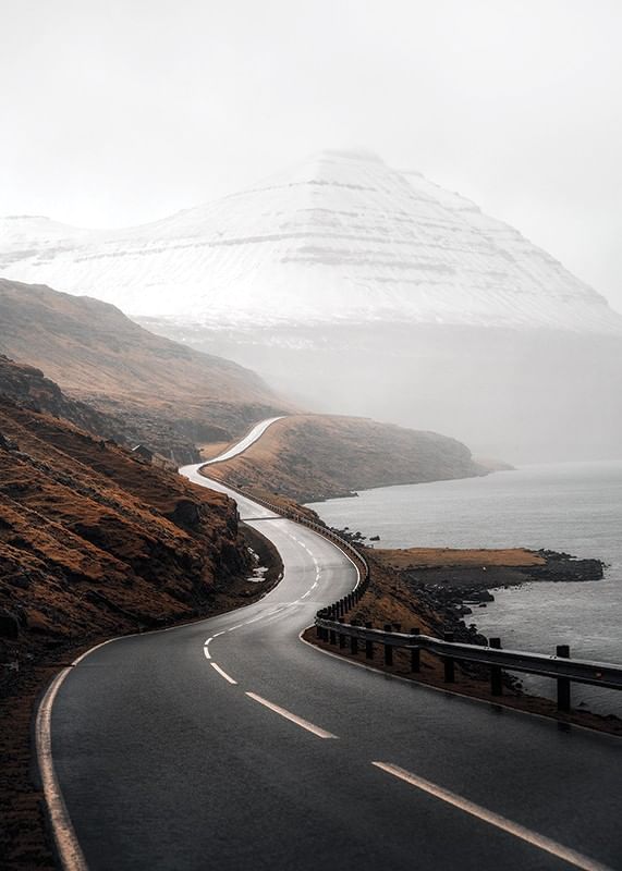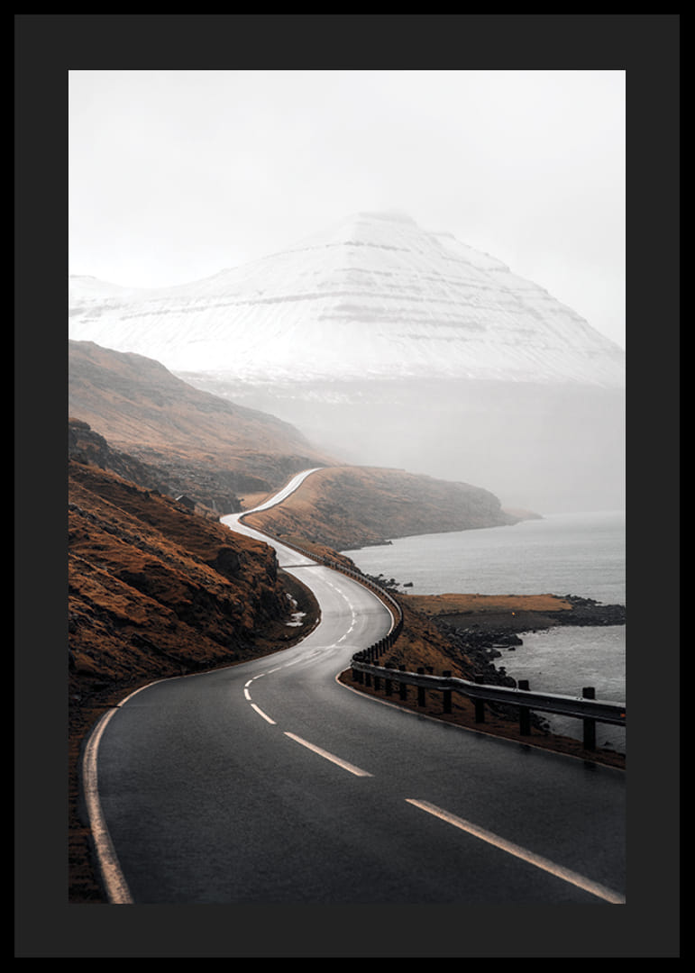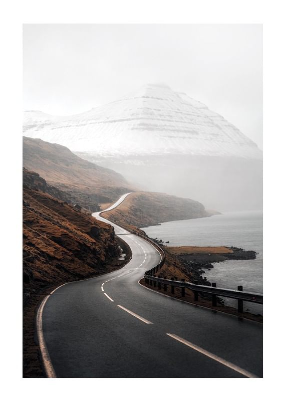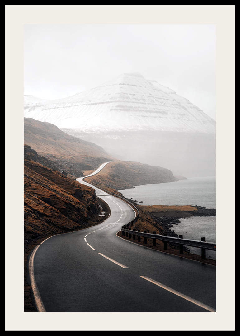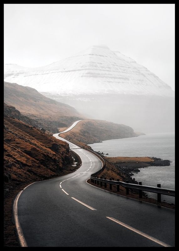 Slingrande landsväg leder genom ett dramatiskt kustlandskap där höstbruna berg möter vattnet och snötäckta fjäll reser sig i bakgrunden. Dova jordtoner och mjukt ljus skapar en stillsam och stämningsfull atmosfär. Den här postern kompletterar både vardagsrum och arbetsrum med naturnära karaktär.