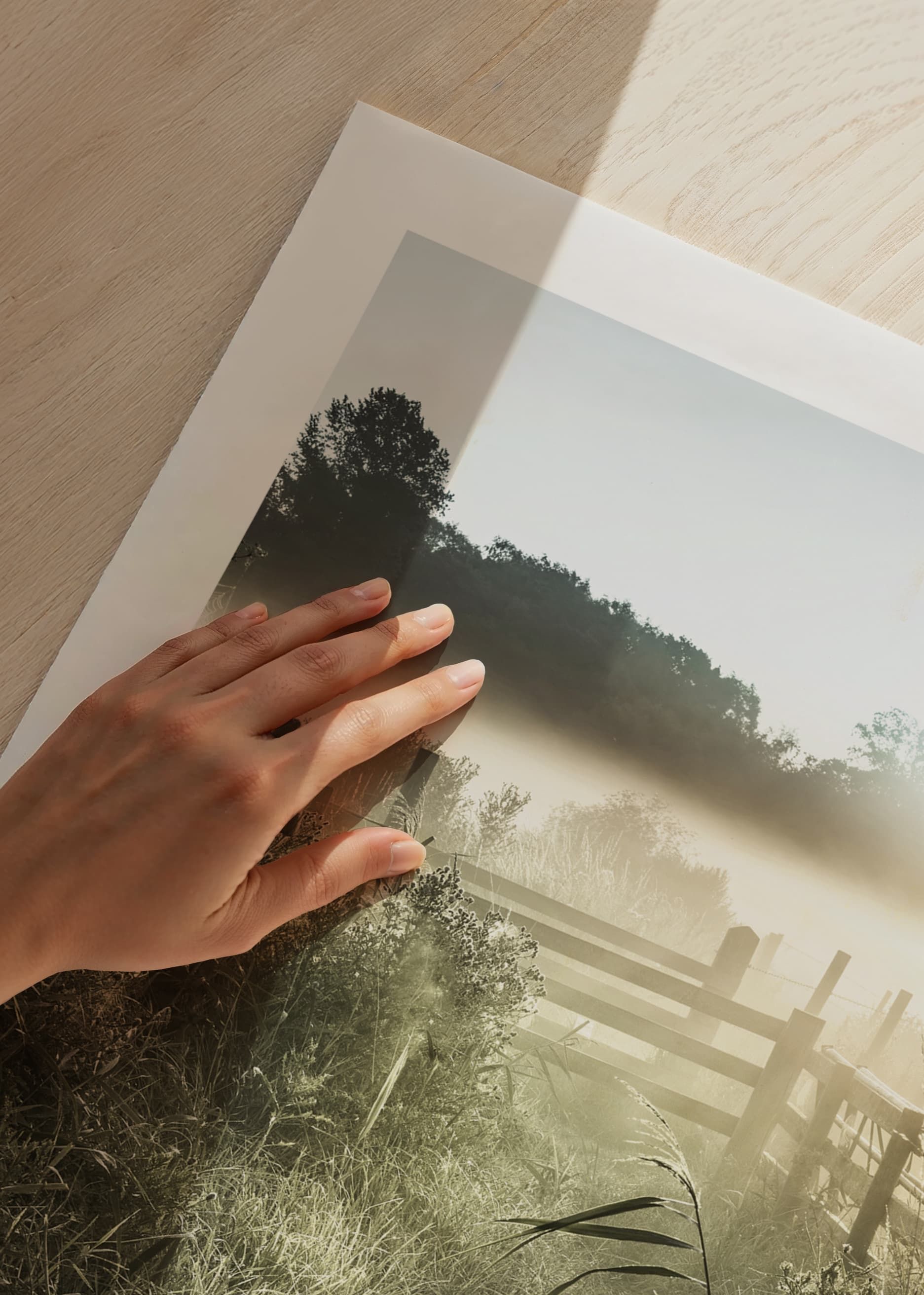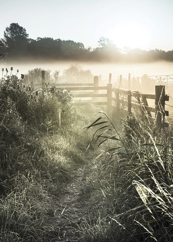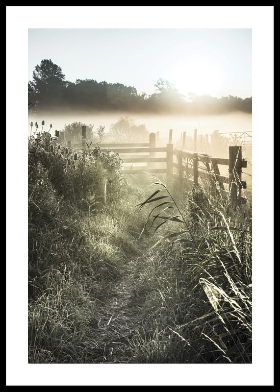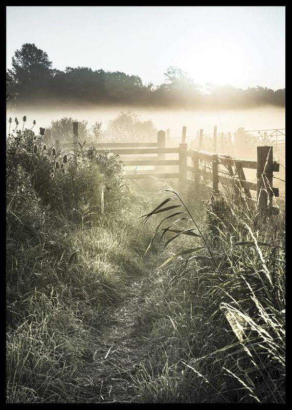 En smal grusväg slingrar sig fram mellan högt gräs och vilda växter, med ett trästaket till höger och dimma som ligger tät över fälten. Ljus från den låga morgonsolen sprider sig över landskapet och skapar mjuka kontraster. Den här postern tillför en lugn och naturlig känsla till hemmet.