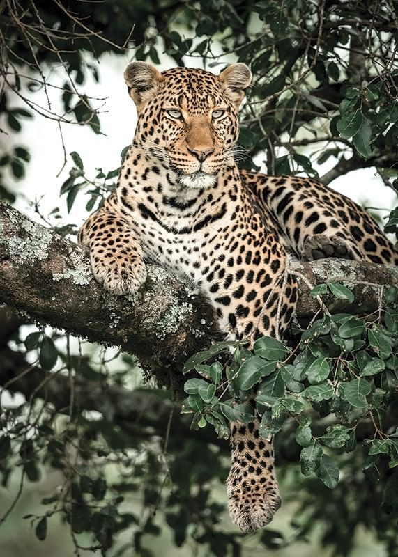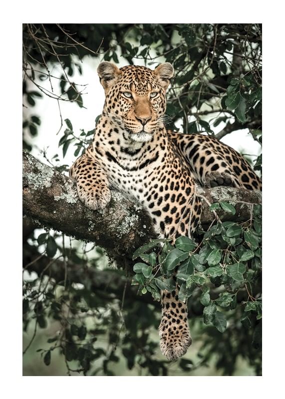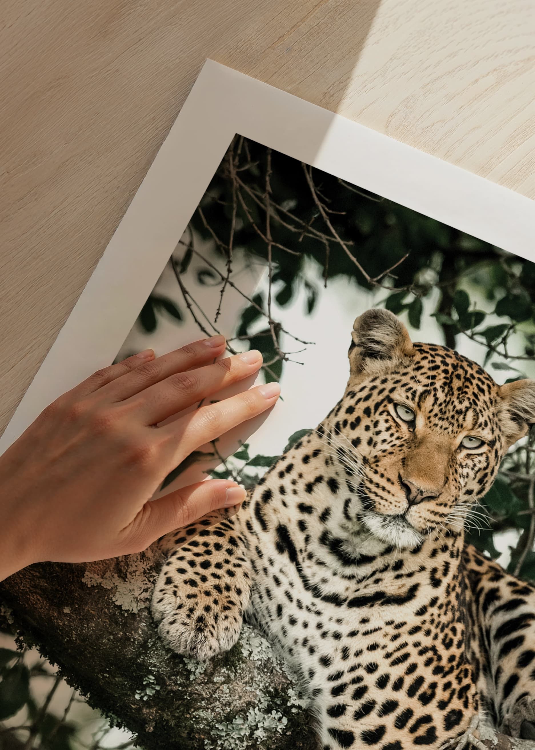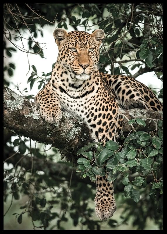 Leopard med fläckig päls vilar bekvämt på en kraftig trädgren omgiven av täta, gröna blad. Detaljerad fotografering fångar djurets alerthet och det naturliga ljuset bland grenarna. Denna poster adderar en tydlig känsla av savannens djurliv och passar i både vardagsrum och arbetsrum.