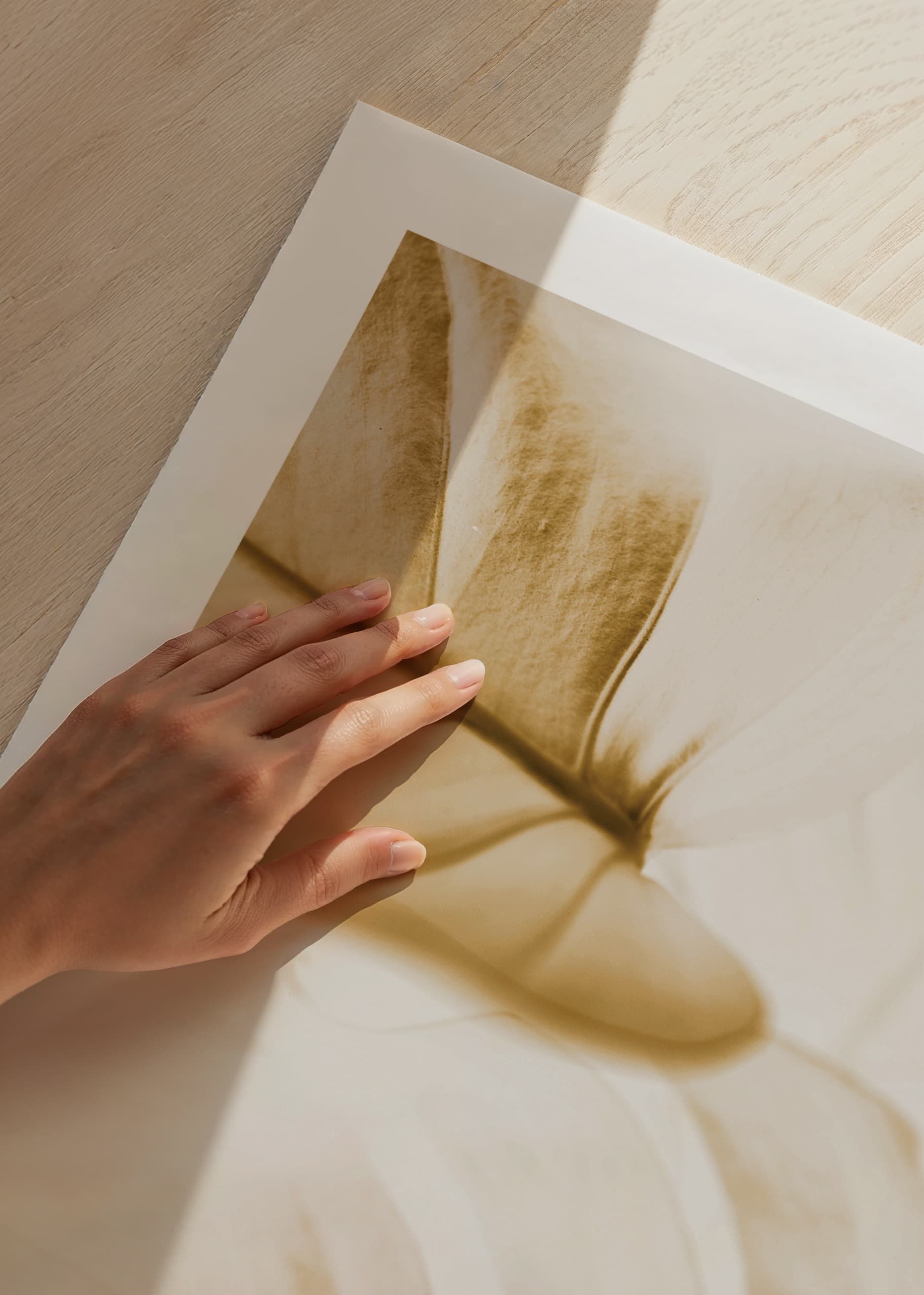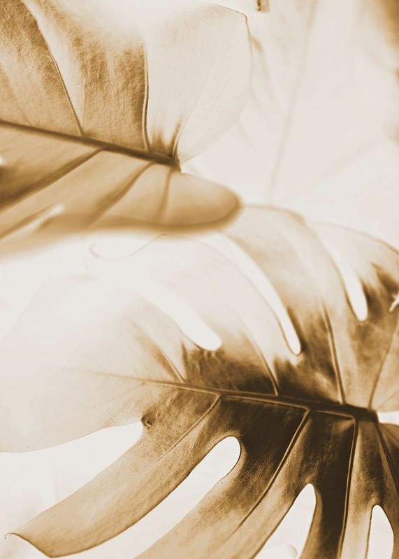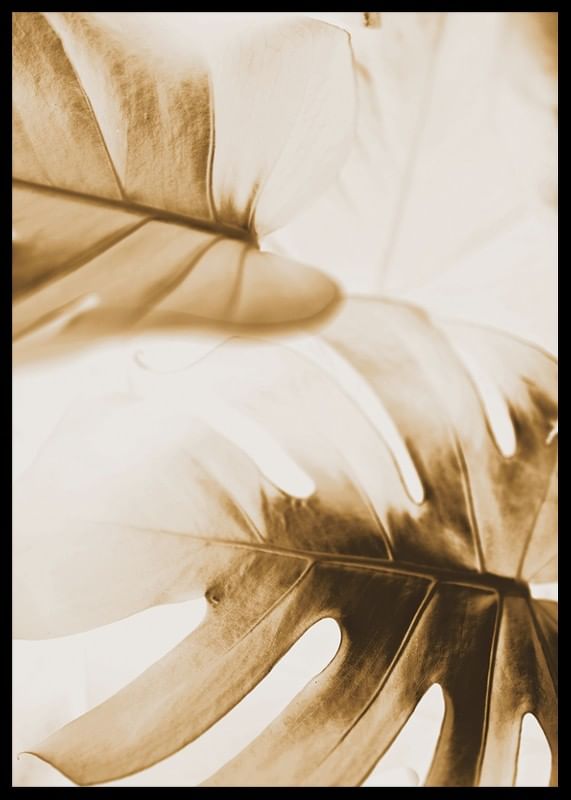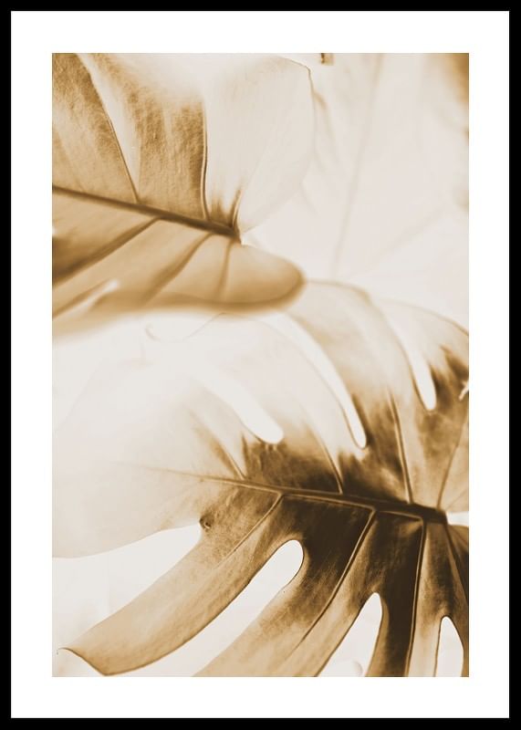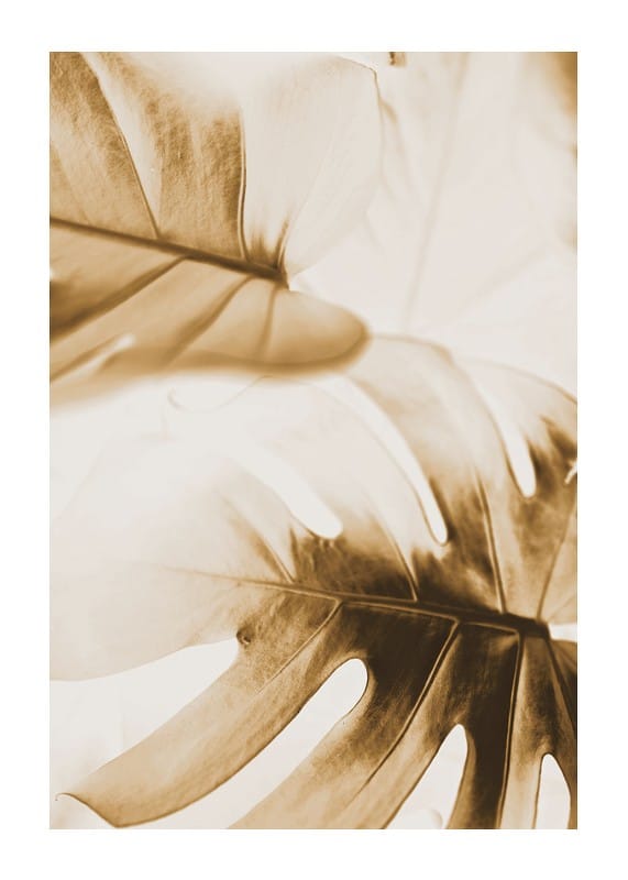 Stora monstera-blad i närbild med mjuka gyllene sepia-nyanser och tydliga bladnerver. Motivet har en minimalistisk och stilren känsla där de ljusa och varma tonerna skapar en lugn atmosfär. Den här postern passar fint i moderna rum och ger en naturlig men elegant inramning till inredningen.