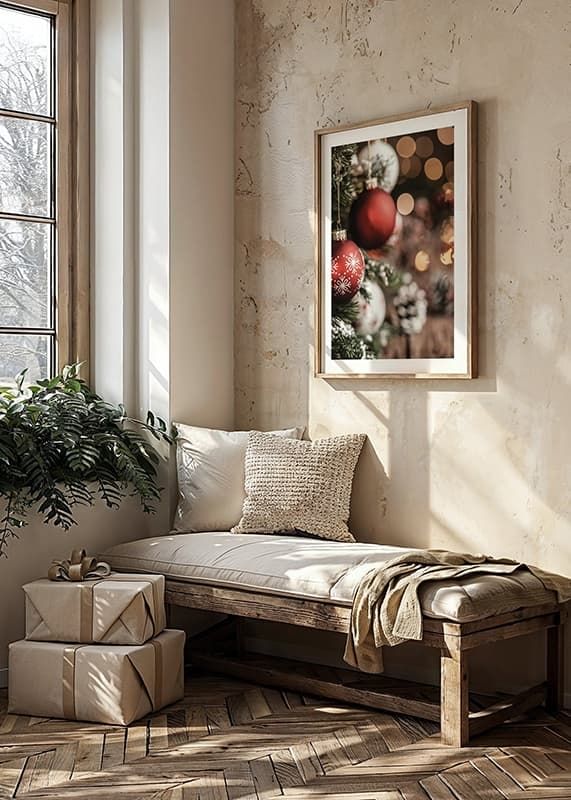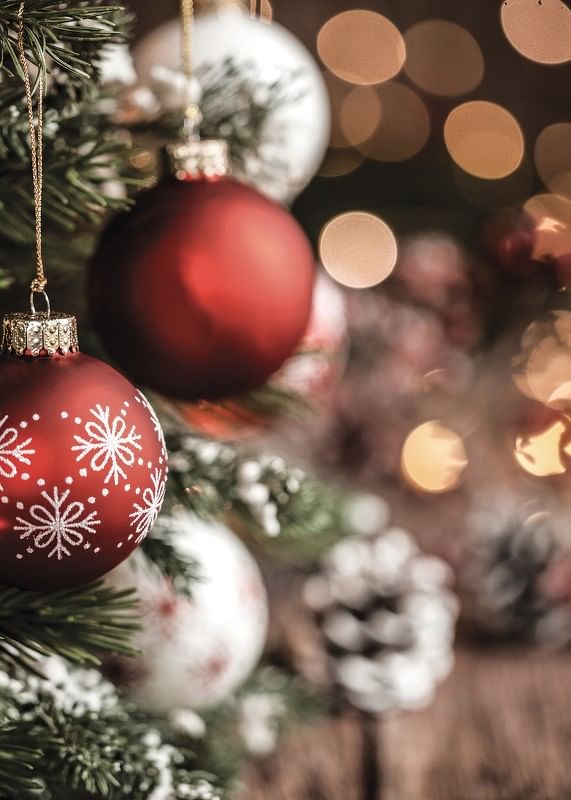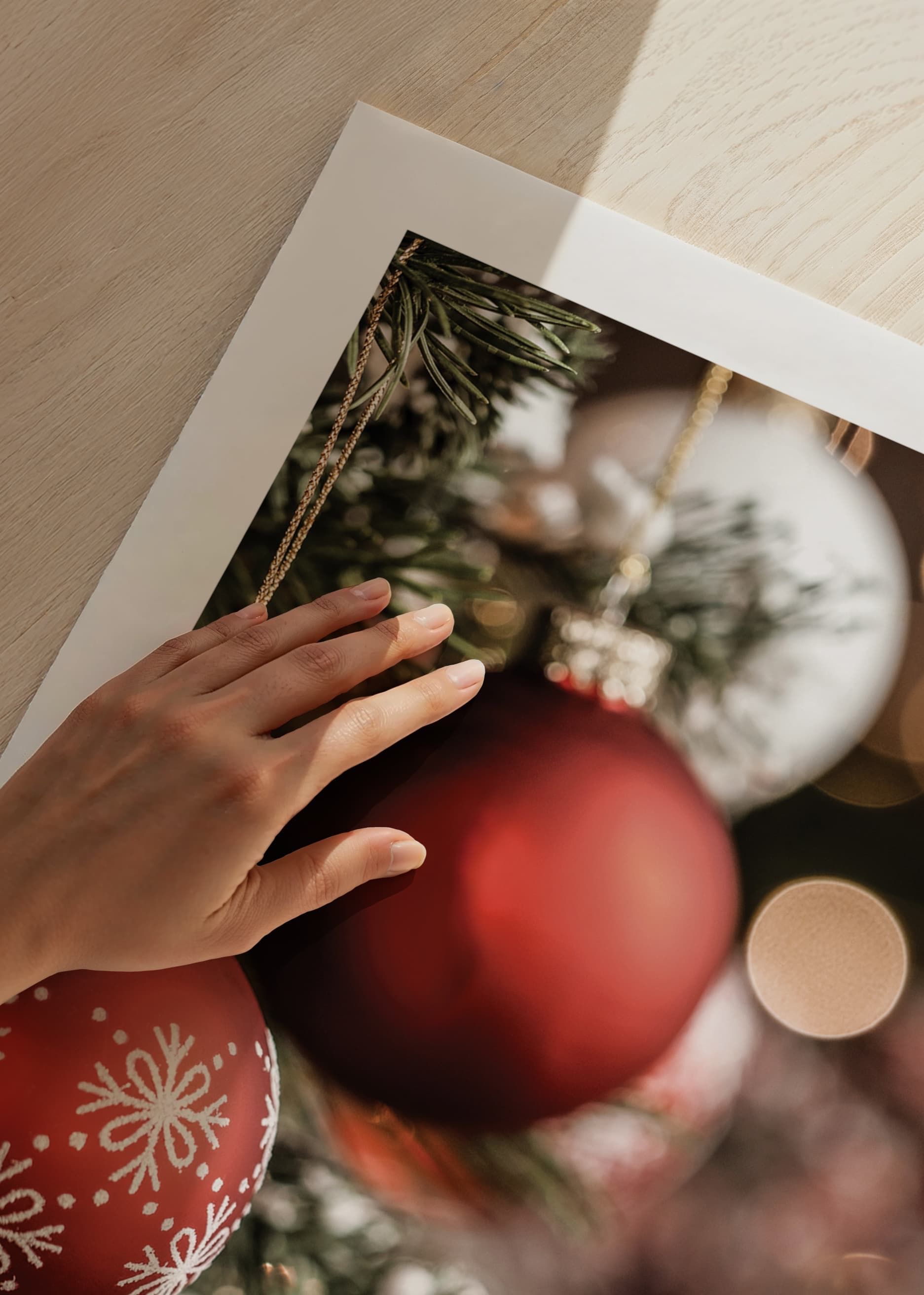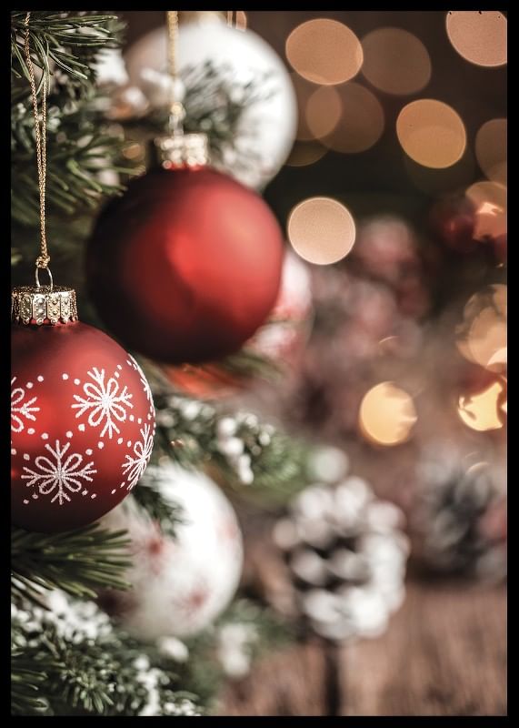 Röda och vita julkulor med snöflingemotiv hänger bland gröna grenar i en julgran. Bakgrunden är mjukt suddad och pryds av varma ljuspunkter som sprider högtidskänsla. Denna poster ger ett klassiskt inslag av julstämning och passar fint i vardagsrum eller hall under vintersäsongen.