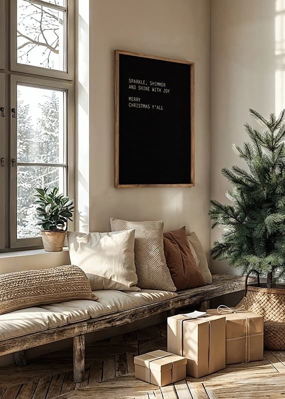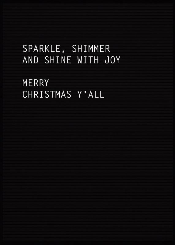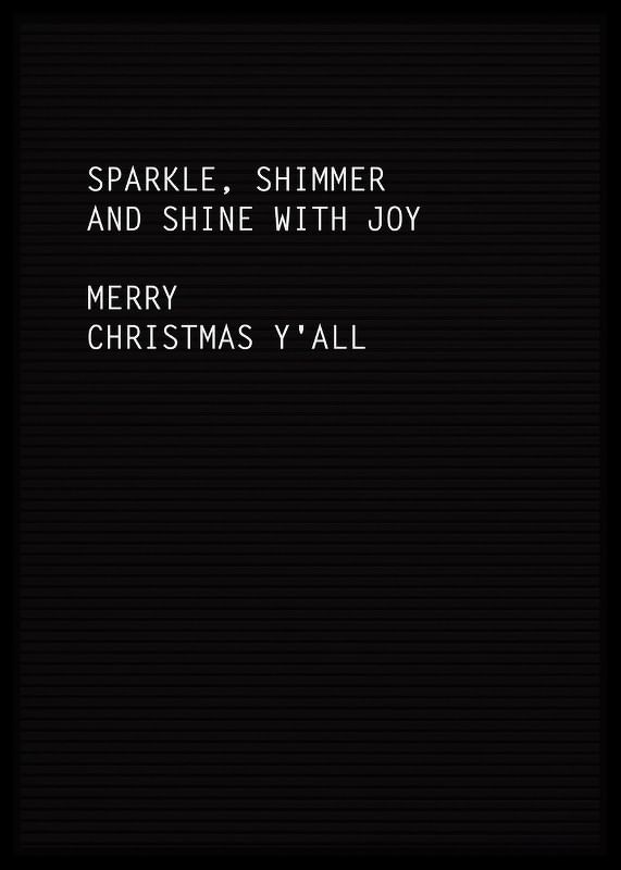 Texten 'Sparkle, shimmer and shine with joy. Merry Christmas y'all' syns i vita versaler mot en helt svart letter board-bakgrund. Den grafiska och minimalistiska stilen gör motivet lättplacerat i moderna hem. En poster som tillför en subtil julkänsla i exempelvis hall, kök eller vardagsrum utan att ta över inredningen.