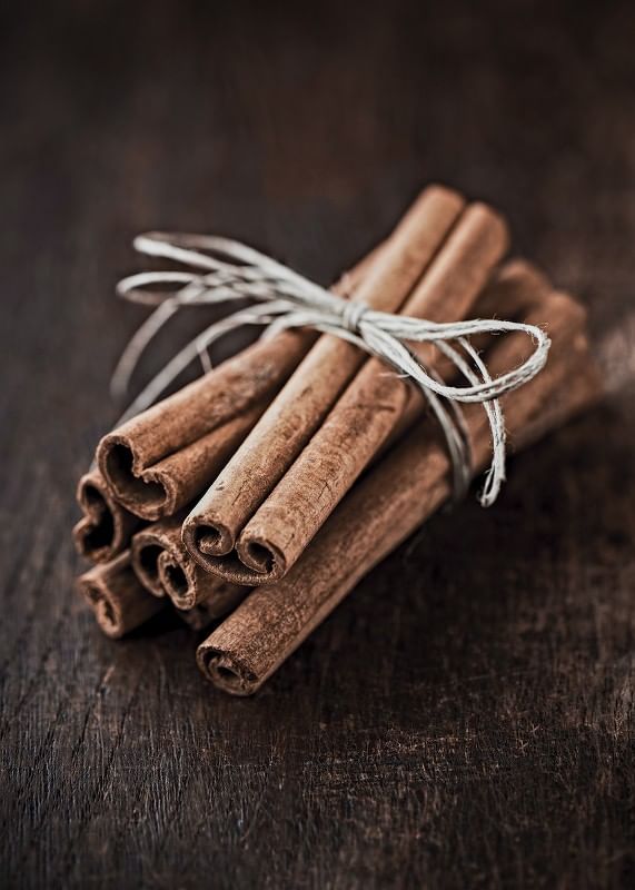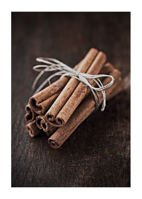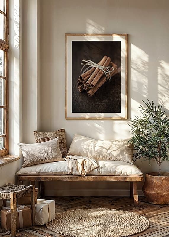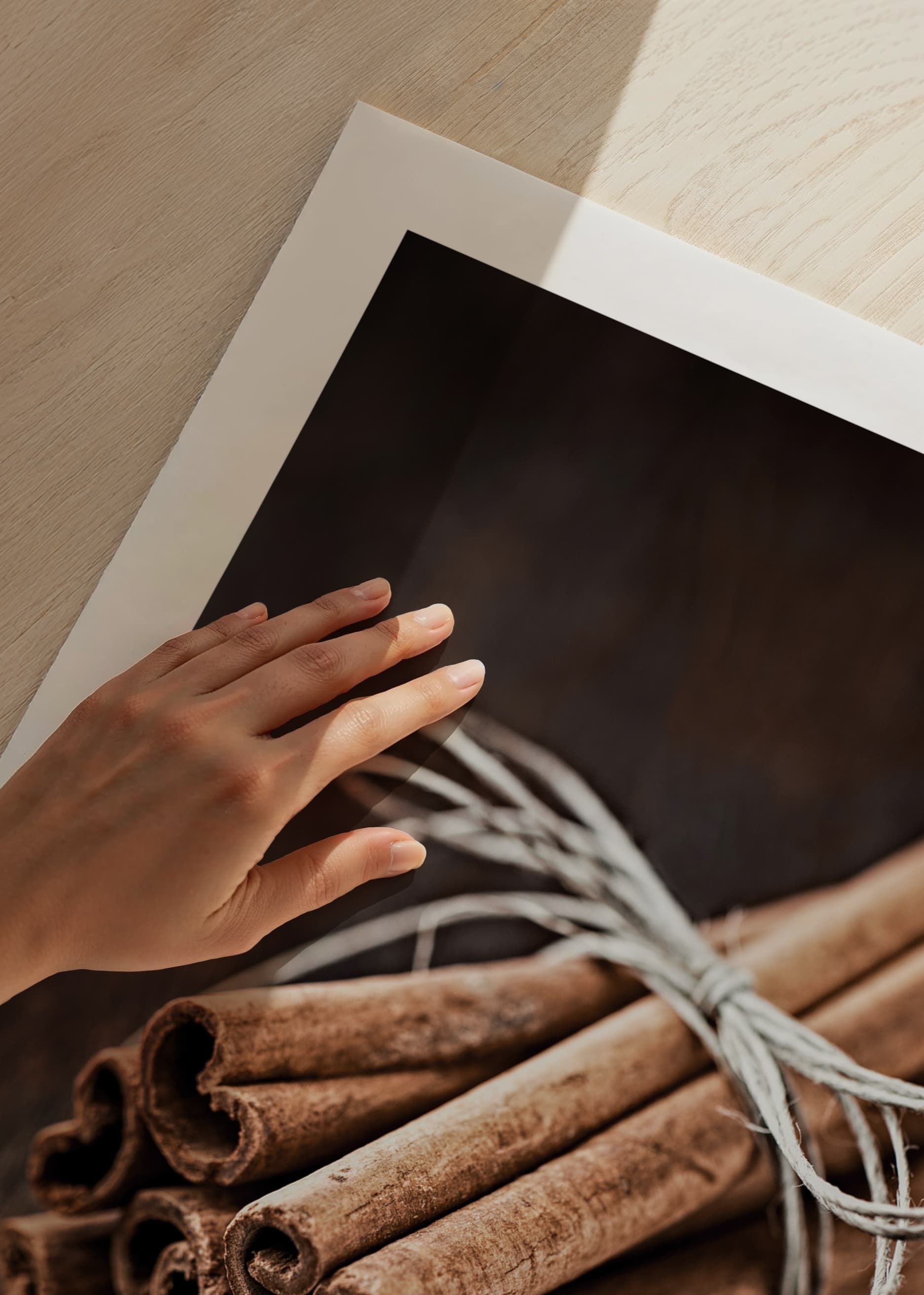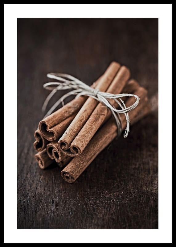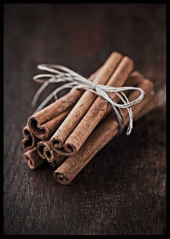 Kanelstänger ligger samlade i en tät bunt och är omsorgsfullt knutna med ett snöre. Den mörkbruna träytan i bakgrunden lyfter fram de varma tonerna och den grova texturen hos kryddorna. Med sin rustika känsla bidrar denna poster till en inbjudande och säsongsbetonad atmosfär i kök eller matsal.