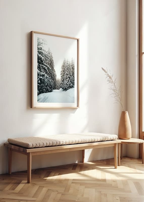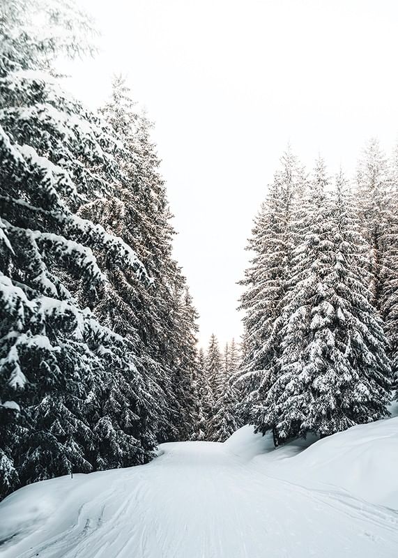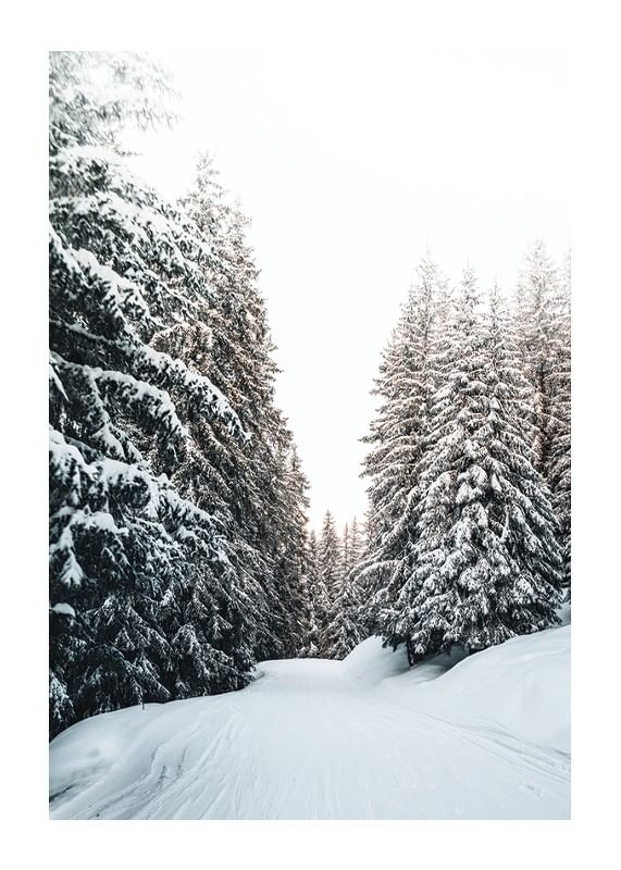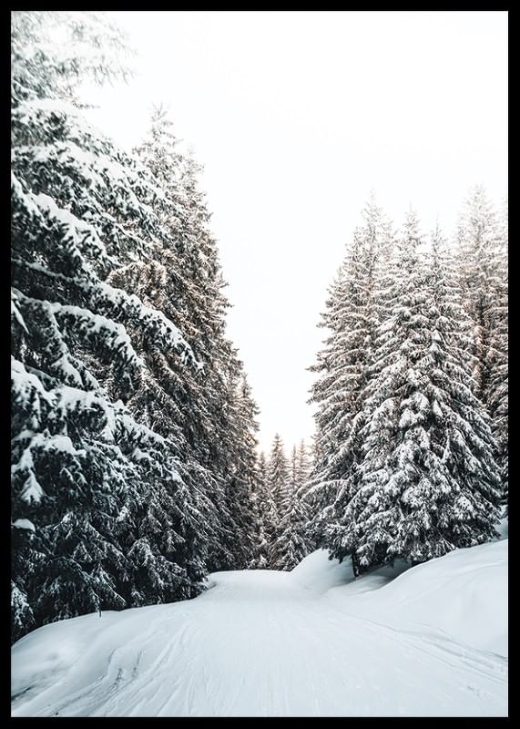 Motivet består av en snötäckt väg som slingrar sig genom tät skog av höga granar, vars grenar bär tjock snö. Det ljusa himmelsljuset skapar en tydlig kontrast mot de mörka träden och förstärker vinterns stillhet. Denna poster lyfter fram naturens lugna färgskala och ger ett säsongsmässigt inslag till både vardagsrum och hall.