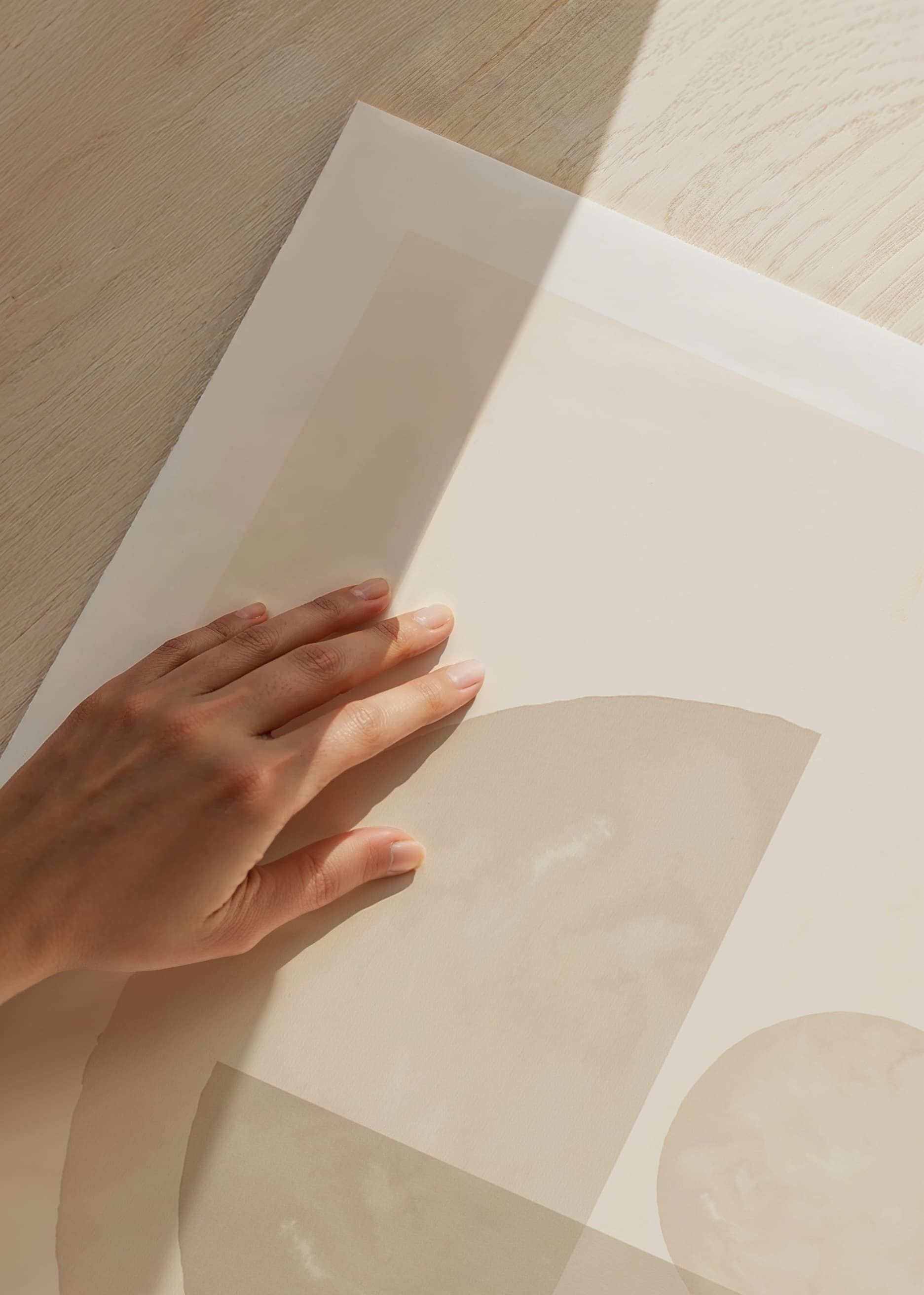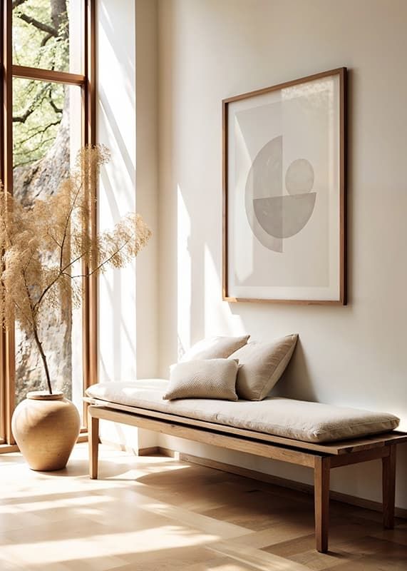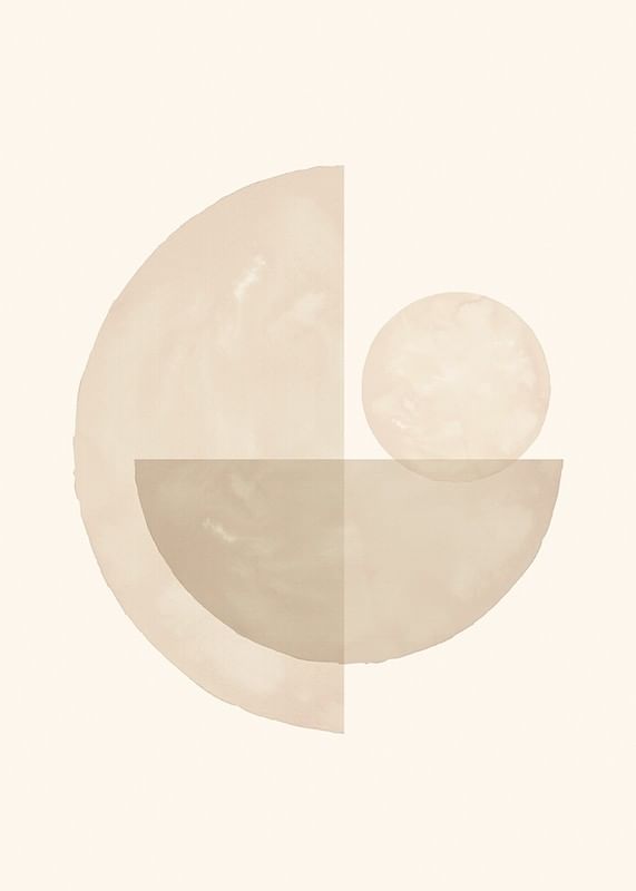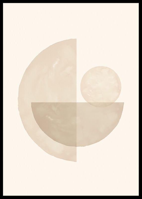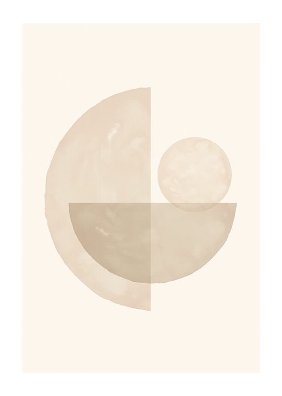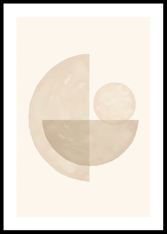 Mjuka cirklar och halvcirklar i olika beige nyanser bildar ett balanserat abstrakt motiv mot ljus sandfärgad bakgrund. Tydliga vattenfärgsliknande texturer ger ett organiskt intryck. Den här postern passar i rum där en subtil och stilren dekoration önskas, exempelvis vardagsrum eller arbetsplats.