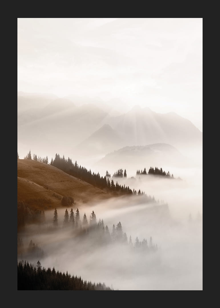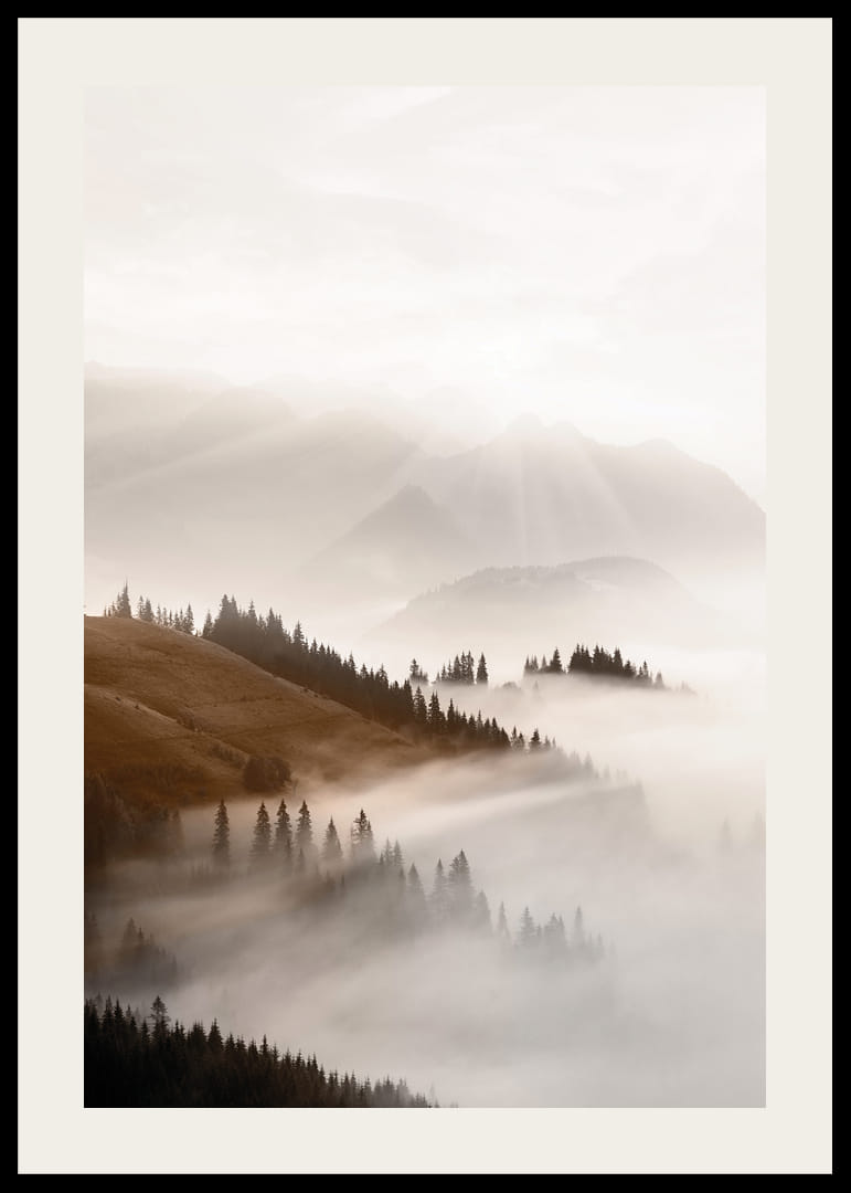 Skikt av dimma sveper in över en dal med mörka granar och höstbruna kullar, medan mjuka solstrålar tränger igenom i bakgrunden. Fotot har en lugn och neutral färgskala, vilket gör denna poster till ett diskret inslag i vardagsrum eller sovrum där en naturlig och tidlös känsla uppskattas.