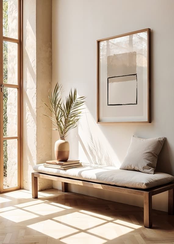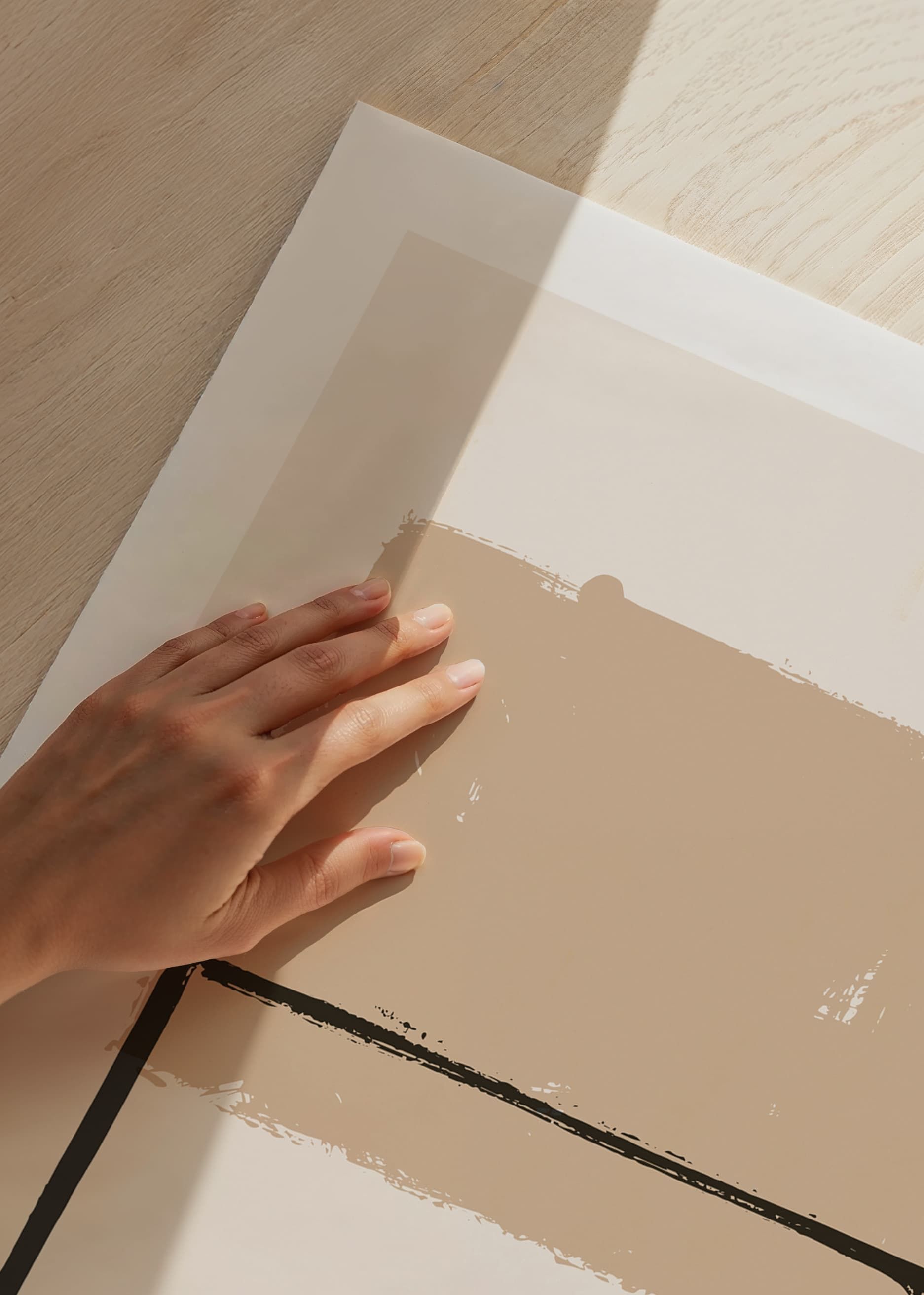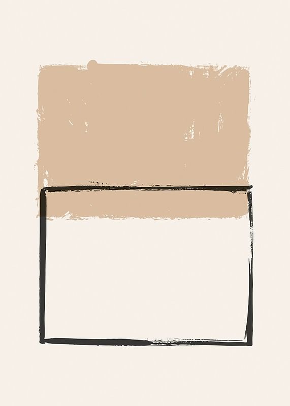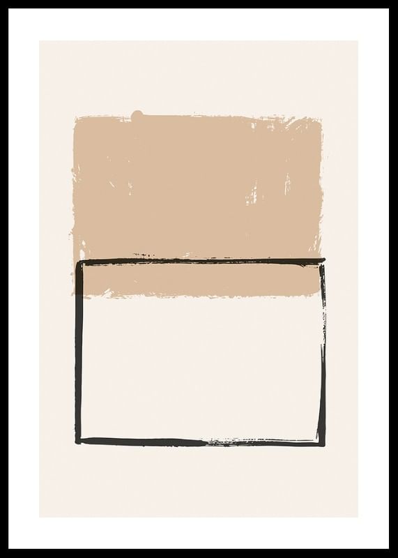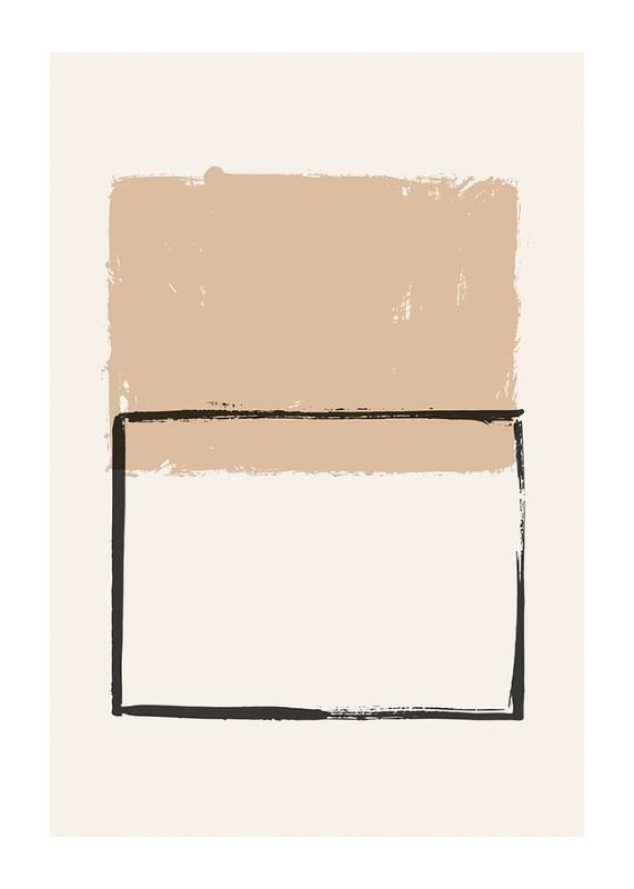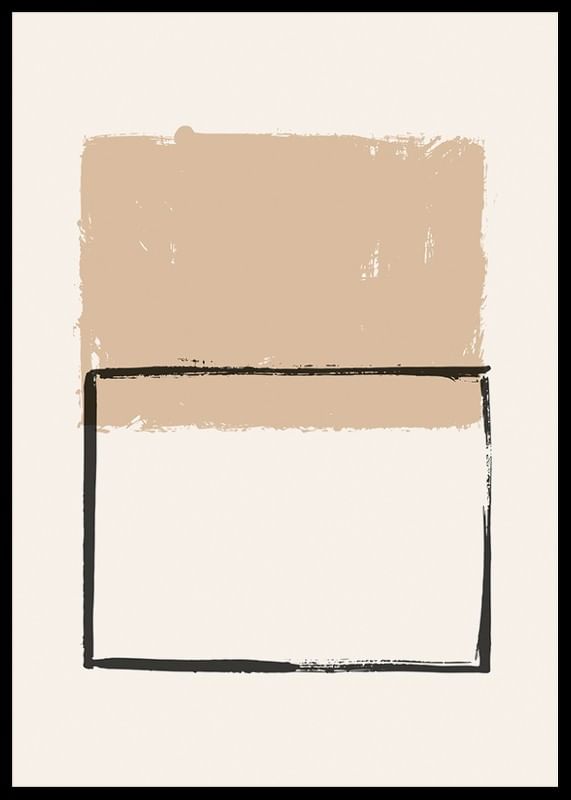 Oregelbundna geometriska former i mjuka beige och svarta nyanser bildar motivet, där en målad rektangel i svart kontrasterar mot ett fylligt, sandfärgat block ovanpå. Enkla linjer och mjuka kanter ger postern ett stilrent och modernt uttryck. Passar utmärkt i vardagsrum, arbetsrum eller hall.