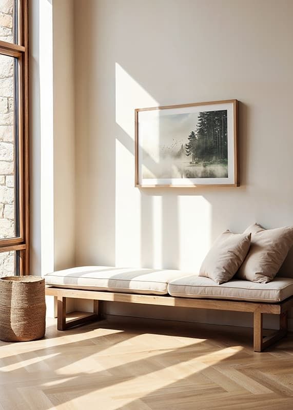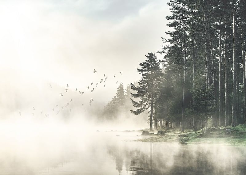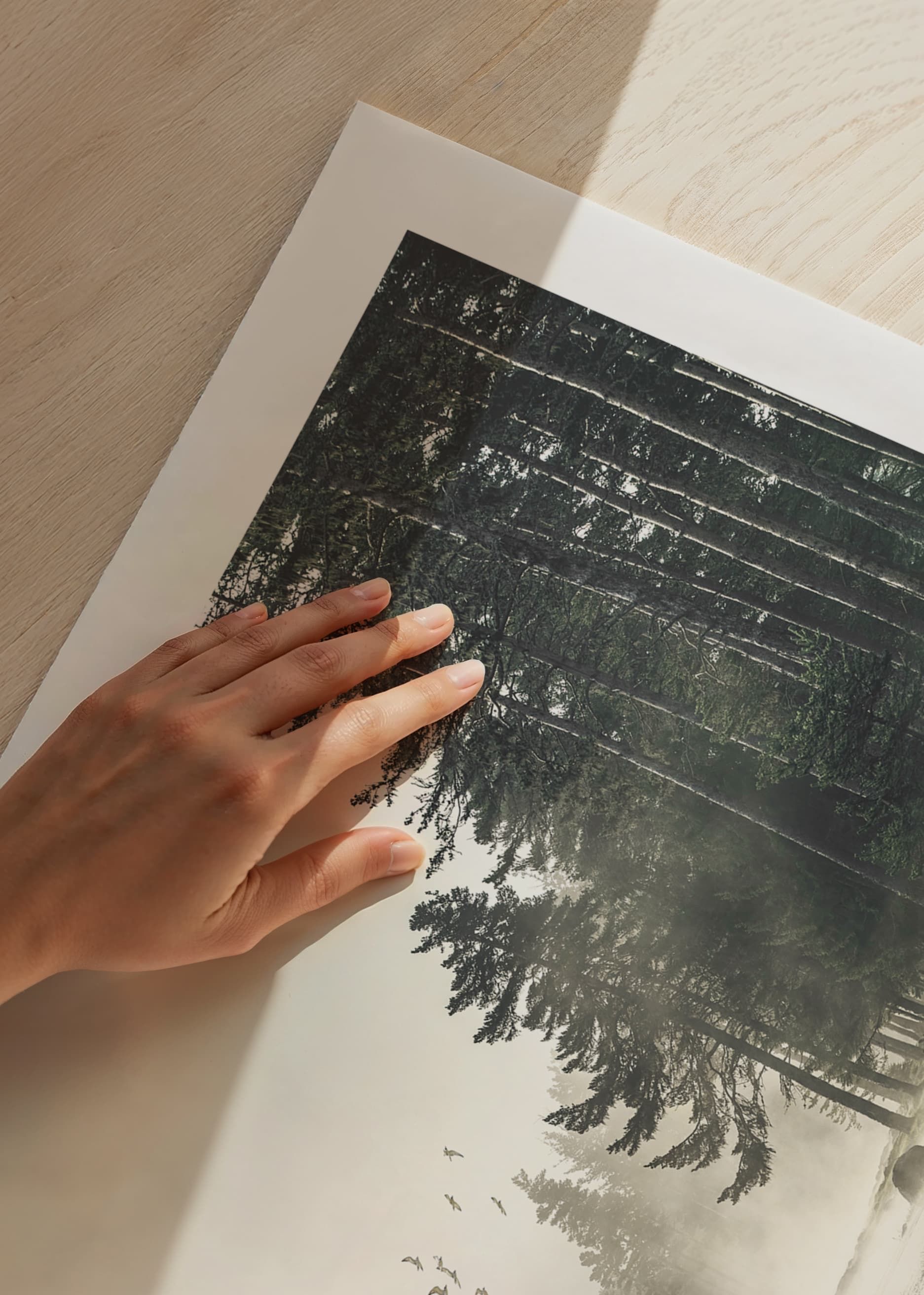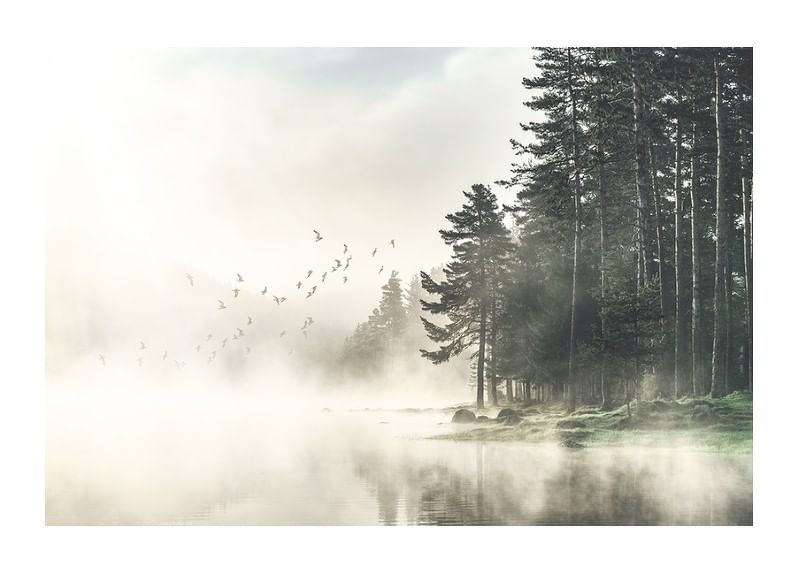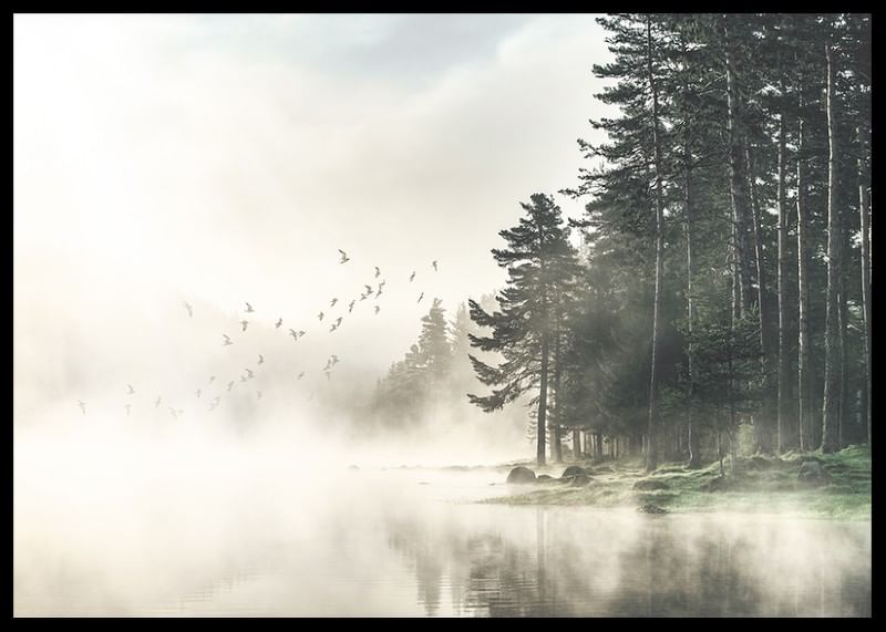 Tallskog reser sig längs strandkanten intill en stilla sjö där tät dimma sveper in landskapet. En flock fåglar flyger över vattnet, vilket skapar liv i det lugna motivet. Naturfärger med inslag av grönt, grått och dämpat ljus dominerar denna poster som ger ett subtilt och naturnära uttryck i hemmet.