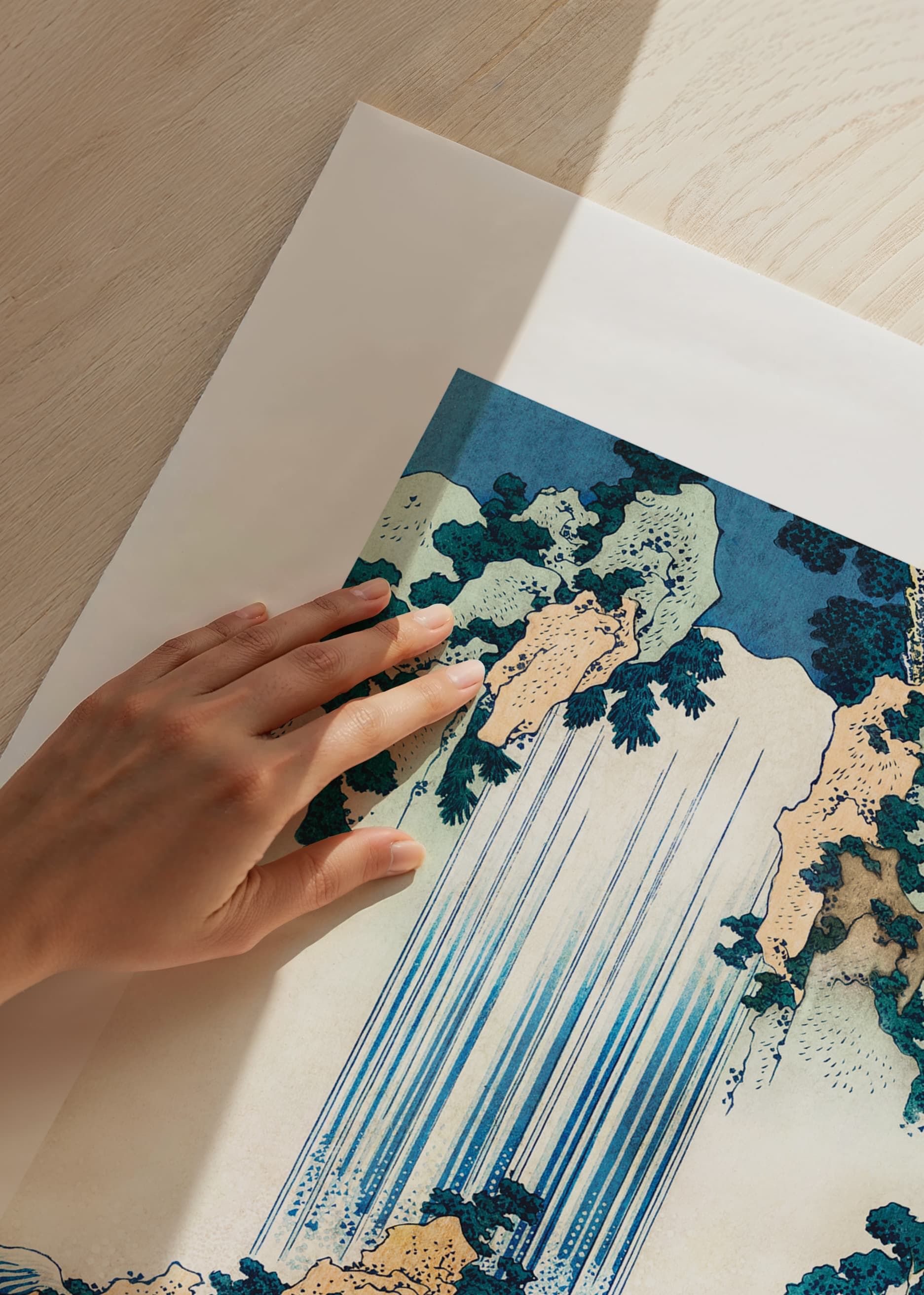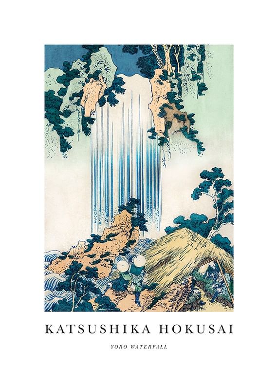 Vertikala blå linjer illustrerar det fallande vattnet från Yoro-vattenfallet, omgiven av gröna träd, klippor och ett halmtakshus. I motivets nedre del syns två små gestalter på stigen bland bergen. Skapad av den japanske mästaren Katsushika Hokusai, verksam under Edo-perioden och internationellt erkänd som en pionjär inom ukiyo-e, traditionell japansk träsnittskonst.