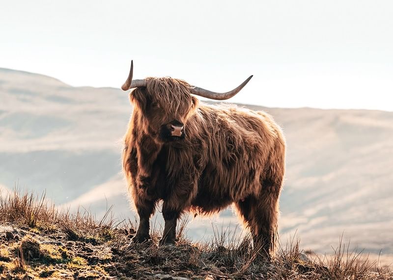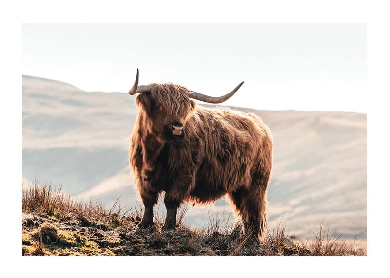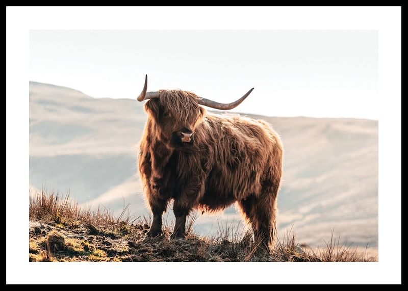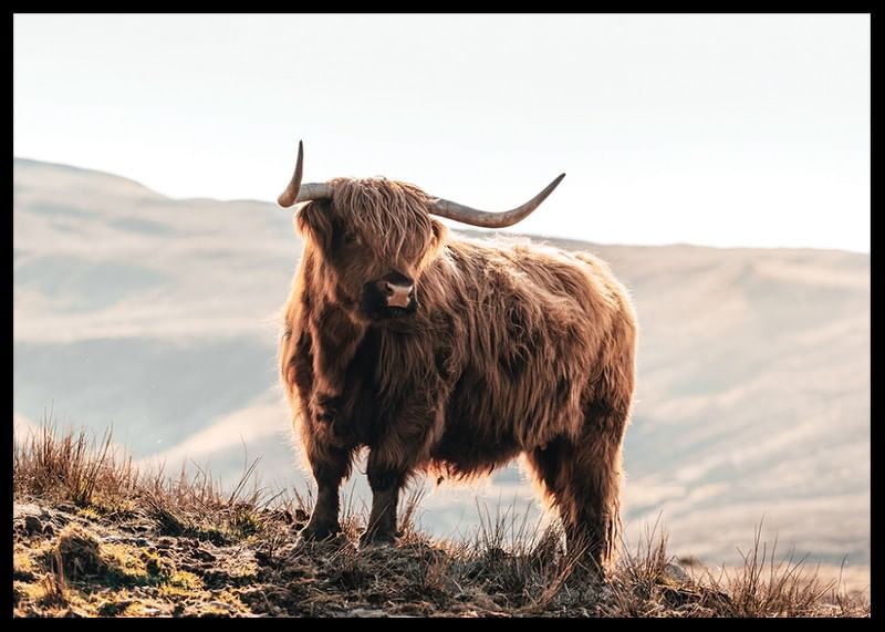 Höglandsko med lång, rufsig päls står på en kulle i varmt solljus, omgiven av ett mjukt, böljande landskap i beige och bruna toner. Den naturliga miljön och det karakteristiska utseendet ger postern en tidlös känsla som passar bra i vardagsrum, hall eller arbetsrum för ett naturnära inslag.