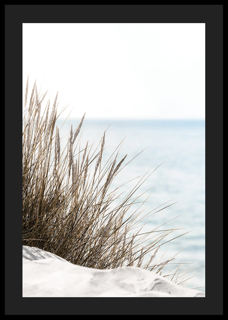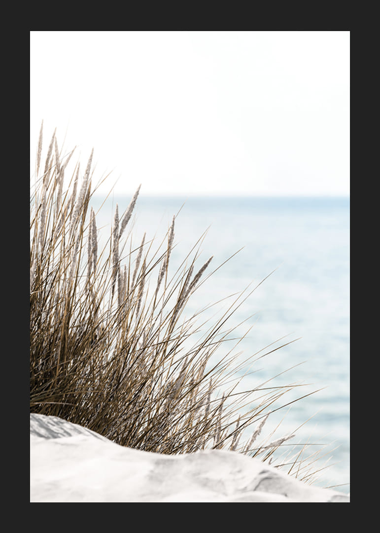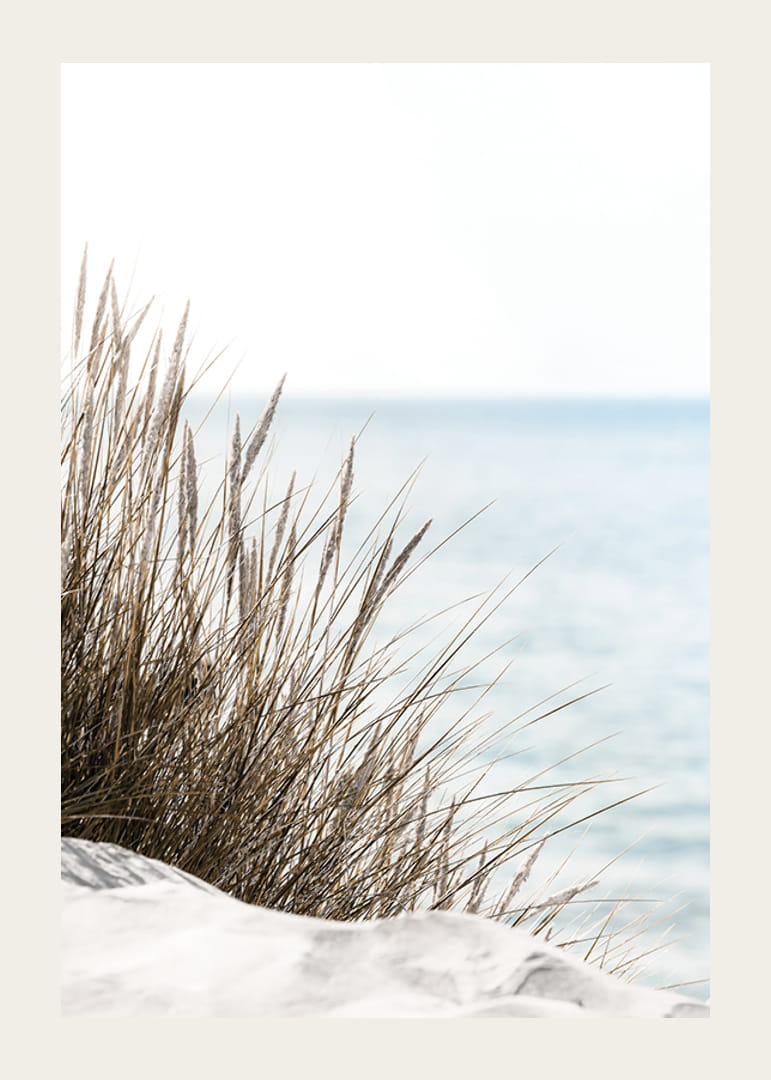 Högt beigegrönt strandgräs reser sig ur ljus sand, med havet mjukt suddigt i bakgrunden och himlen ljust blå över horisonten. Naturliga, dämpade färger och minimalism präglar motivet, vilket gör denna poster till ett lugnt inslag i vardagsrum eller sovrum där natur och stillhet får ta plats.