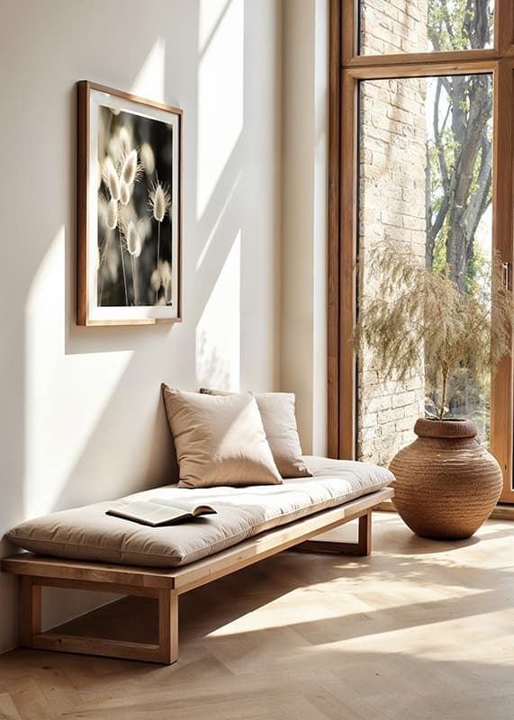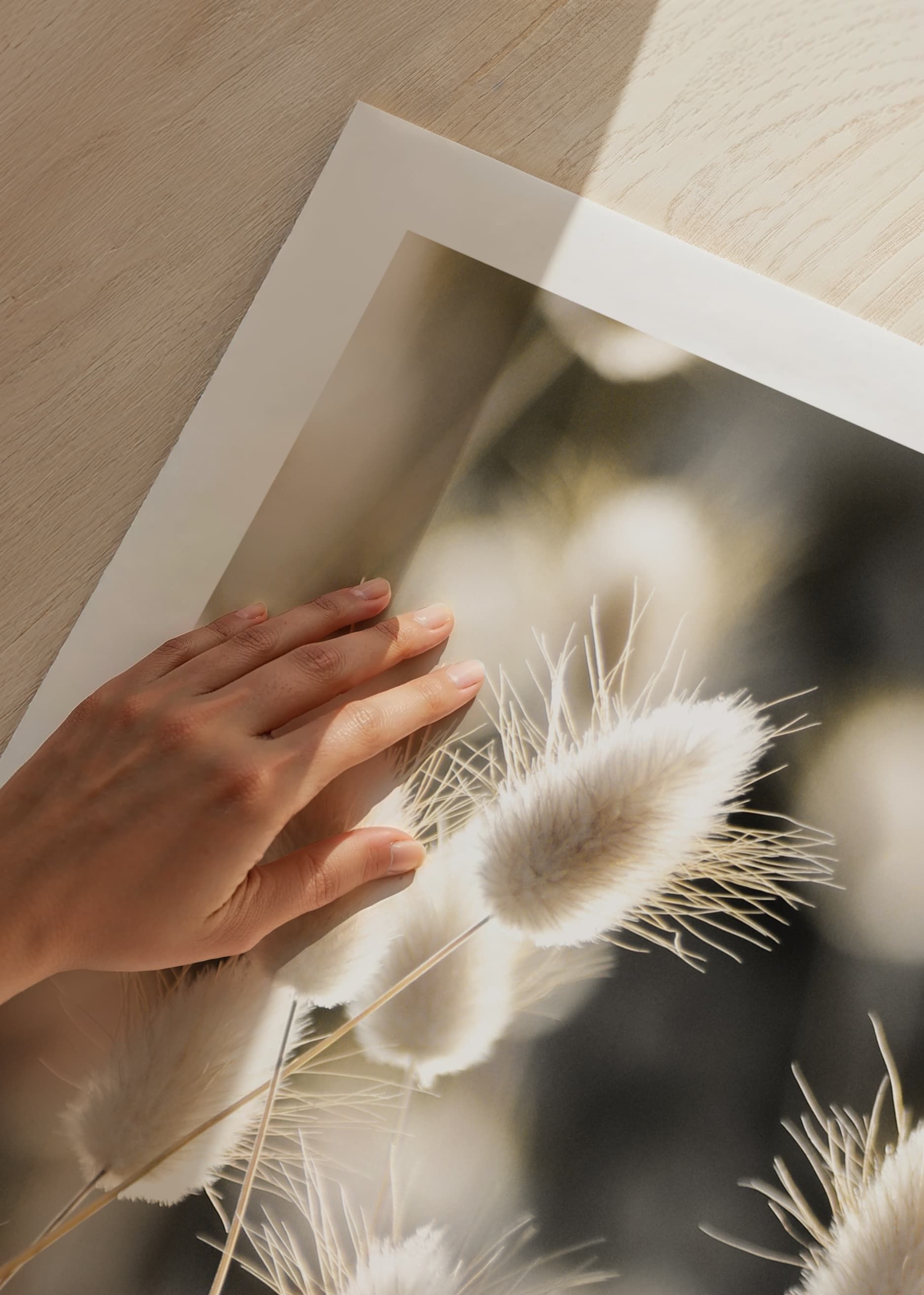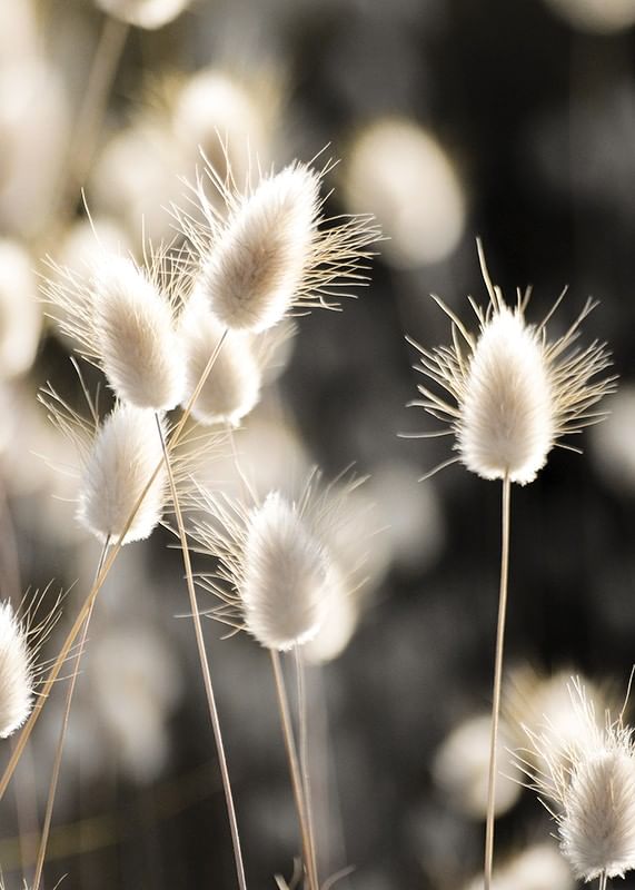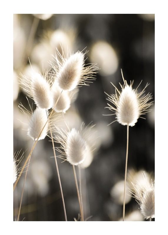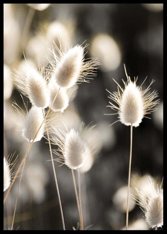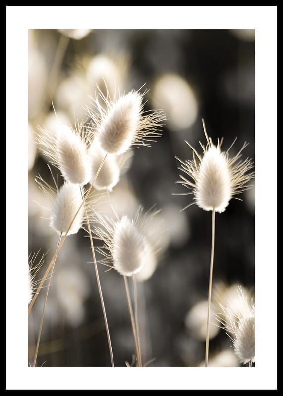 Mjuka vippor av borstgräs framhävs i ett varmt motljus där de ljusa stråna kontrasterar mot en suddig, mörk bakgrund. Naturliga beige och krämvita toner tillsammans med det minimalistiska uttrycket gör denna poster till ett fint inslag i vardagsrum, sovrum eller hall med fokus på lugn och natur.