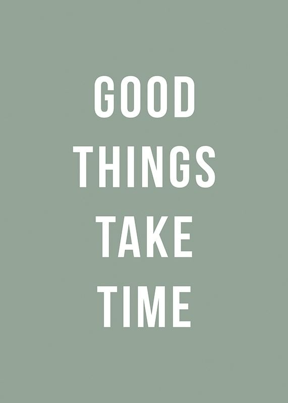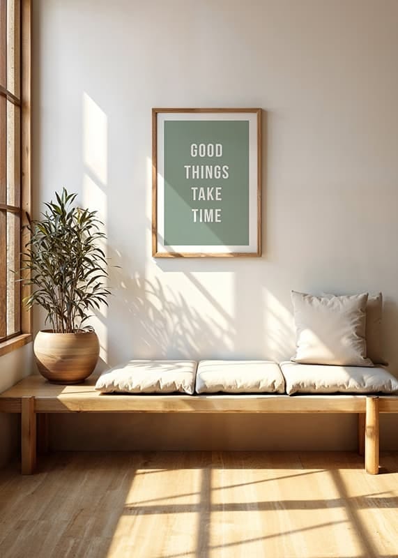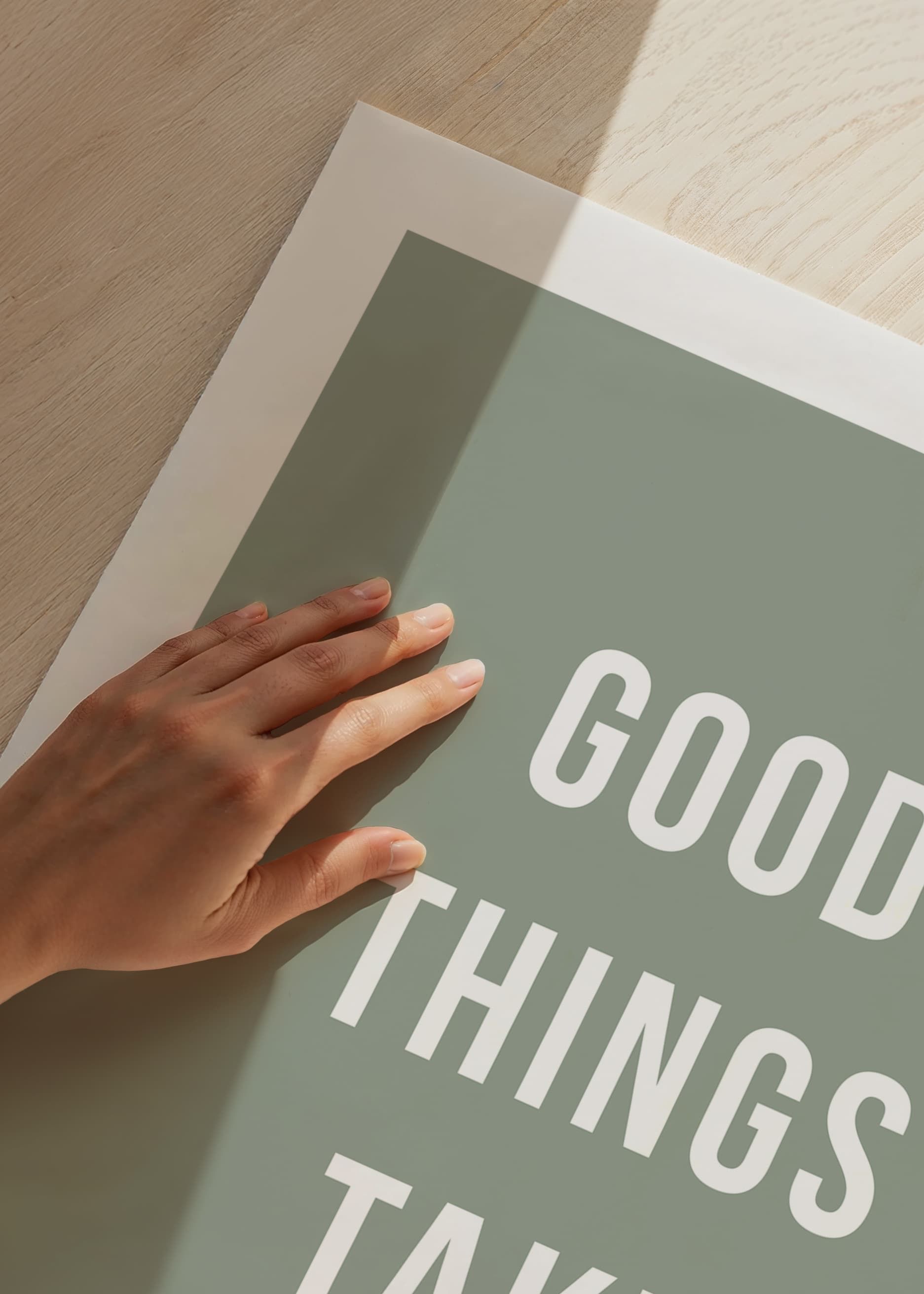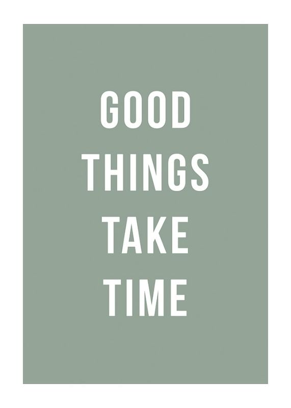 Stora versaler i vitt bildar citatet ”Good Things Take Time” mot en dovt grön bakgrund. Den rena layouten och den avskalade färgskalan ger ett lugnt intryck. Denna poster fungerar bra i hemmakontor, hall eller sovrum, där enkla motiv lyfter helheten och skapar en genomtänkt atmosfär i rummet.