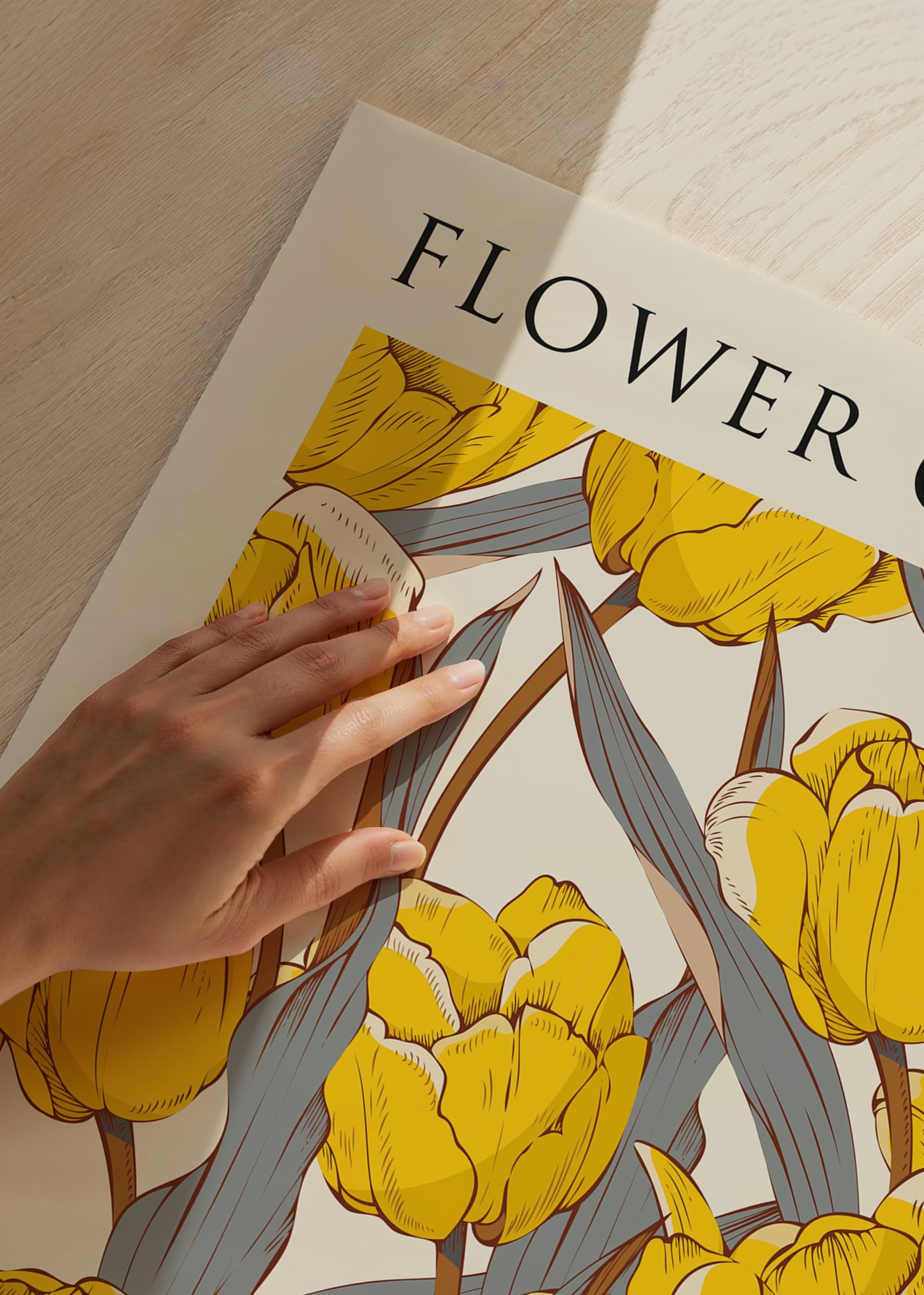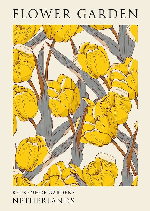 Gula tulpaner med grågröna blad täcker nästan hela ytan i ett tätt och dekorativt mönster. De handritade linjerna skapar en tydlig och grafisk känsla, medan de mjuka beige tonerna i bakgrunden ger ett lugnt intryck. Den här postern hämtar inspiration från Keukenhof Gardens och passar fint i både kök och vardagsrum.