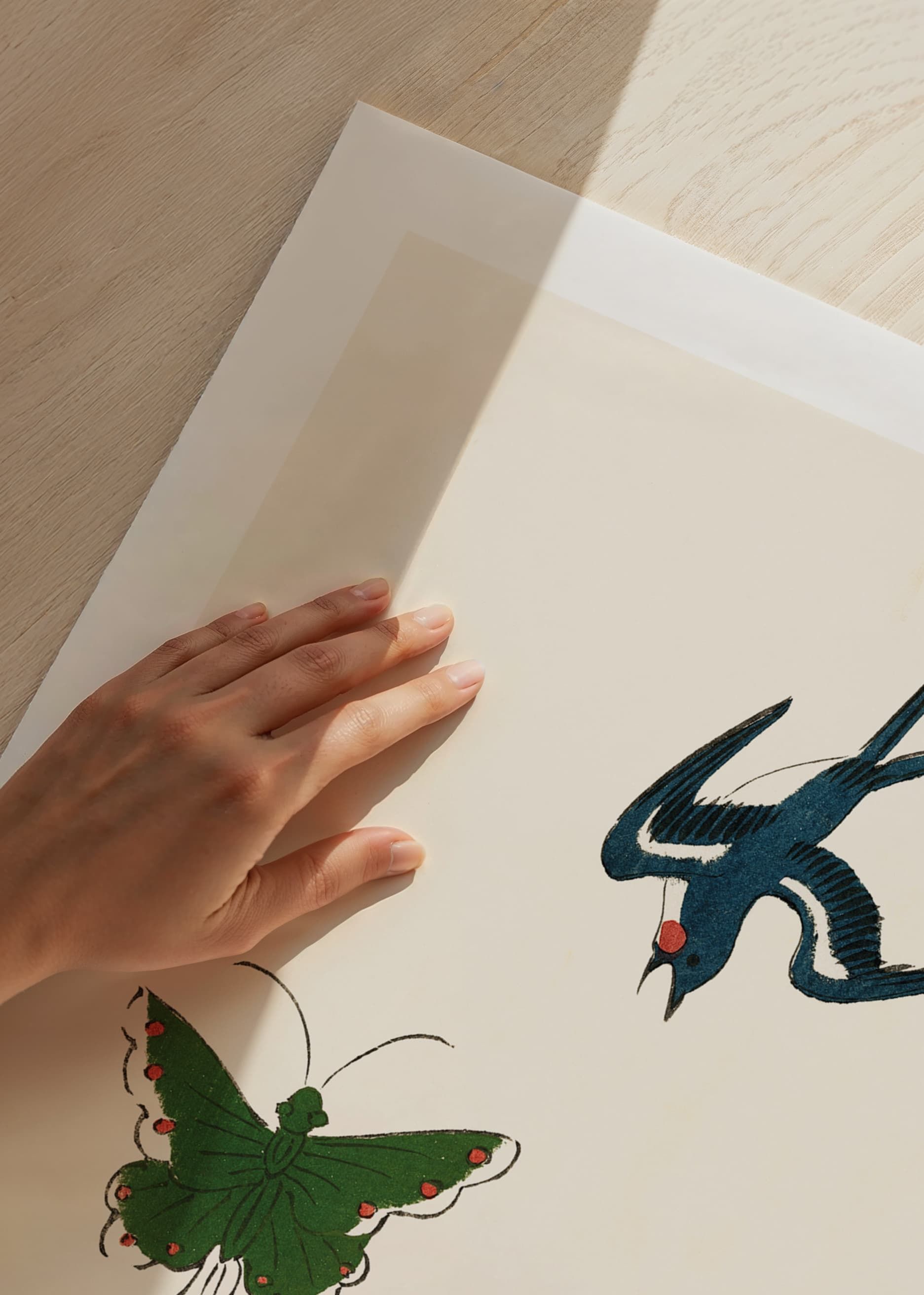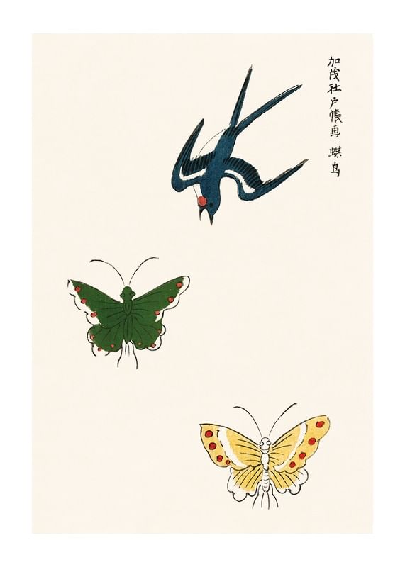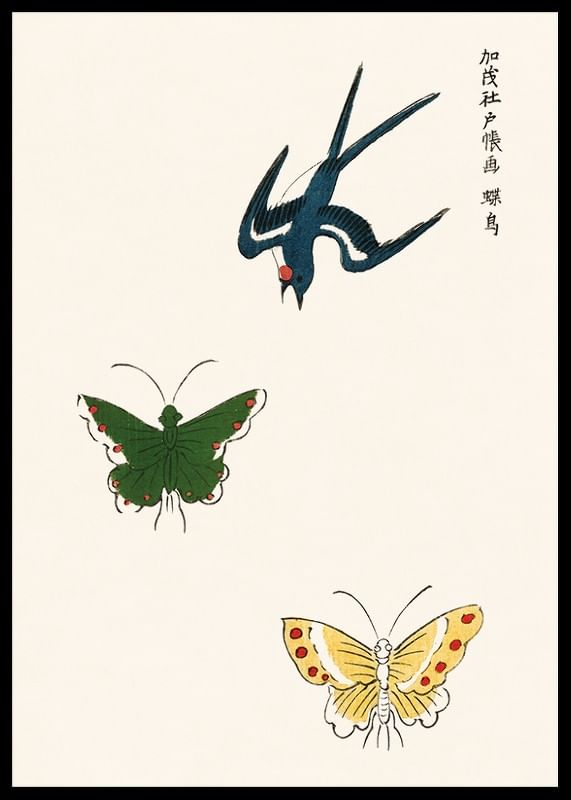 Motivet består av en svala med blå fjäderdräkt och röd detalj som svävar ovan två fjärilar, en i mörkgrönt och en i blekgult med röda prickar. Den avskalade kompositionen på ljus bakgrund ger ett luftigt intryck. Traditionellt japanskt träblockstryck av Taguchi Tomoki – en poster som tillför subtil elegans till hemmet.