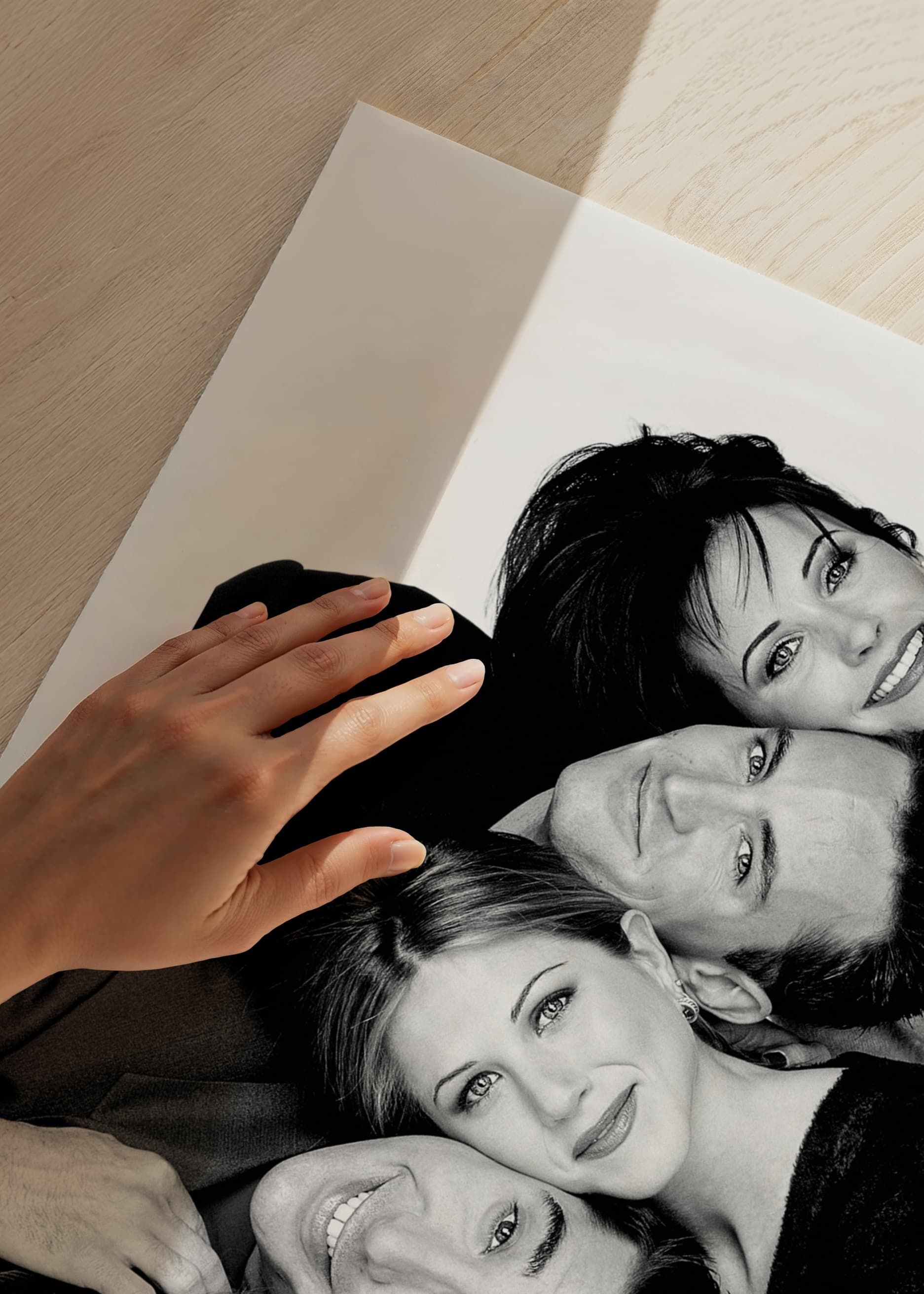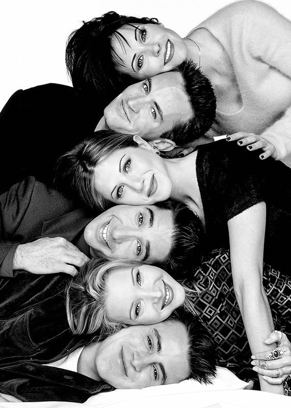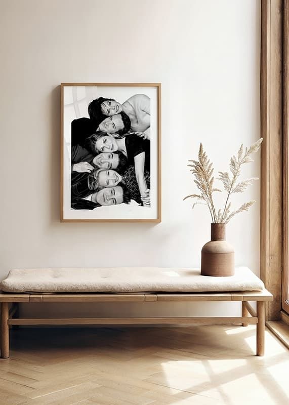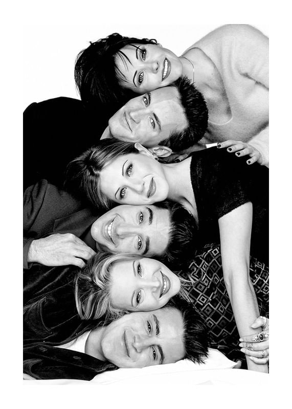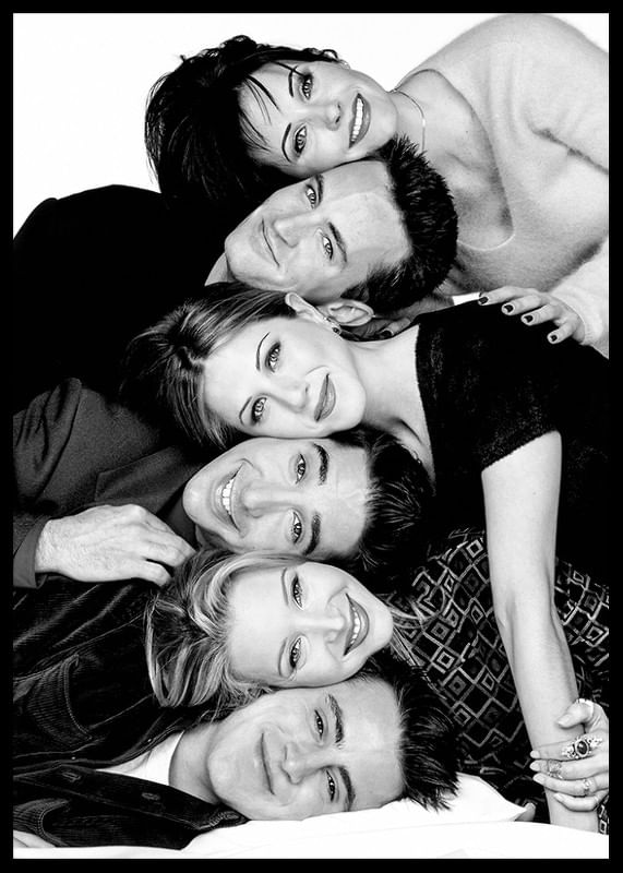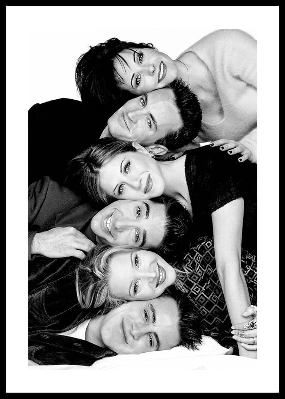 Poster med ett svartvitt fotografi på skådespelarna från tv-serien Vänner. Courtney Cox som Monica Geller, Matthew Perry som Chandler Bing, Jennifer Aniston som Rachel Green, David Schwimmer som Ross Geller, Lisa Kudrow som Phoebe Buffay och Matt LeBlanc som Joey Tribbiani. Detta fotografi tillhör vår kollektion ikoniska fotografier på kändisar.