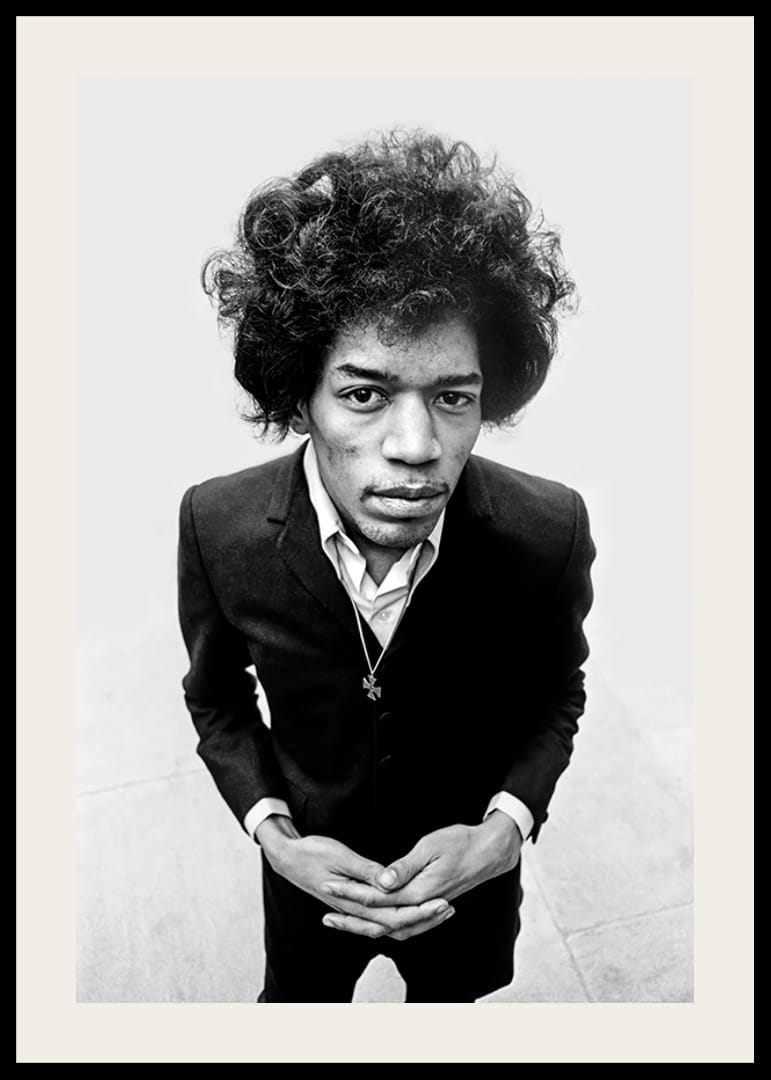 Poster med ett svartvitt fotografi på Jimi Hendrix (1942-1970) från år 1968. Jimi Hendrix var en av rockmusikens mest stilbildande gitarrister. Fotot har en gammal och kornig struktur som ger bilden en tidsenlig vintage look. Detta vintage fotografi tillhör vår kollektion ikoniska fotografier på kändisar.