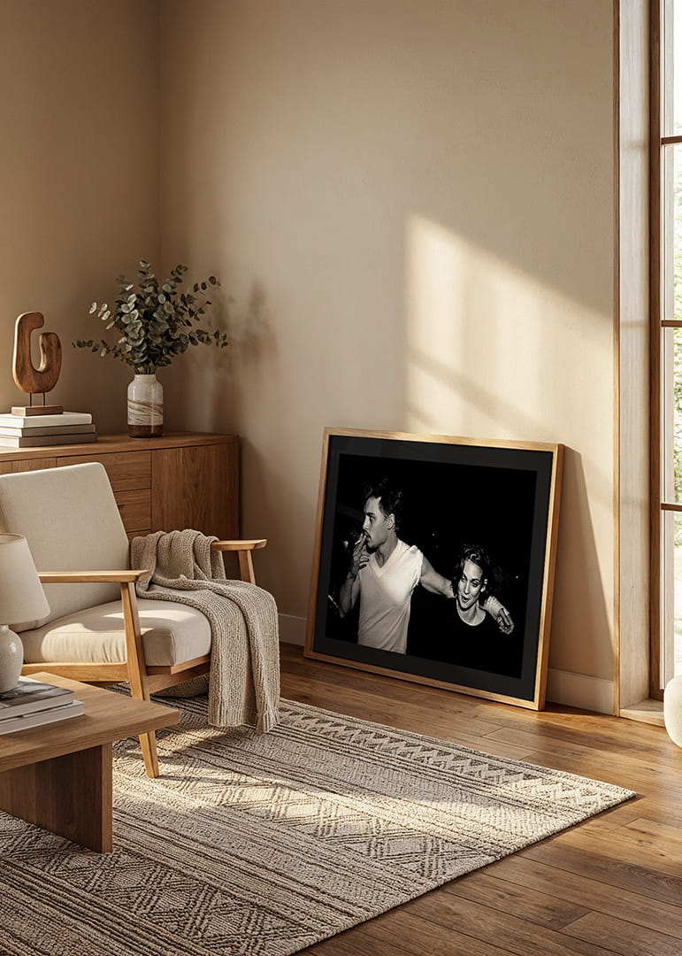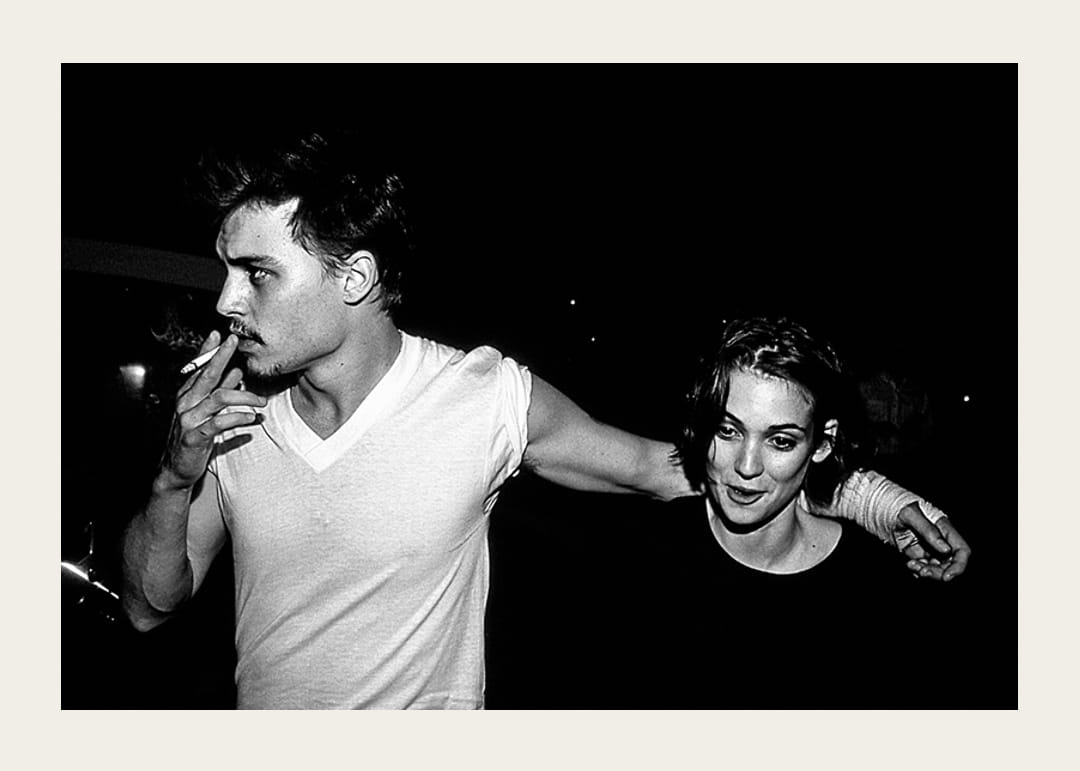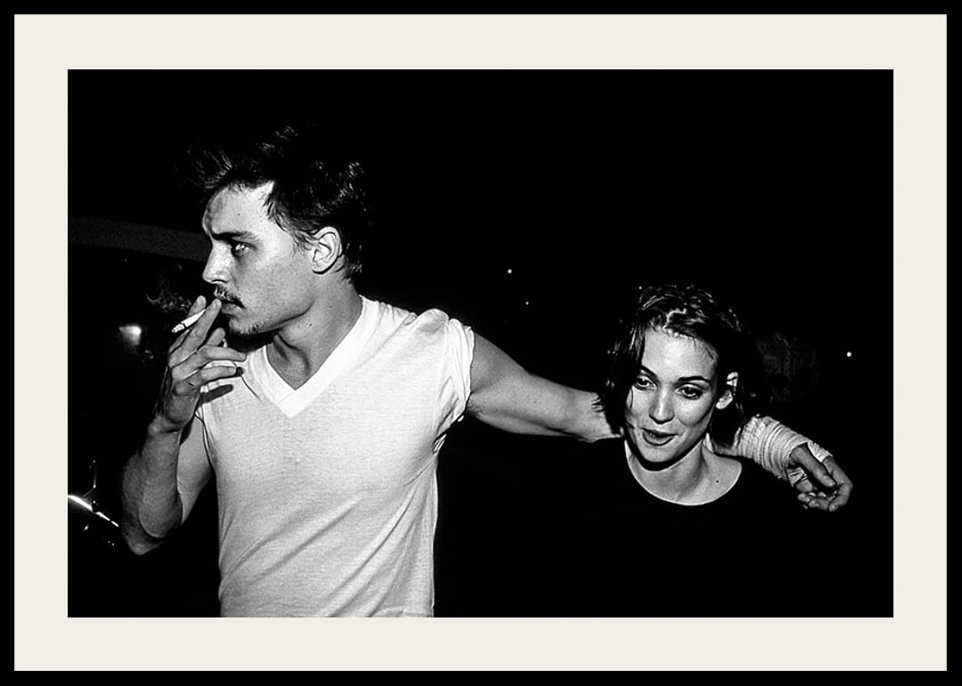 Poster med ett svartvitt fotografi på skådespelarna Johnny Depp och Winona Ryder år 1990. Fotot har en gammal och kornig struktur som ger bilden en tidsenlig vintage look. Detta fotografi tillhör vår kollektion ikoniska fotografier på kändisar.