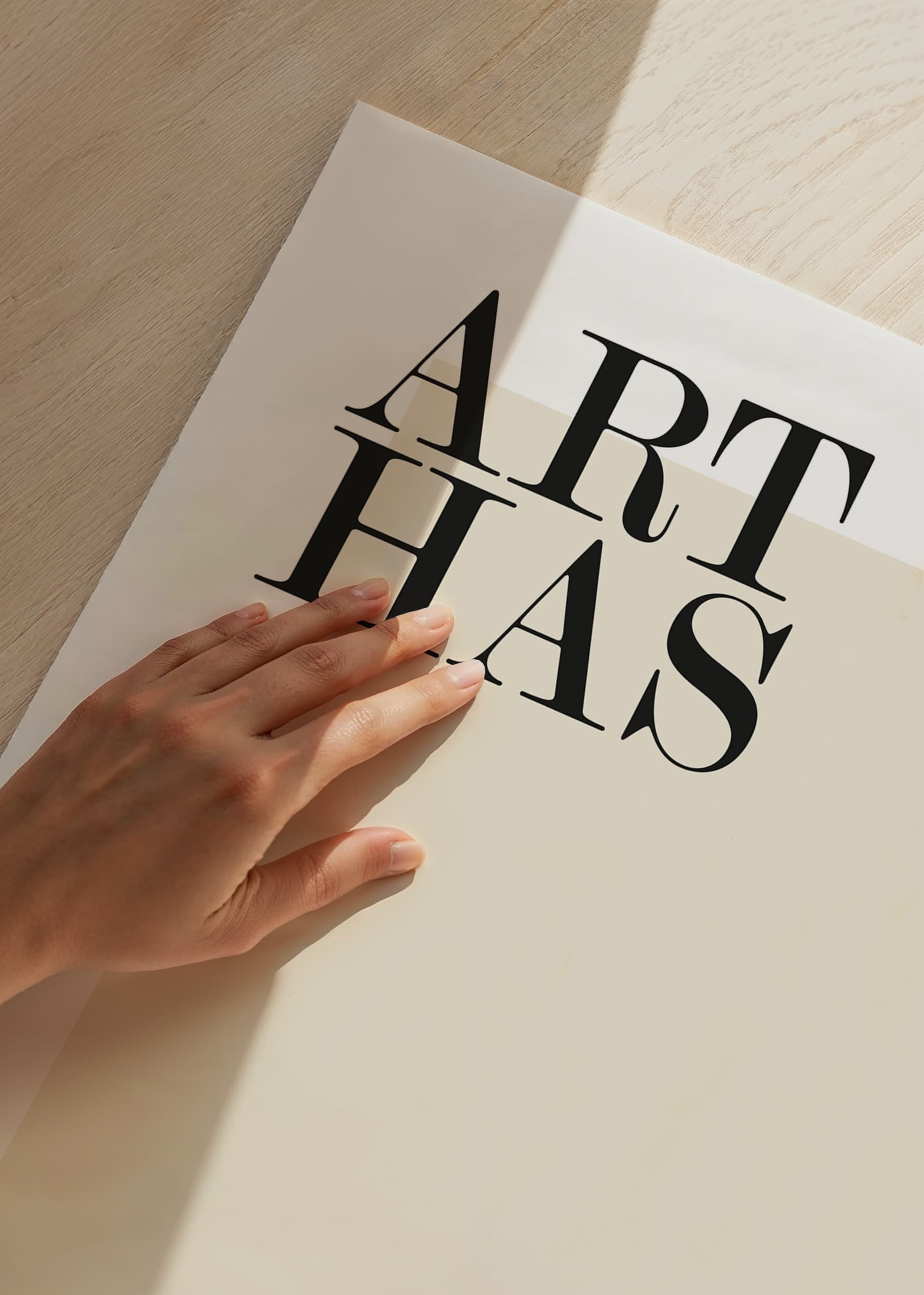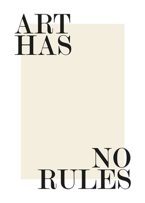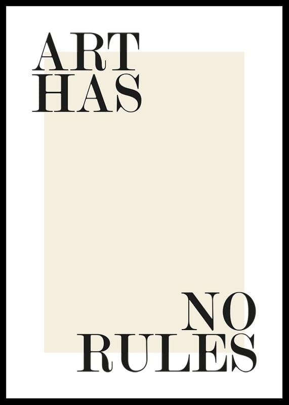 Stora svarta bokstäver bildar texten 'Art has no rules' på ett ljust beige rektangulärt fält mot vit bakgrund. Den grafiska formgivningen är ren och modern med lekfull placering av orden. Denna poster ger en tydlig och stilren accent och passar som inspiration i kreativa miljöer eller hemmakontor.