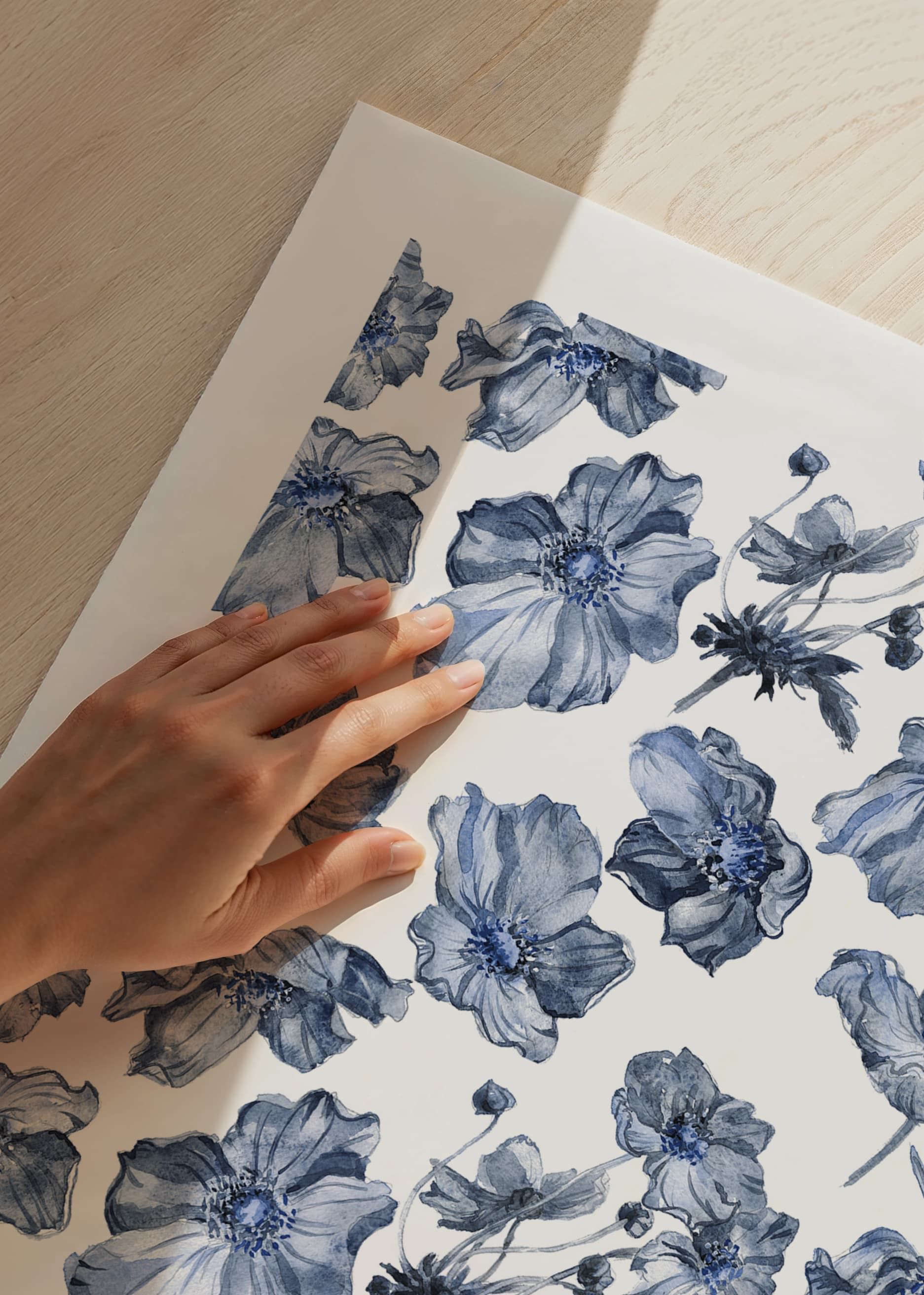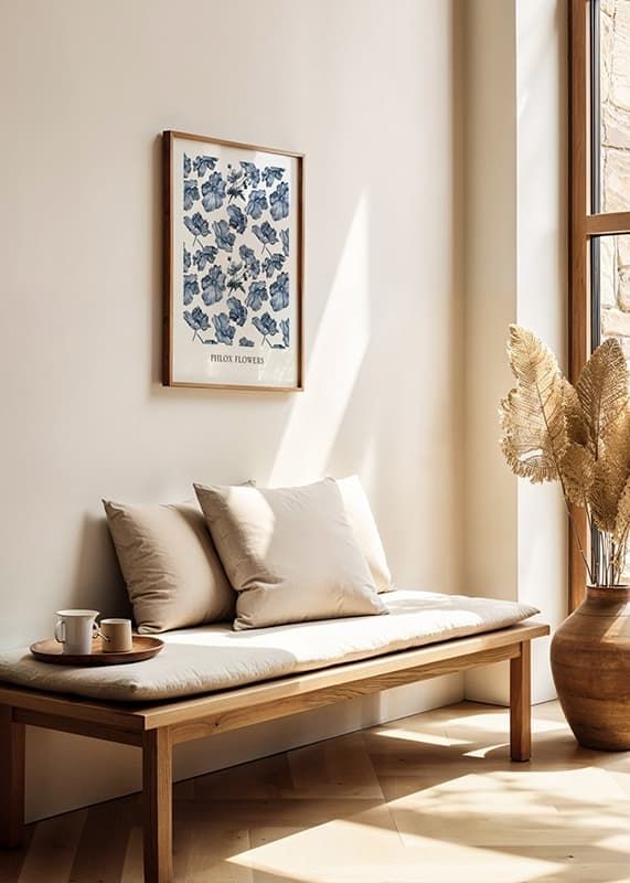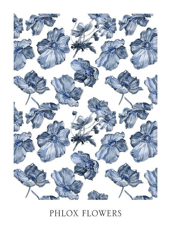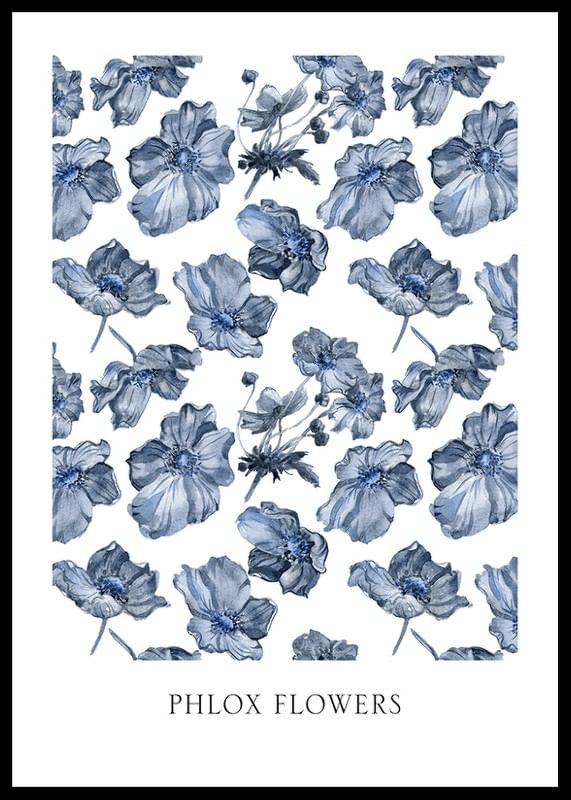 Blå phloxblommor återges i en upprepande akvarellstil mot vit bakgrund. Motivet skapar ett luftigt intryck med blommor ordnade i olika vinklar och storlekar. Den svala färgskalan bidrar till en stilren känsla. En poster som ger en diskret botanisk accent och passar utmärkt i såväl vardagsrum som sovrum.