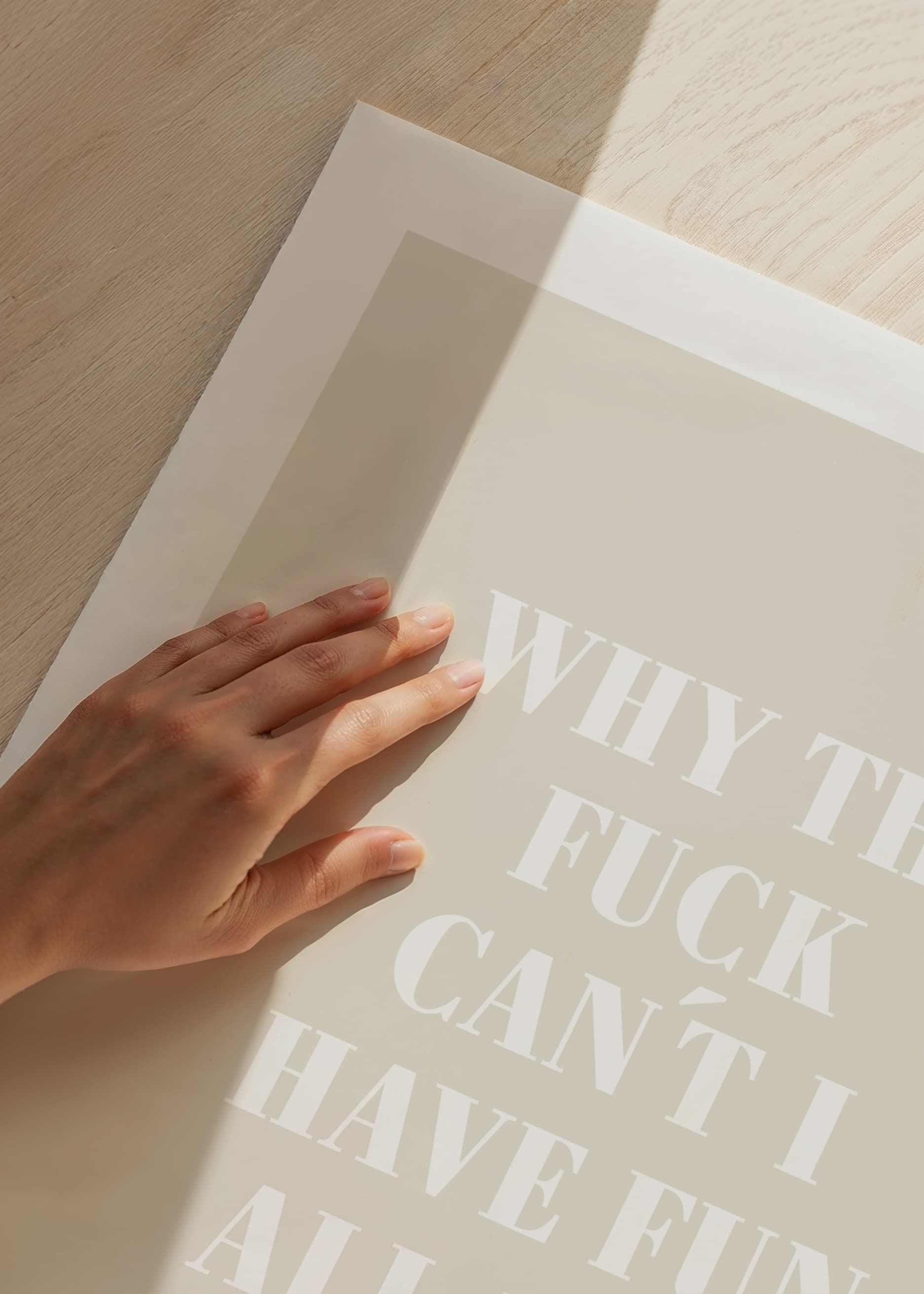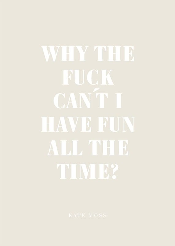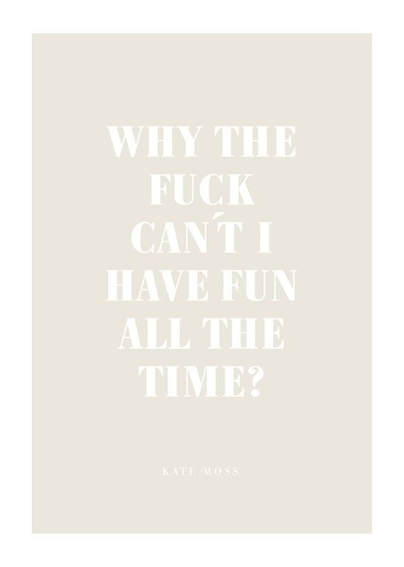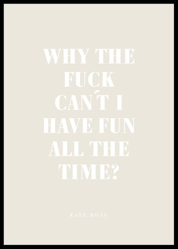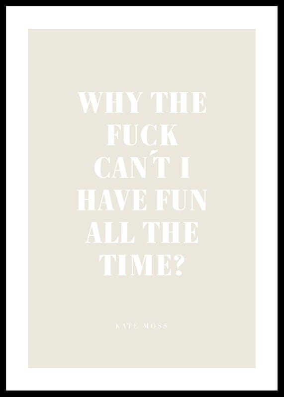 Stora versaler i vitt utgör citatet “Why the fuck can't I have fun all the time?” centrerat mot en sandfärgad, enfärgad bakgrund. Längst ner står namnet Kate Moss i små bokstäver. Den stilrena och minimalistiska formgivningen gör att denna poster blir ett uttrycksfullt inslag i hemmet eller på kontoret.