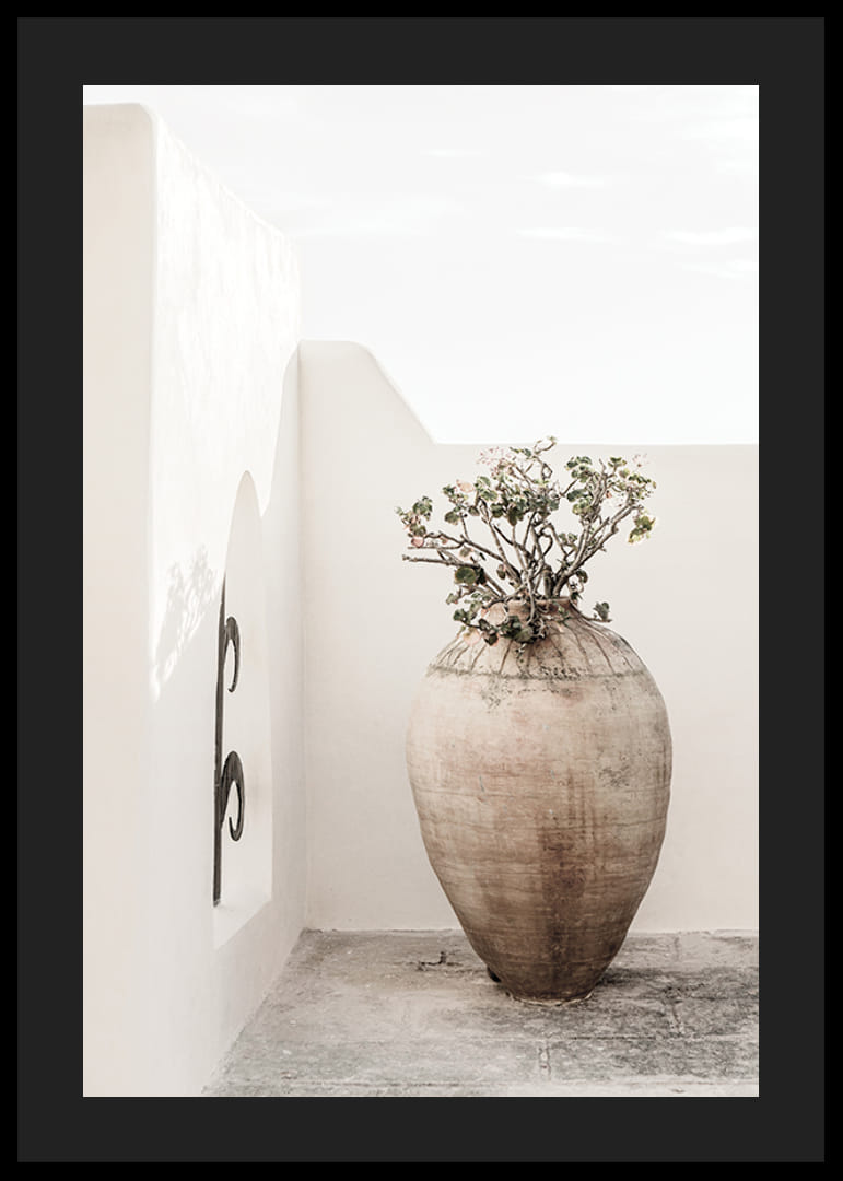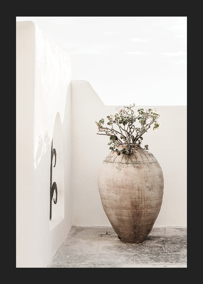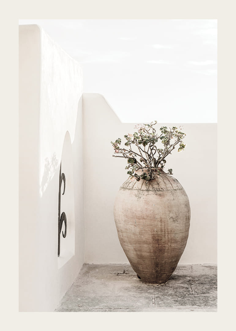 Motivet består av en hög, handgjord lerkruka med blommor placerad i ett hörn mot vita, putsade väggar. I krukan växer en grön växt med sparsamma, små blad. Den ljusa färgskalan och det naturliga ljuset ger denna poster en tidlös och avskalad känsla, perfekt för lugna inredningar.