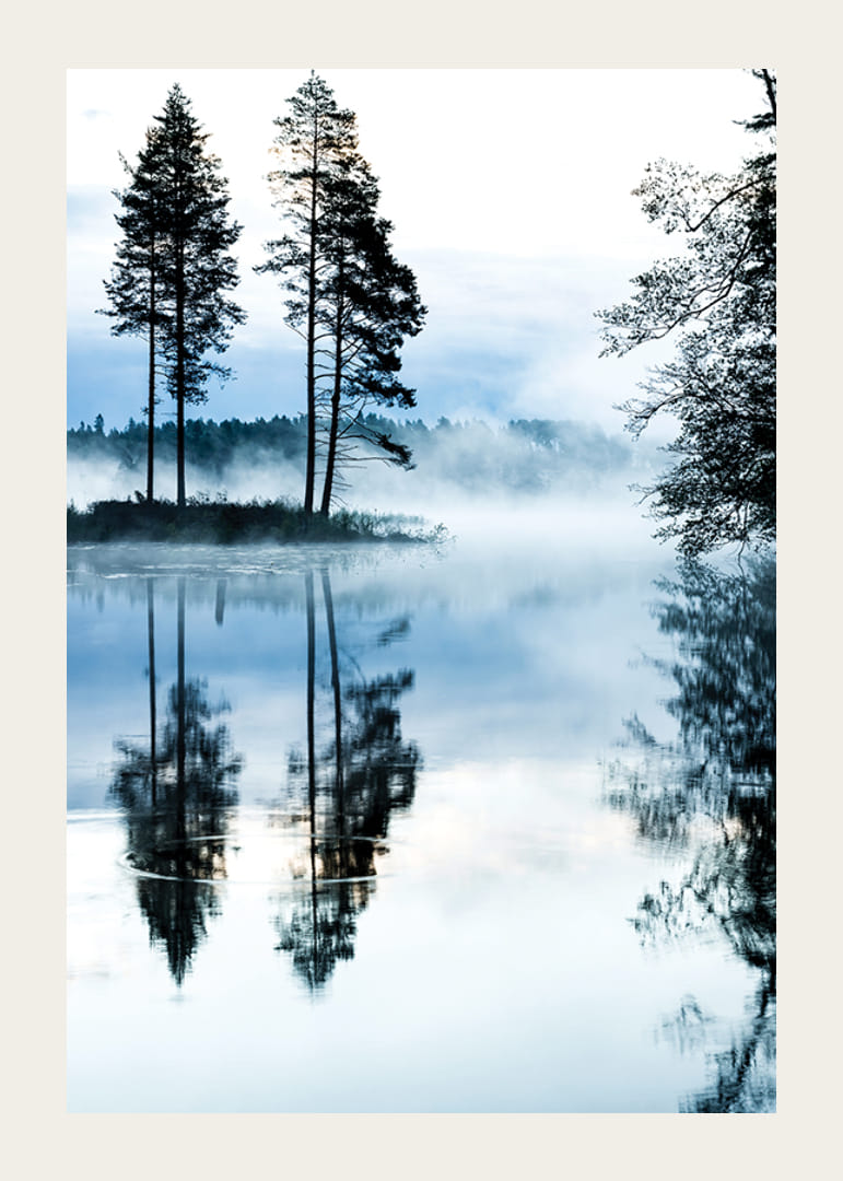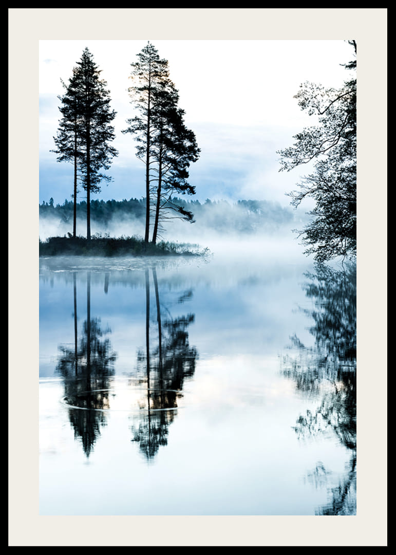Tre höga tallar står på en liten udde som skjuter ut i en stilla sjö. Vattnet är spegelblankt och reflekterar trädstammarna tydligt, medan dimma sveper in horisonten och skapar ett mjukt intryck. Blå och vita toner dominerar motivet. Denna poster lyfter fram lugnet i nordisk natur och passar i hem där naturkänsla önskas.