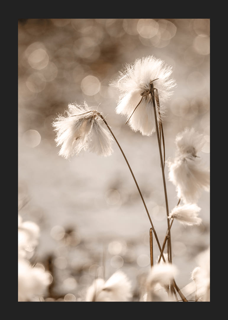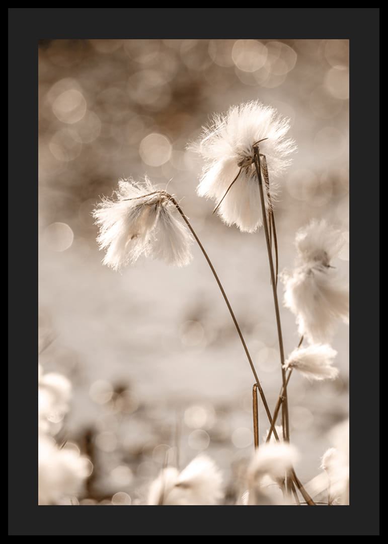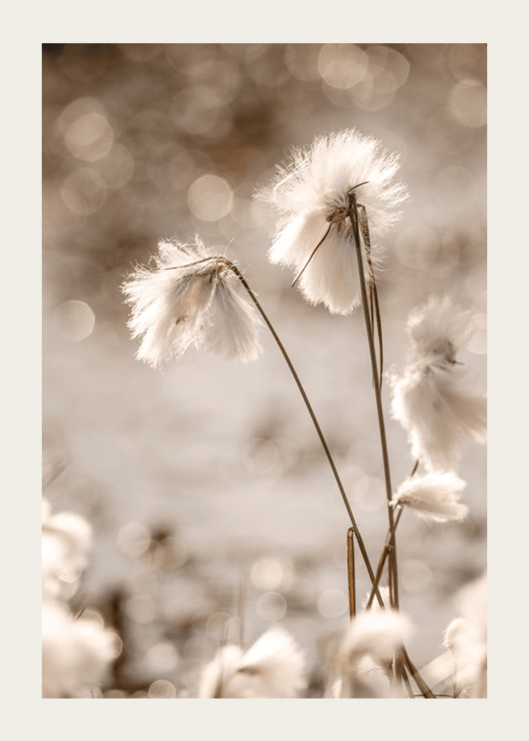 Närbild av bomullsgräs med ljusa, fluffiga vippor som vajar i vinden mot en mjukt suddig bakgrund i varma, dämpade beige toner. Den avskalade kompositionen lyfter fram växtens textur och skapar en lugn och naturlig känsla. En poster som tillför subtil höstkänsla och passar i både vardagsrum och sovrum.