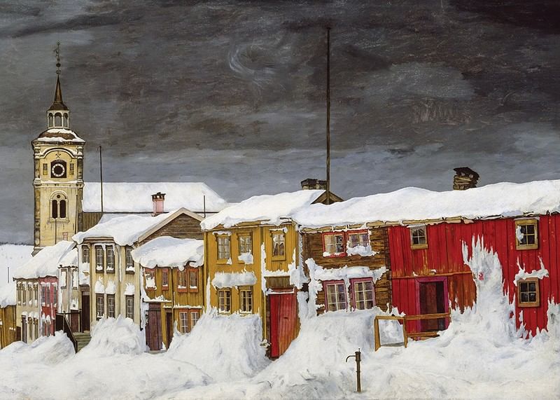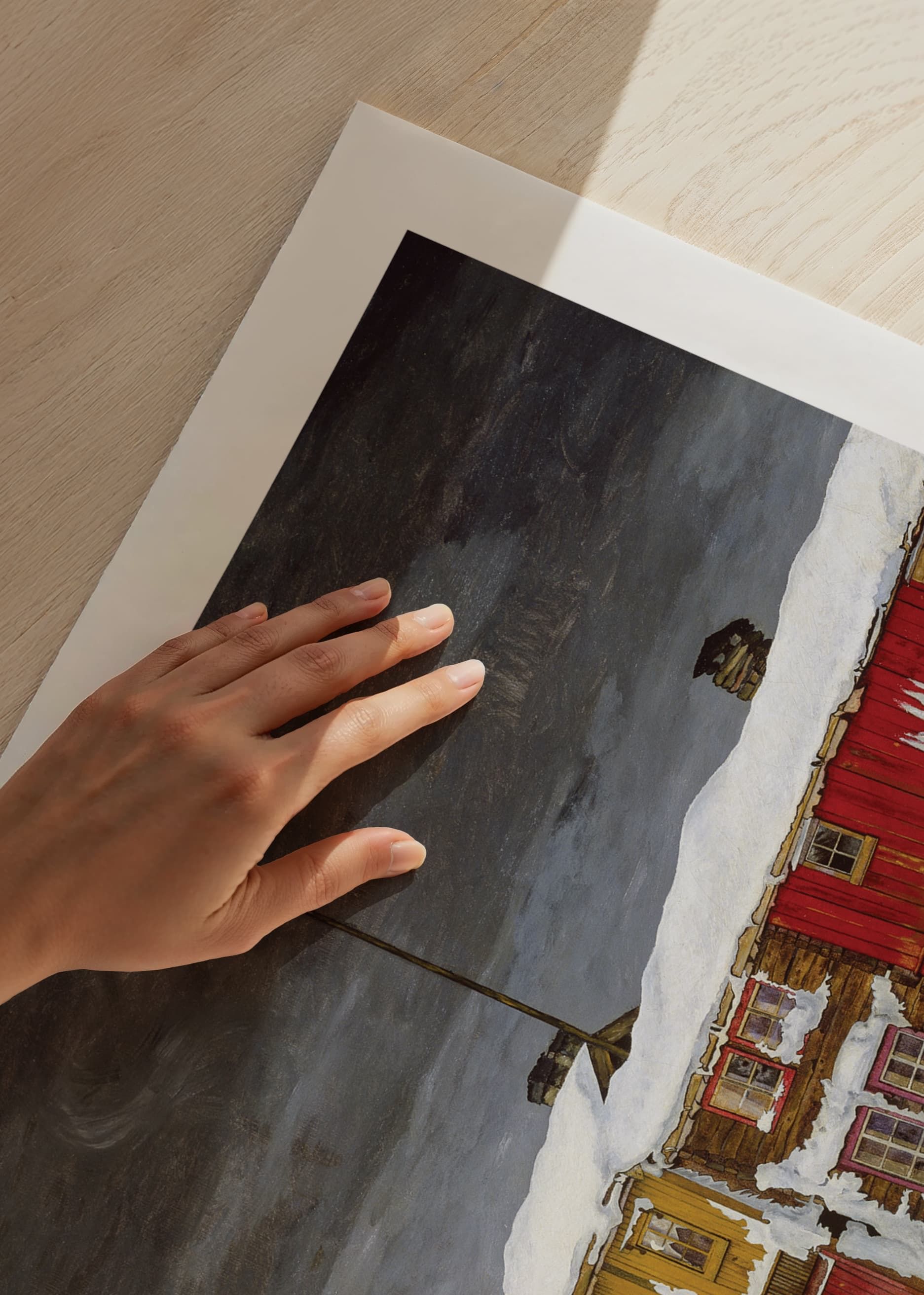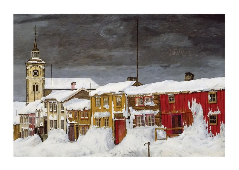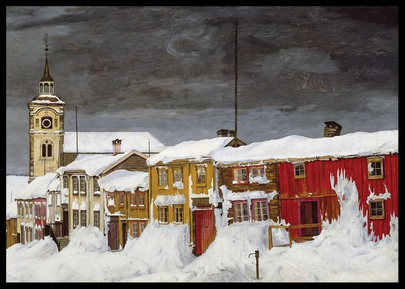 Poster med målningen "Gate i Røros" av den norske konstnären Harald Sohlberg från år 1903. Røros är en av de kallaste orterna i Norge, belägen 600 meter över havet och får om vintrarna rikligt med natursnö. Harald Sohlberg var en norsk nyromantisk bildkonstnär. Han finns representerad vid bland annat Nationalmuseum i Stockholm.