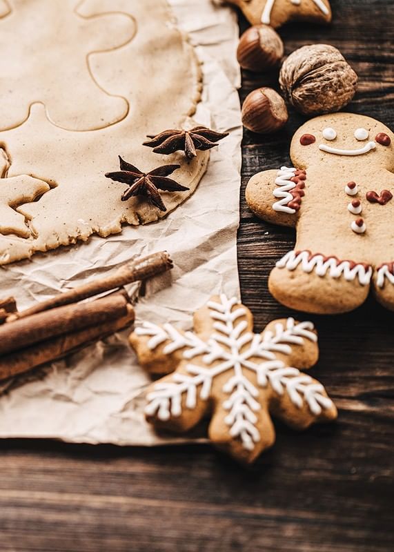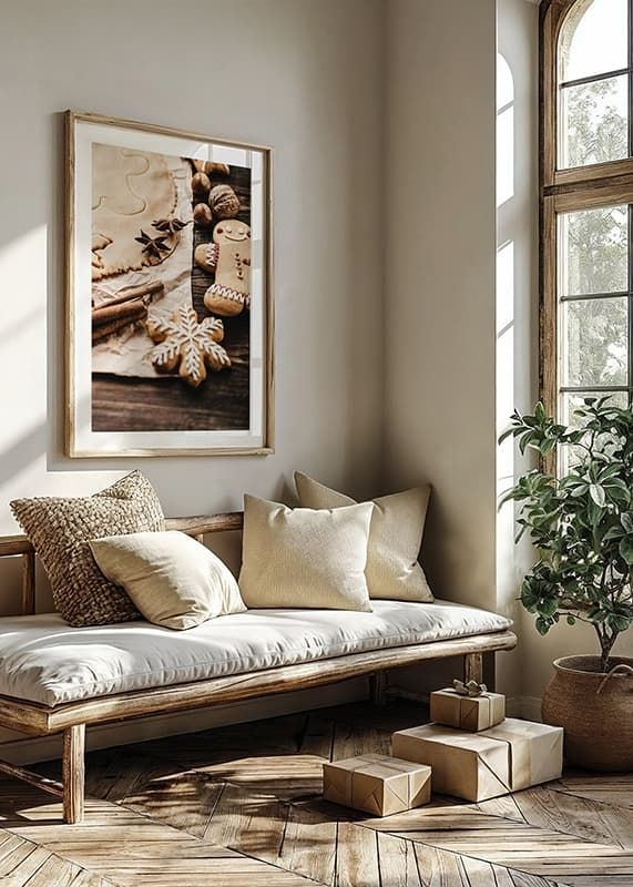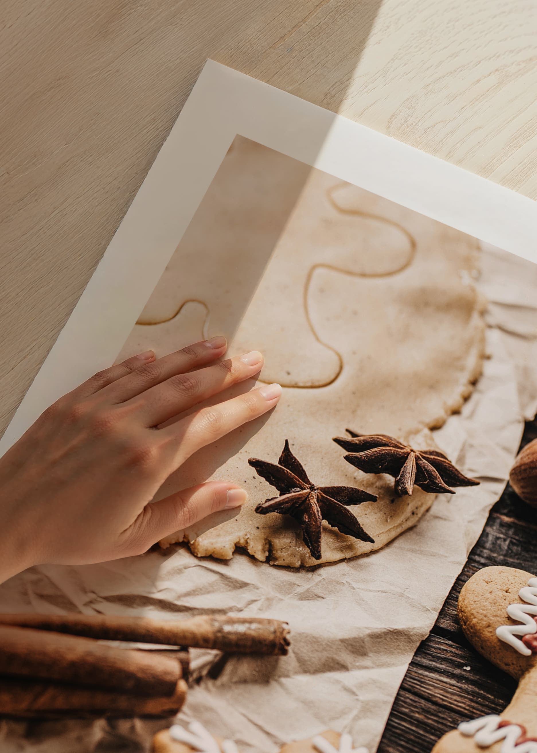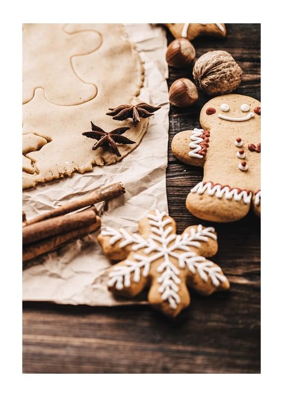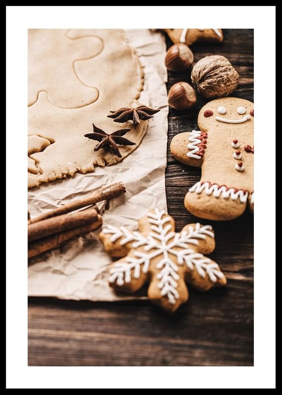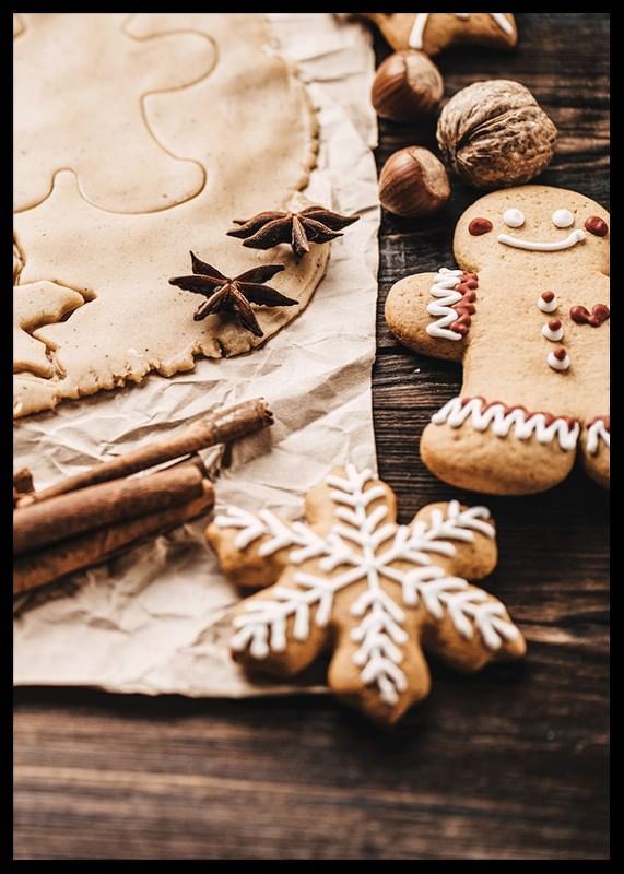 Pepparkaksdeg utrullad på bakplåtspapper omges av vackert dekorerade kakor i form av en snögubbe och en snöflinga. Stjärnanis, kanelstänger, hasselnötter och valnötter ligger runtom på ett rustikt träbord. Denna poster ger köket eller vardagsrummet en klassisk känsla av julbak och tradition.