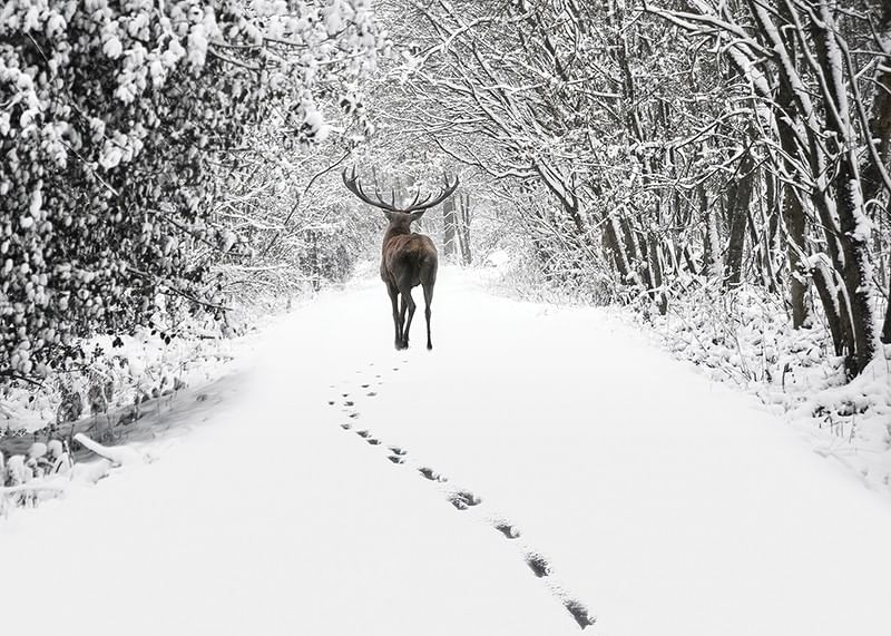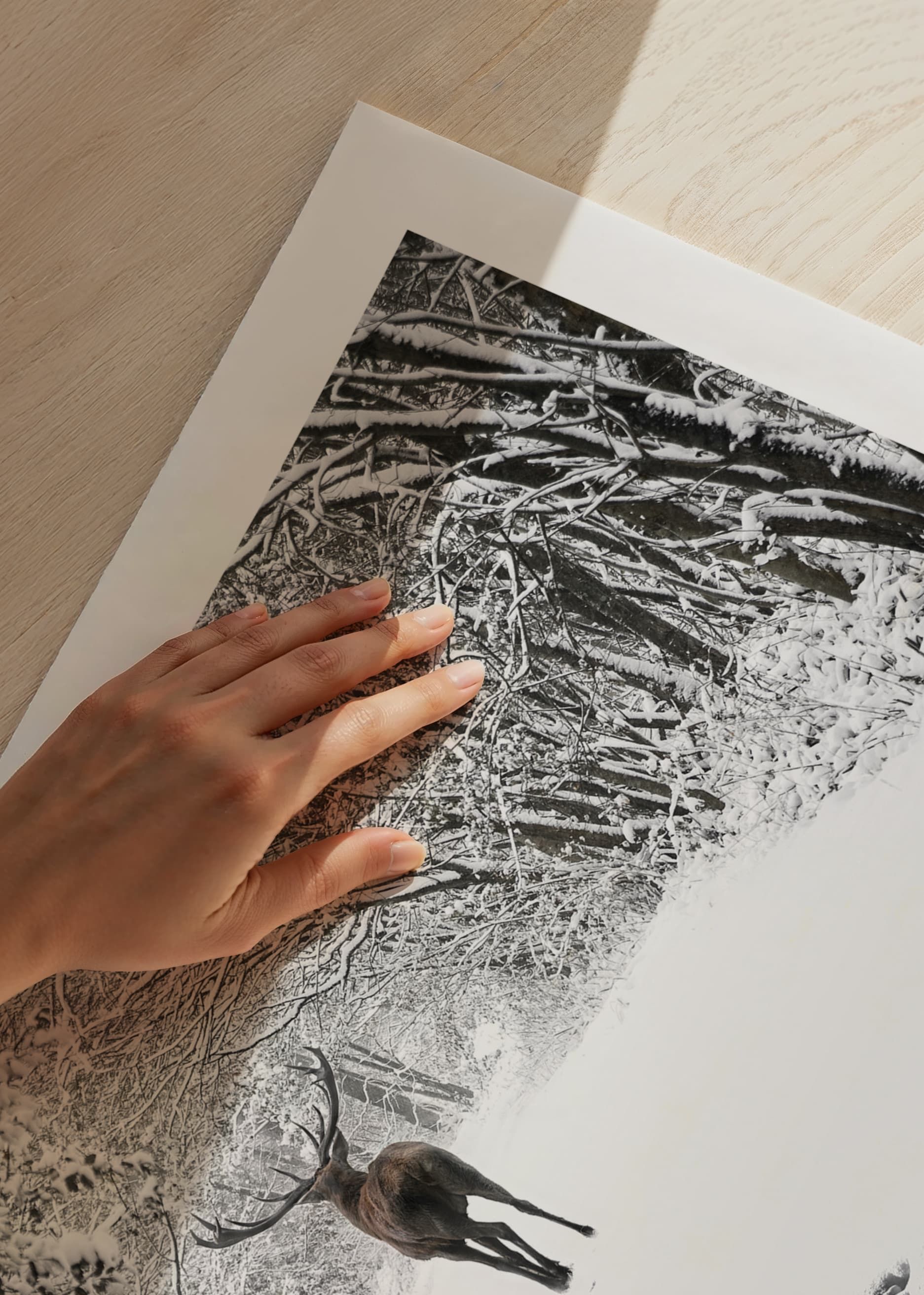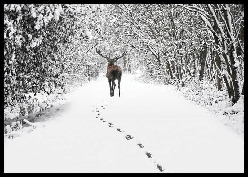 En hjort med stora horn ses vandra bort längs en snötäckt väg, omgiven av snötyngda träd och buskar som ramar in motivet. Fotspår i snön leder in i bilden och ger djup åt kompositionen. Den vintriga och lugna stämningen gör denna poster till ett intressant val för vardagsrum eller hall.