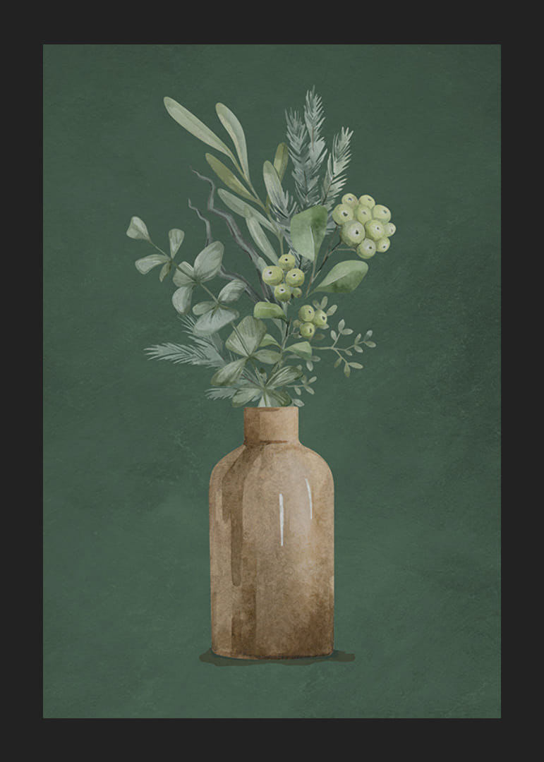 Bruna vas med vintergröna kvistar, bland annat grankvistar och olivblad, står mot en djupgrön bakgrund med målad textur. Milda gröna och bruna toner tillsammans med enkla former ger motivet ett stilrent uttryck. Denna poster passar i många rum där naturens stillhet och enkelhet får ta plats.