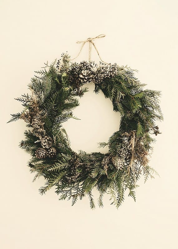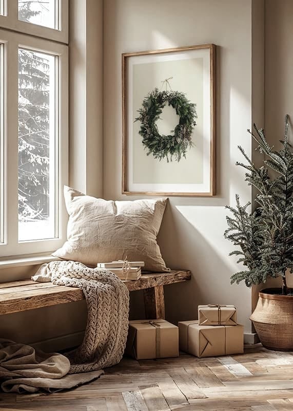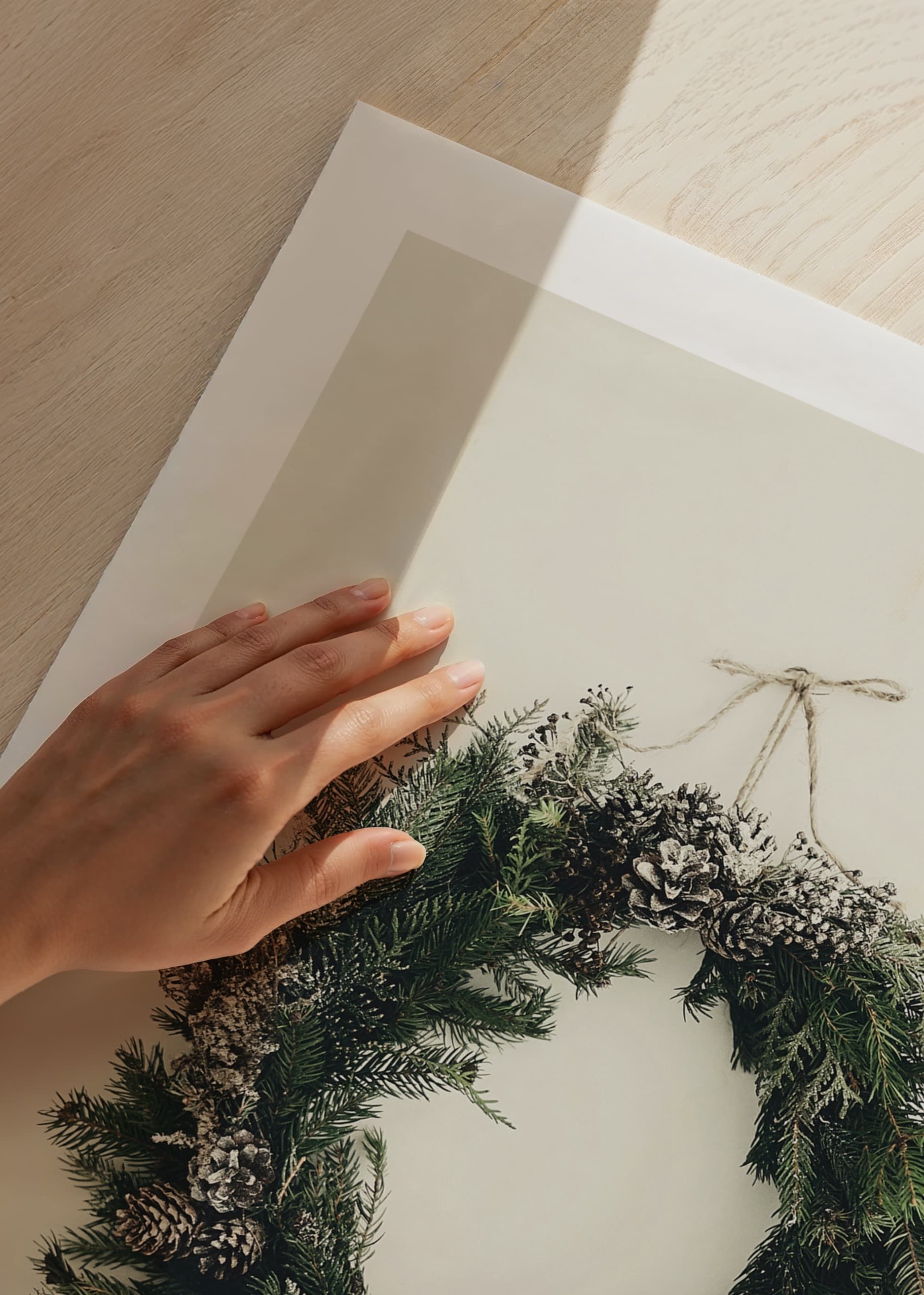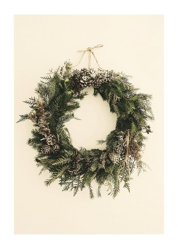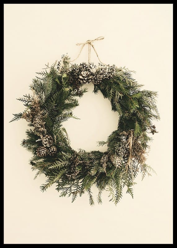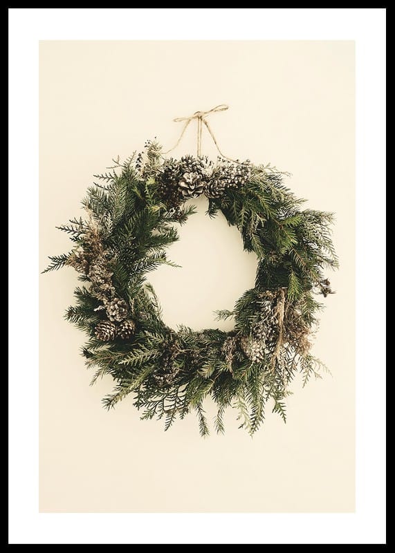 En vintergrön krans av granris dekorerad med kottar och ett ljus täcke av konstsnö hänger mot en varm sandfärgad bakgrund. Naturliga gröna och bruna nyanser förstärker motivets vintriga känsla. Denna poster passar utmärkt i rum där en subtil julstämning önskas året runt.