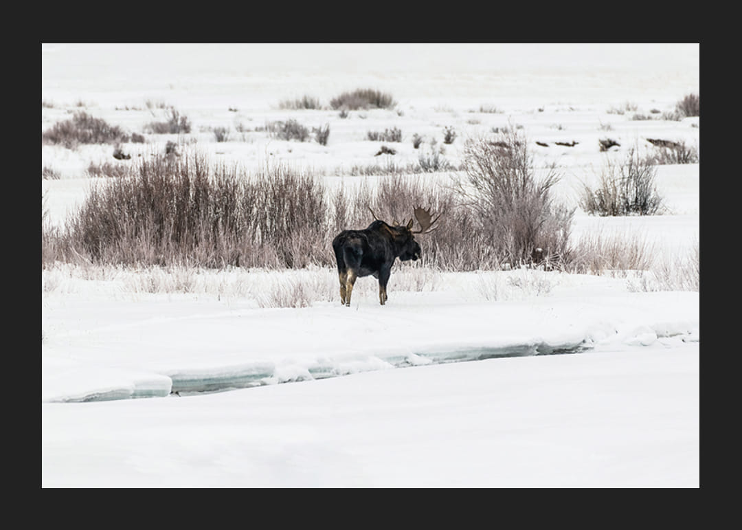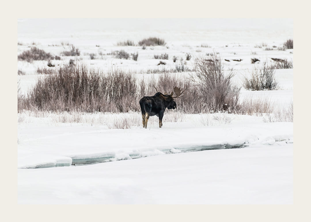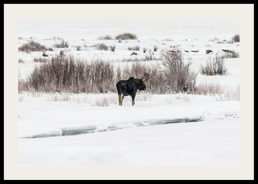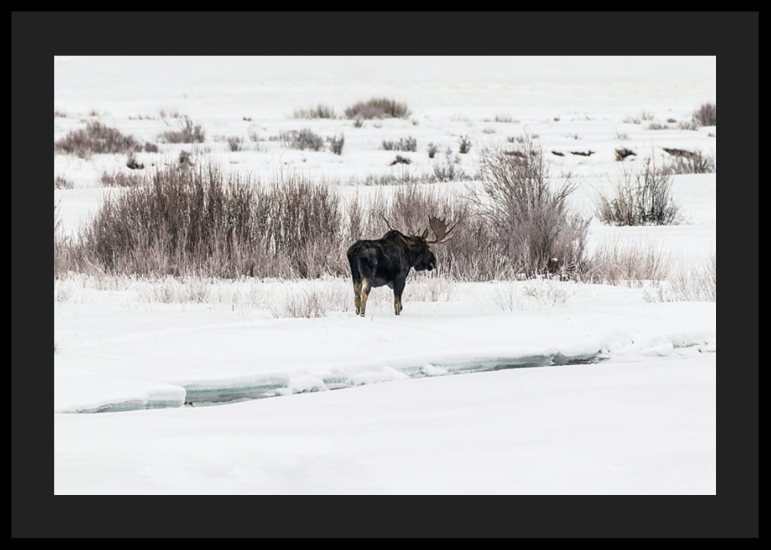 En ensam älg står vid en snötäckt bäck omgiven av vintriga buskar och öppna vita fält. Kontrasterna mellan älgens mörka päls och det ljusa, nästan monokroma landskapet ger en stillsam och naturlig känsla. Denna poster passar till exempel i vardagsrum eller hall för dig som uppskattar djurmotiv och vinterns lugna atmosfär.
