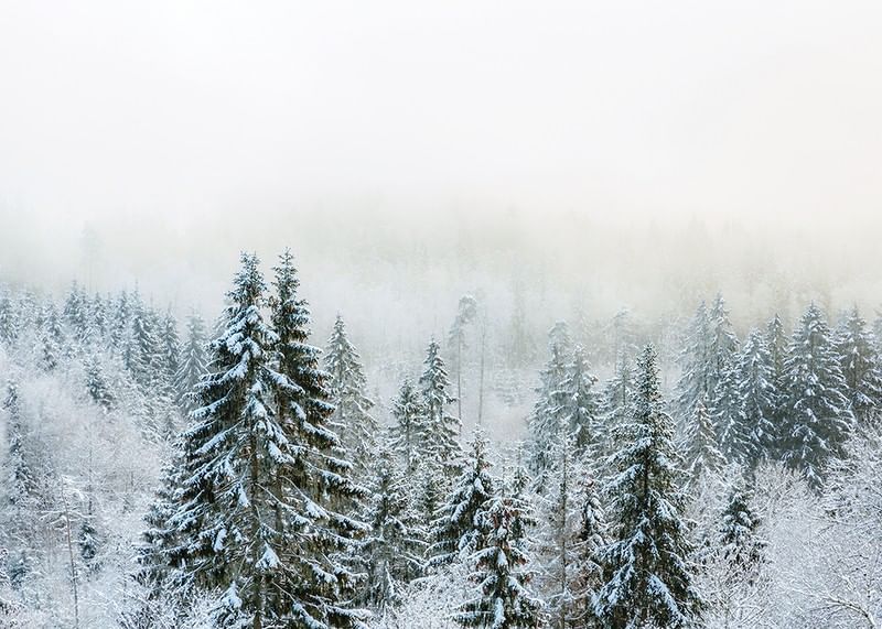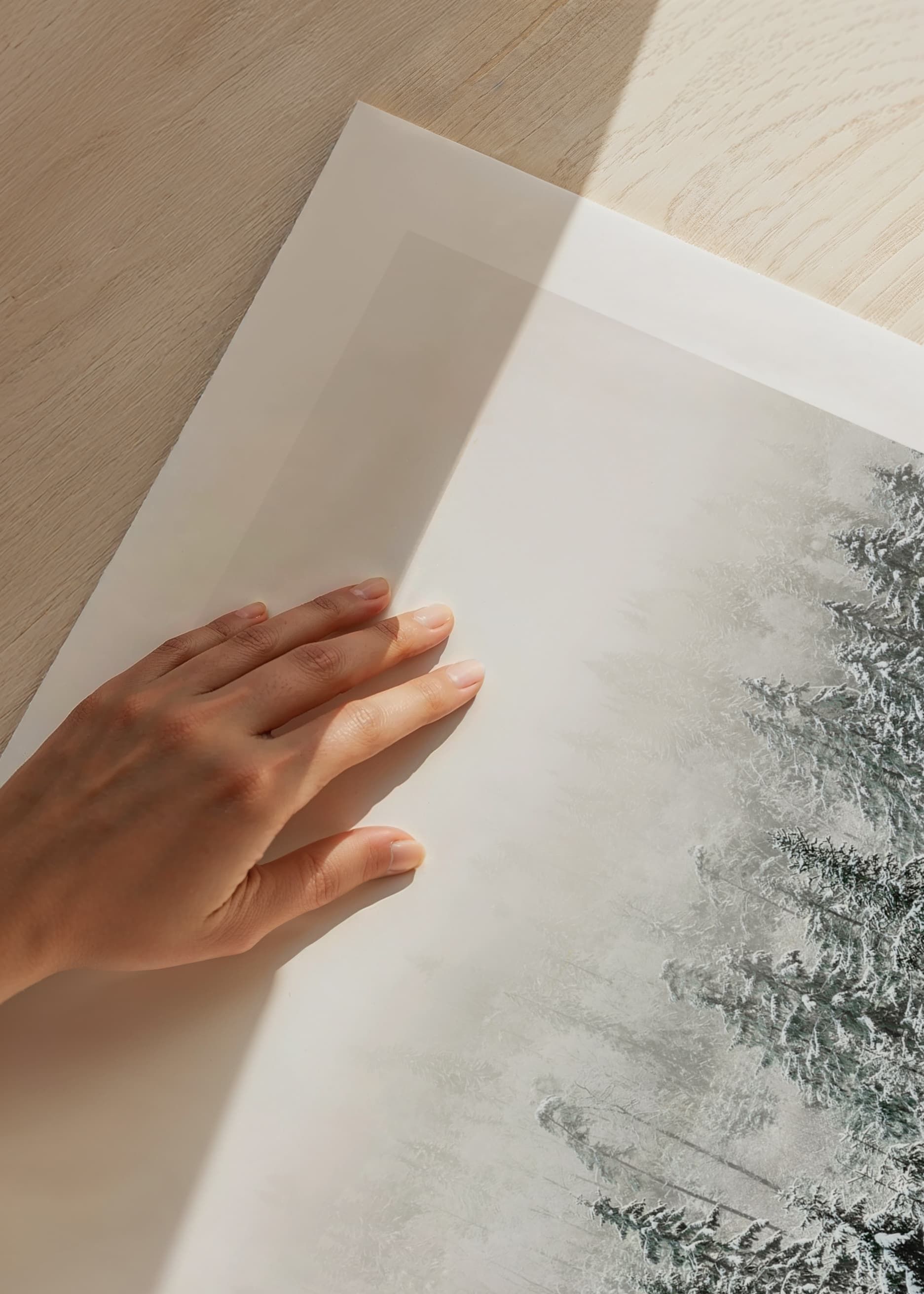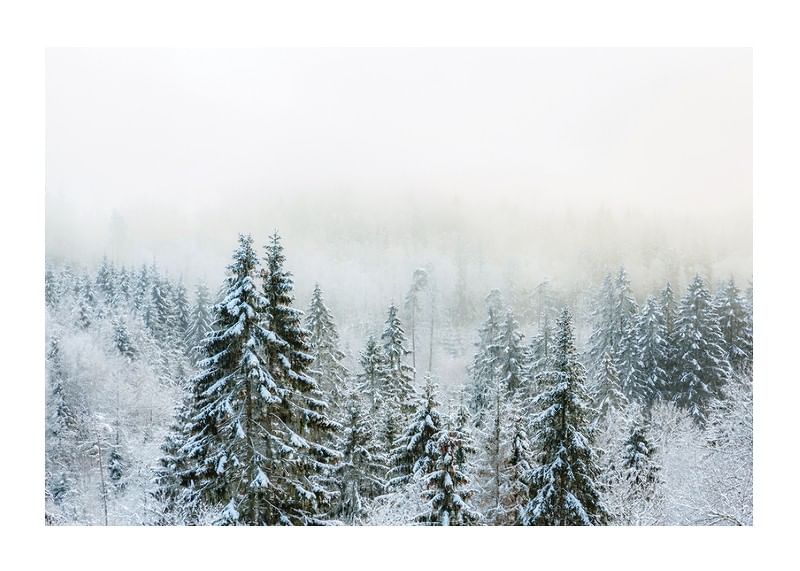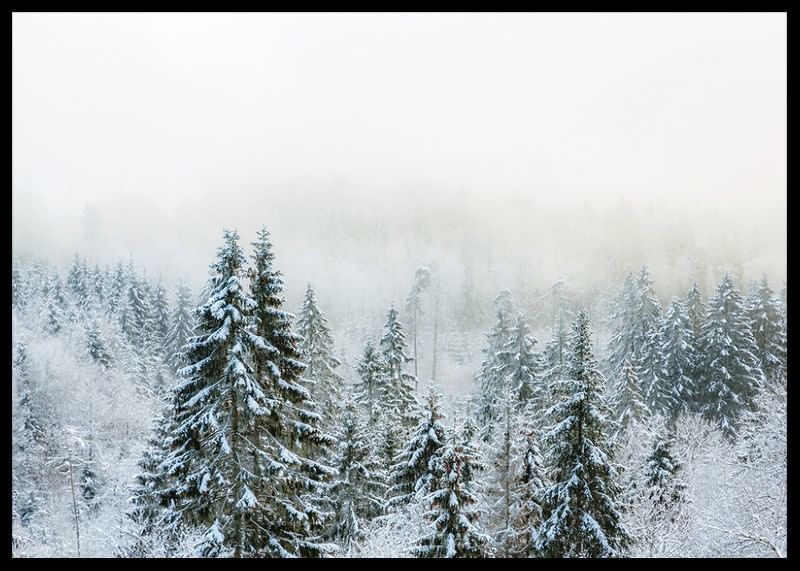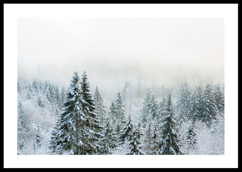 Snötäckta granar breder ut sig över ett frostigt vinterlandskap, där dimman mjukt sveper in mellan trädtopparna. Ljusa nyanser av vitt och grått dominerar och förmedlar en känsla av stillhet. Den här posten passar utmärkt för dig som vill addera ett lugnt och naturnära inslag till ditt hem.