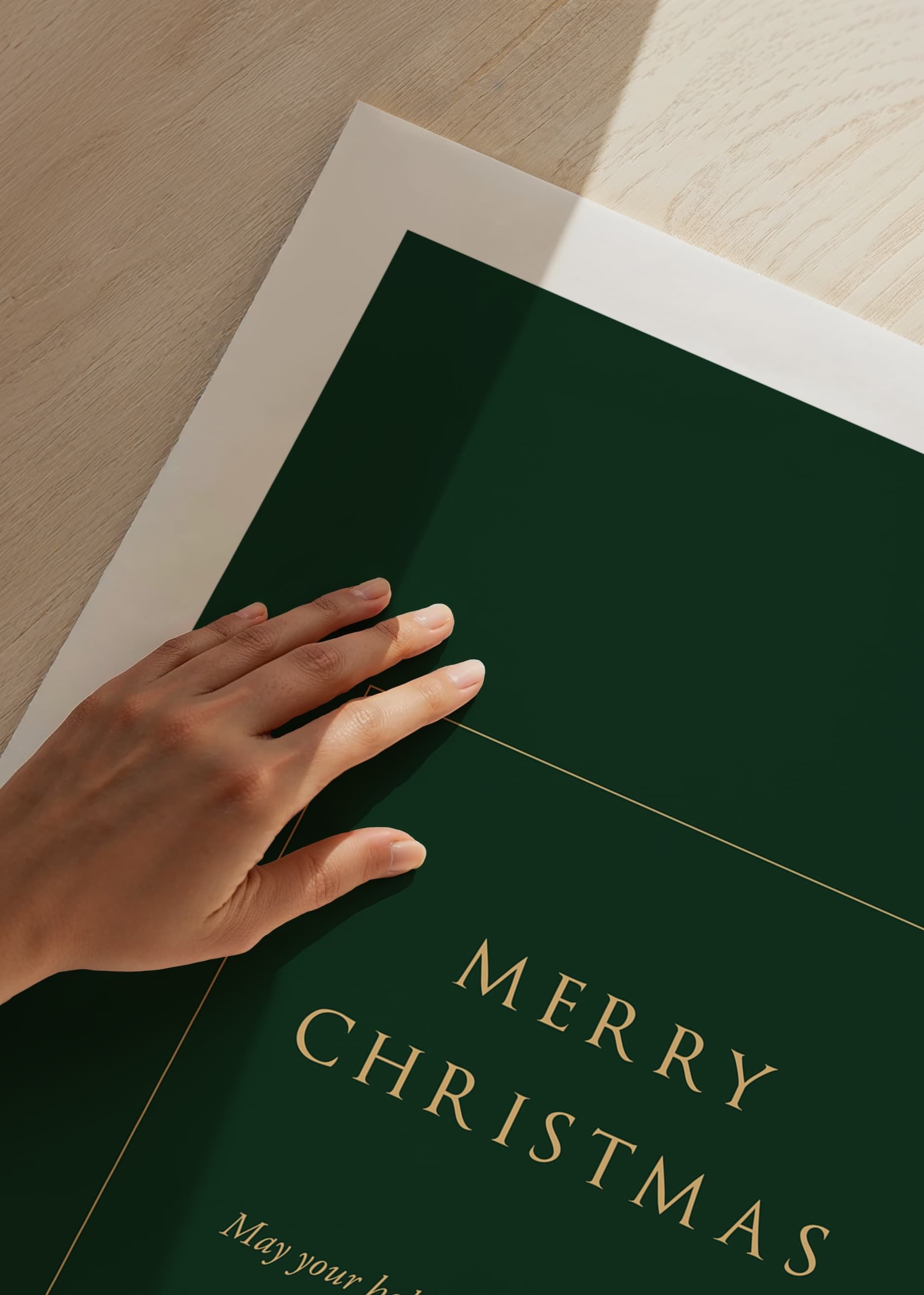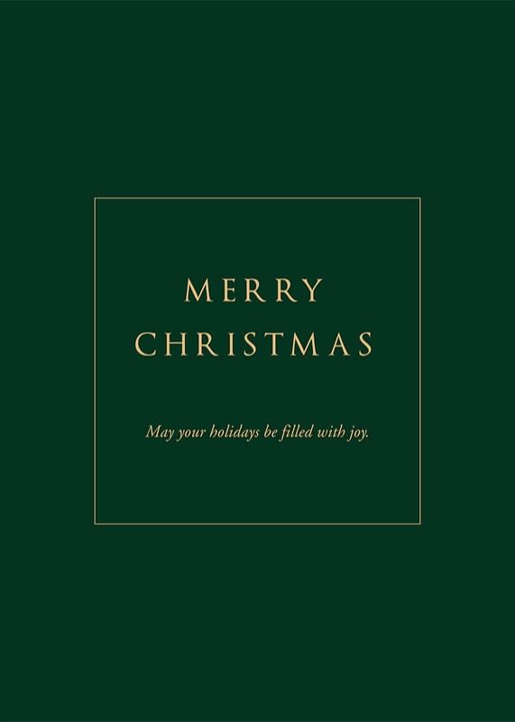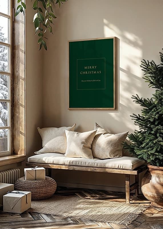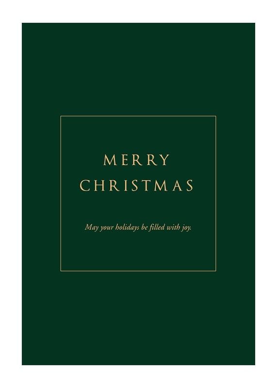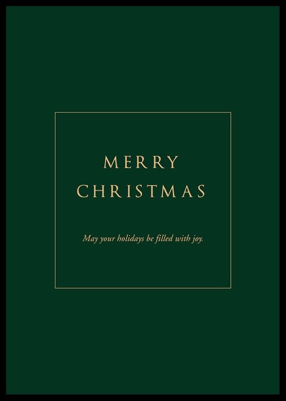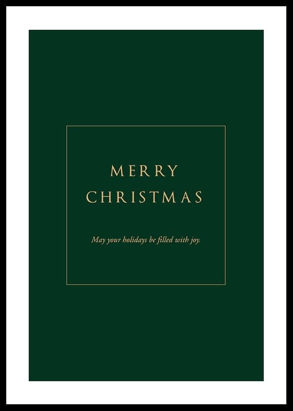 Mittcentrerad text i guldtoner på en djupgrön bakgrund med budskapet 'Merry Christmas' och 'May your holidays be filled with joy.' Den stilrena och minimalistiska designen ger ett sobert uttryck. Som juldekoration tillför denna poster en klassisk högtidskänsla till vardagsrum eller hall under vintersäsongen.
