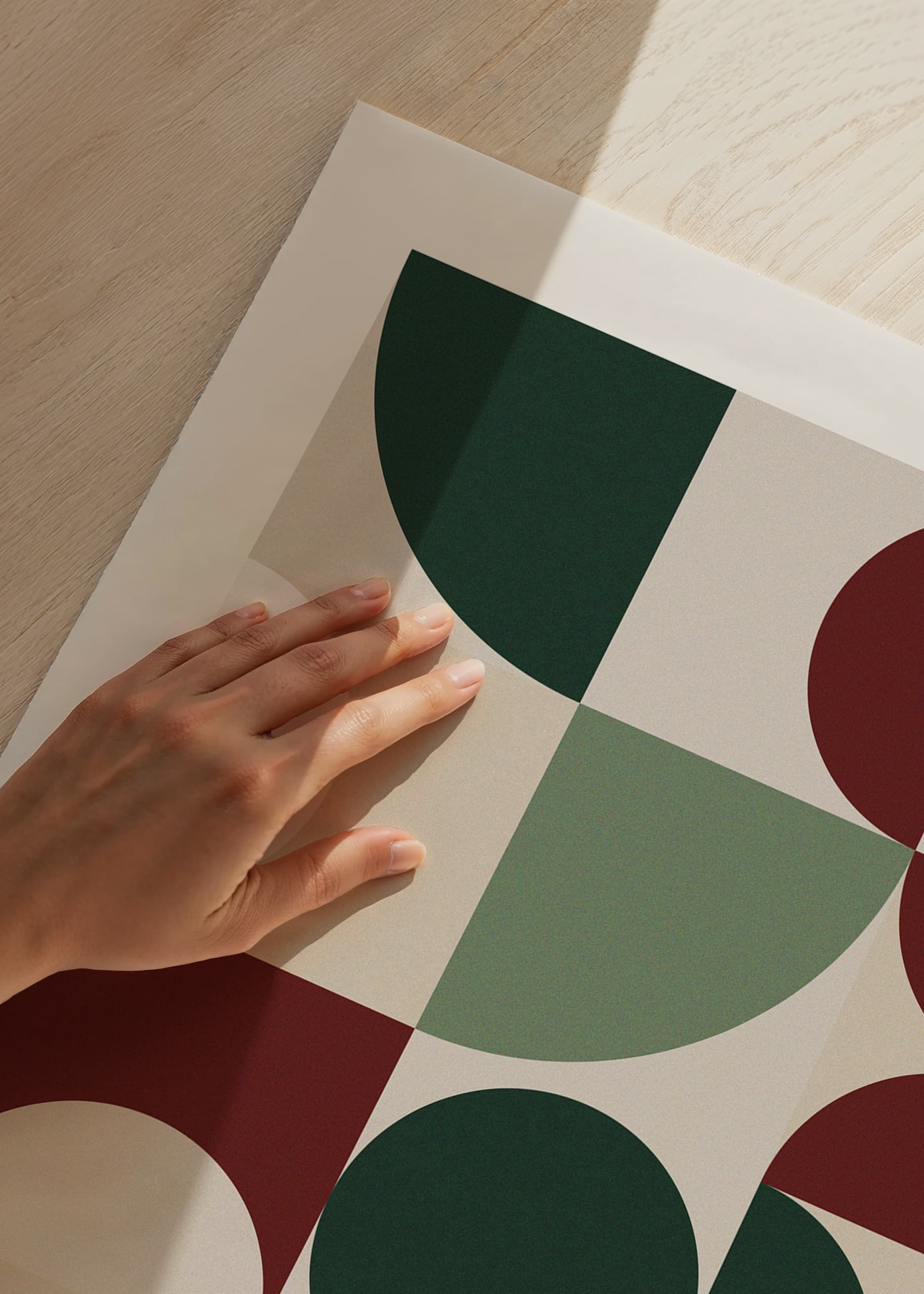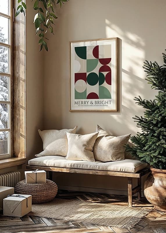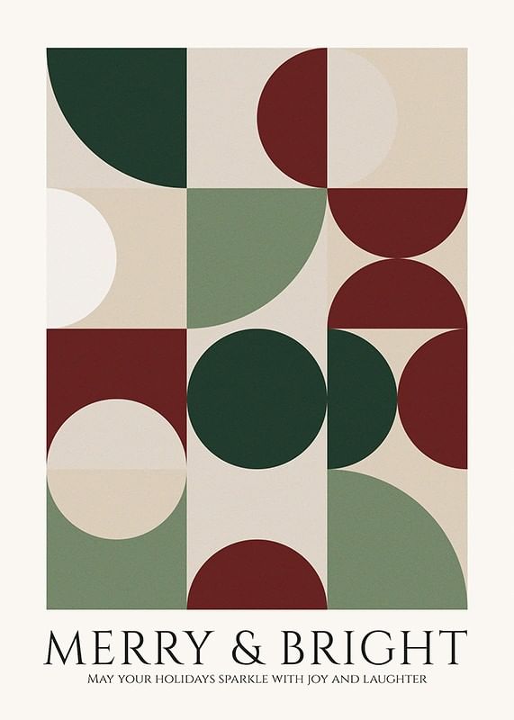 Gröna, röda och beige geometriska cirklar och halvcirklar bildar ett grafiskt vintermotiv med tydliga julfärger. Nederst syns texten 'Merry & Bright' tillsammans med en engelskspråkig julhälsning. En stilren poster som lyfter stämningen i vardagsrum, hall eller kök under vinter- och julsäsongen.