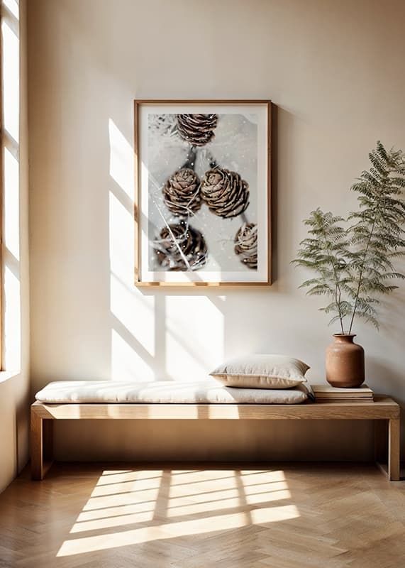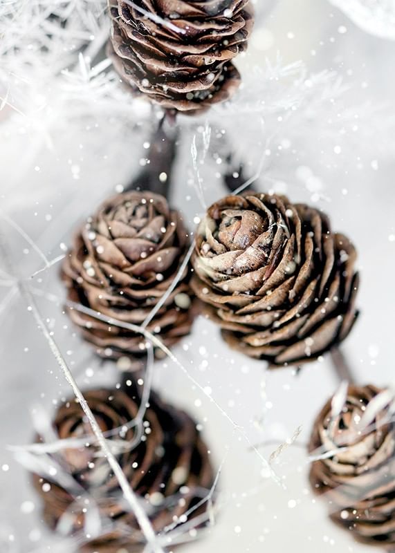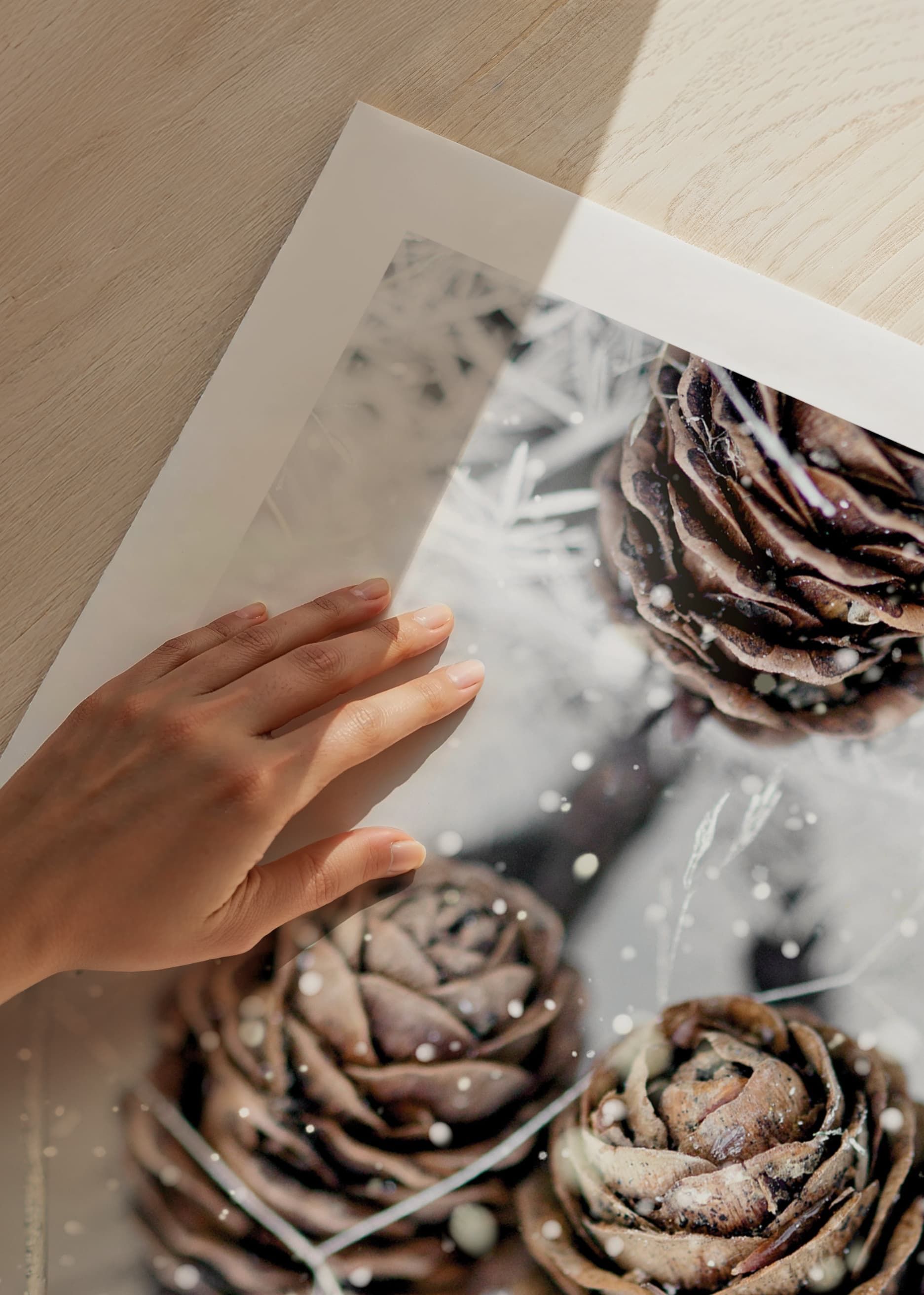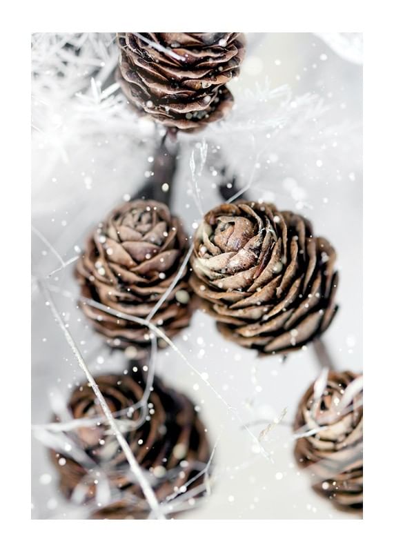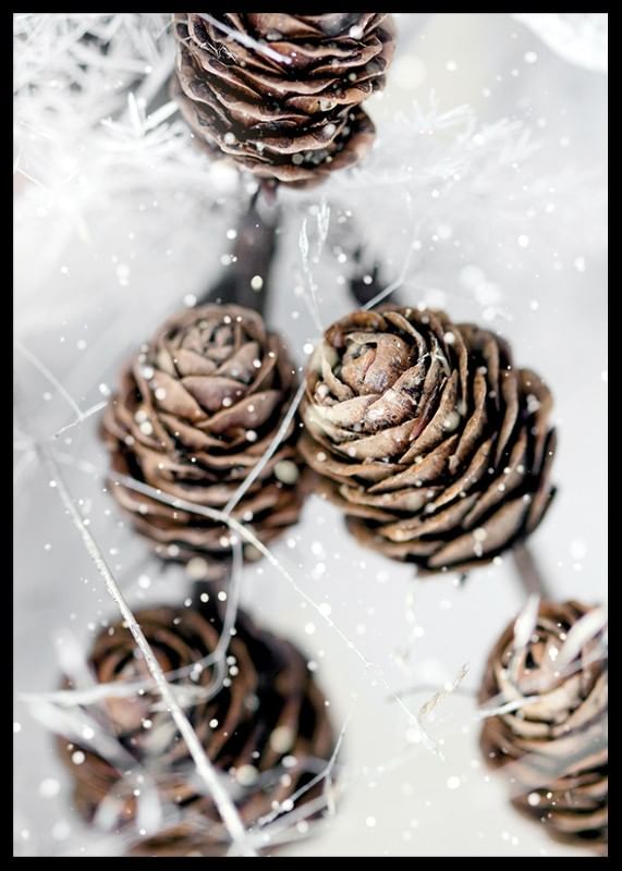 Närbild av flera grankottar täckta av lätt snö mot ett ljust, suddigt vinterlandskap. De naturliga bruna tonerna kontrasterar mot frostiga vita grenar och diskreta snökristaller. Denna poster ger en vintrig känsla och passar fint i hemmets lugna rum under kalla säsonger.