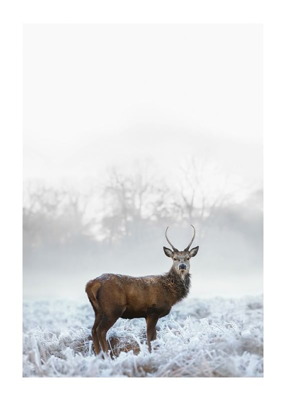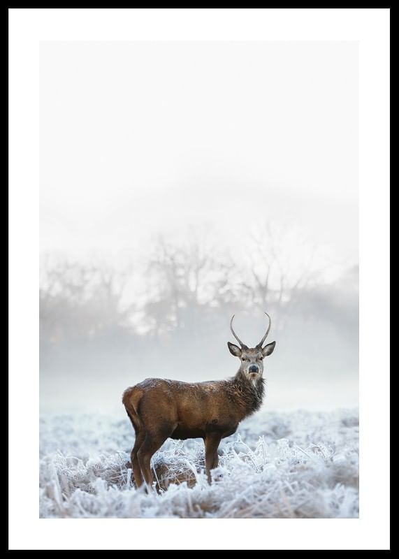 En hjort med tydliga horn står på en frosttäckt äng med rimfrost på gräset. Bakom djuret anas silhuetter av vinterträd i dimma, vilket ger en mjukt avtonad bakgrund. Svala, naturliga färgtoner förstärker känslan av vinter. Den här postern bidrar med ett lugnt naturmotiv till sovrum, hall eller vardagsrum.