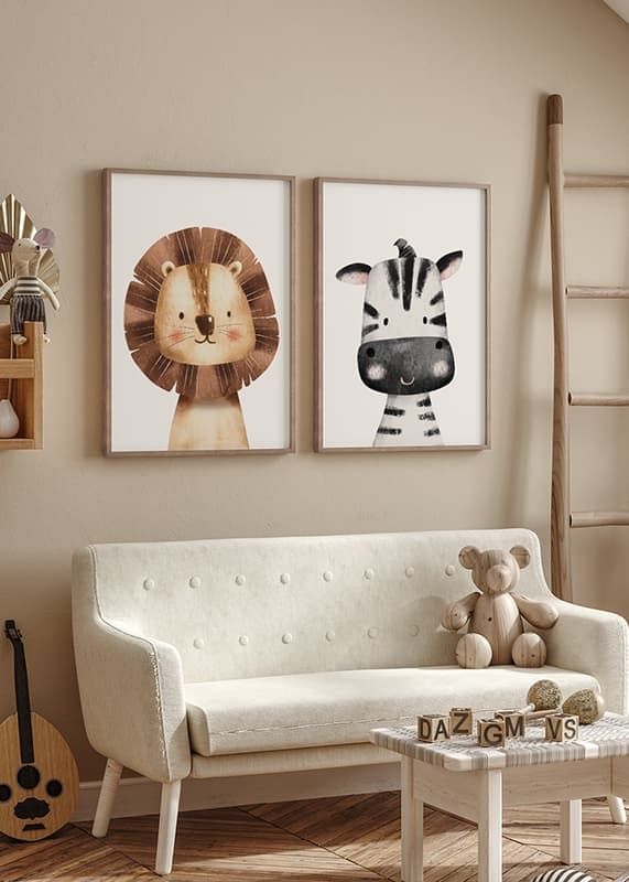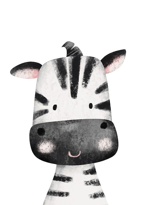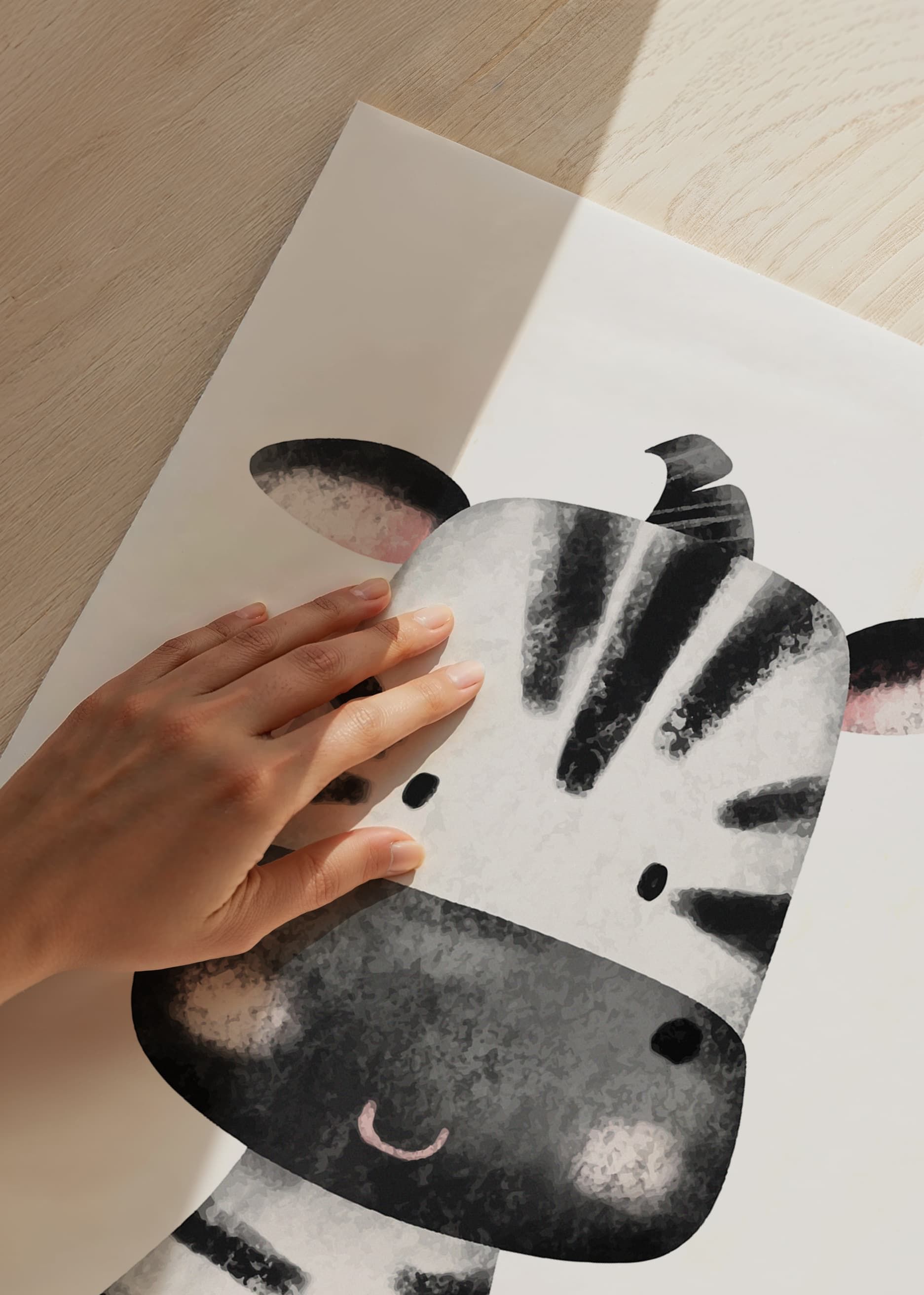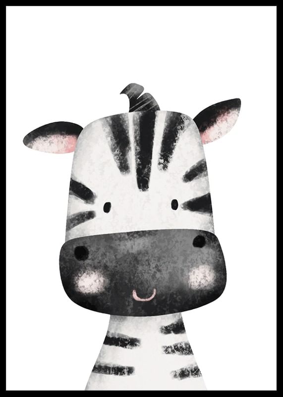 Närbild av en stiliserad zebra med vänligt uttryck, ritad i mjuka svarta och vita toner med inslag av ljusrosa i öronen. De tydliga ränderna och de enkla formerna ger motivet en lekfull karaktär. Denna poster passar fint i barnrum och bidrar med en varm och inbjudande känsla till inredningen.