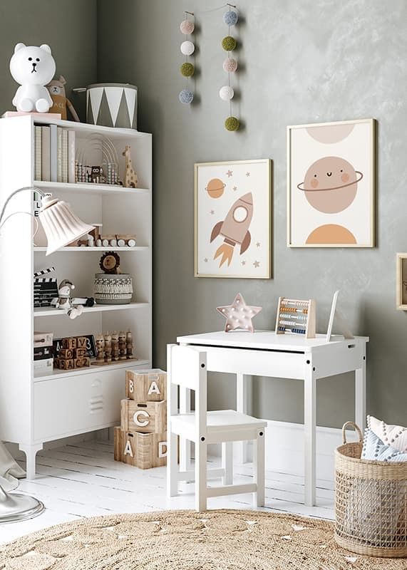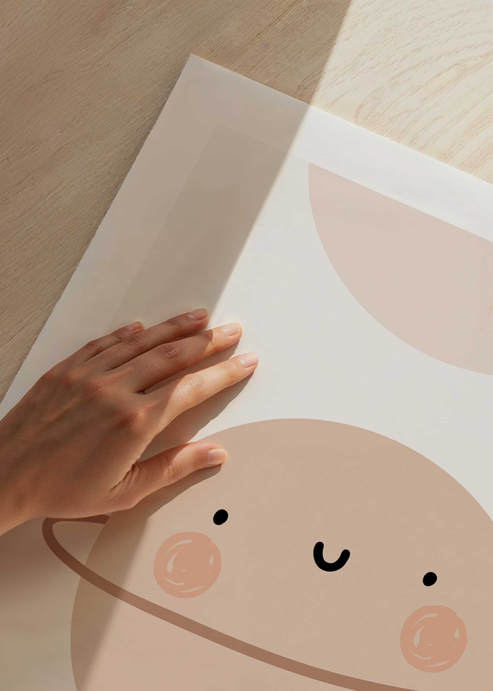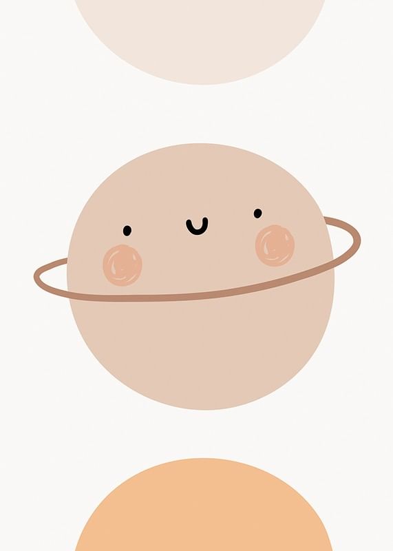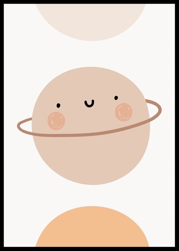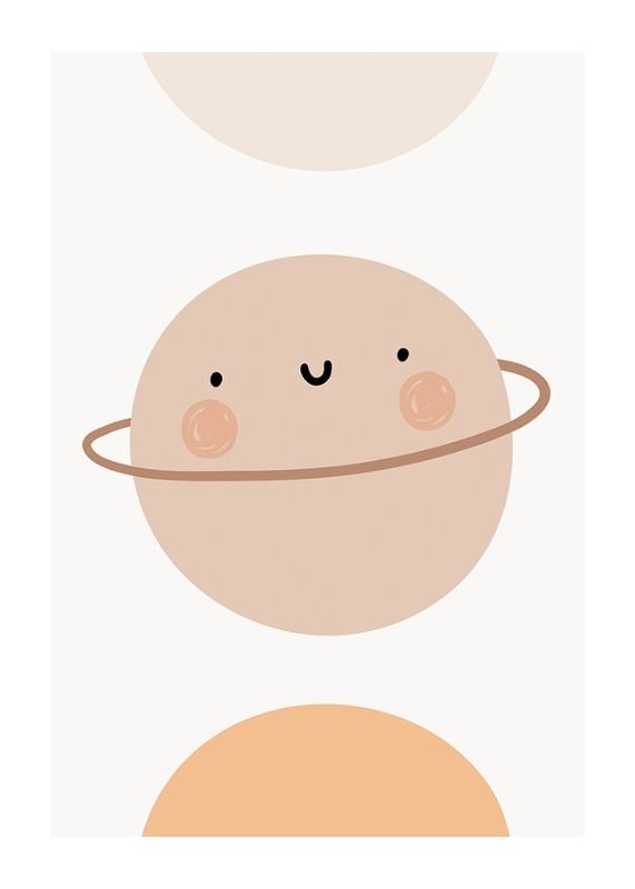 Motivet består av en stiliserad planet med ringar och ett glatt, leende ansikte. Dämpade beige och ljusbruna färger skapar ett lekfullt men harmoniskt intryck. Enkelt formspråk och mjuka linjer gör denna poster till ett fint inslag i barnrummet eller lekhörnan och passar ihop med övriga rymdmotiv.