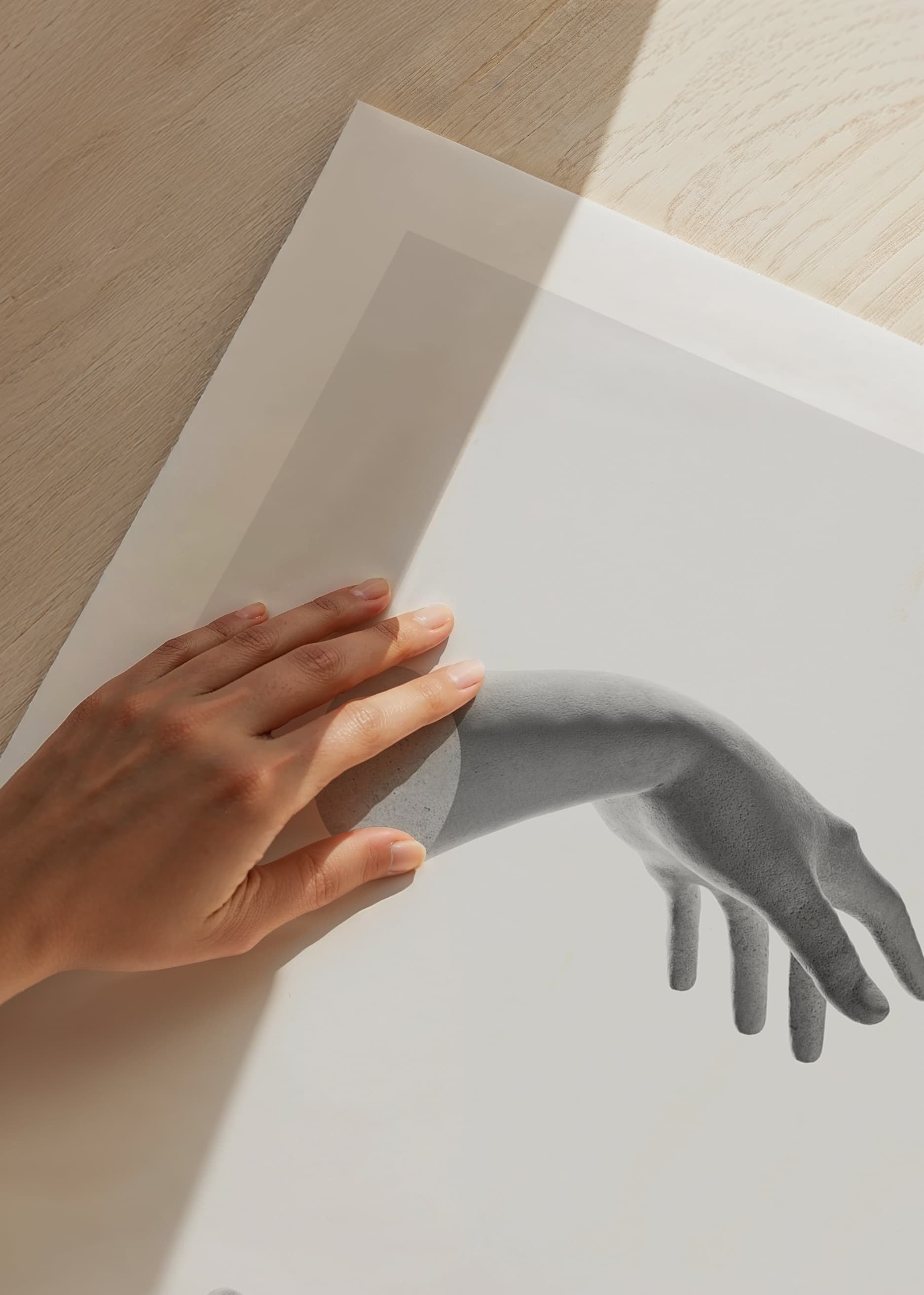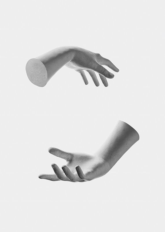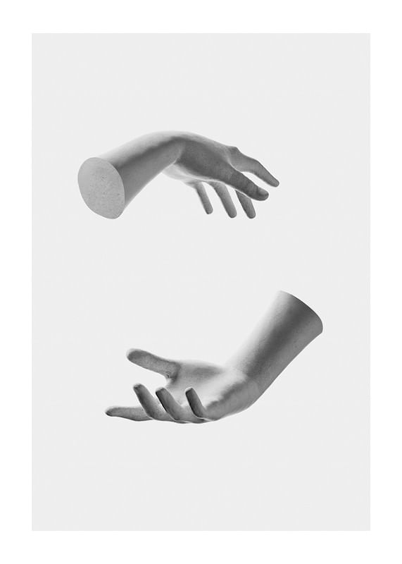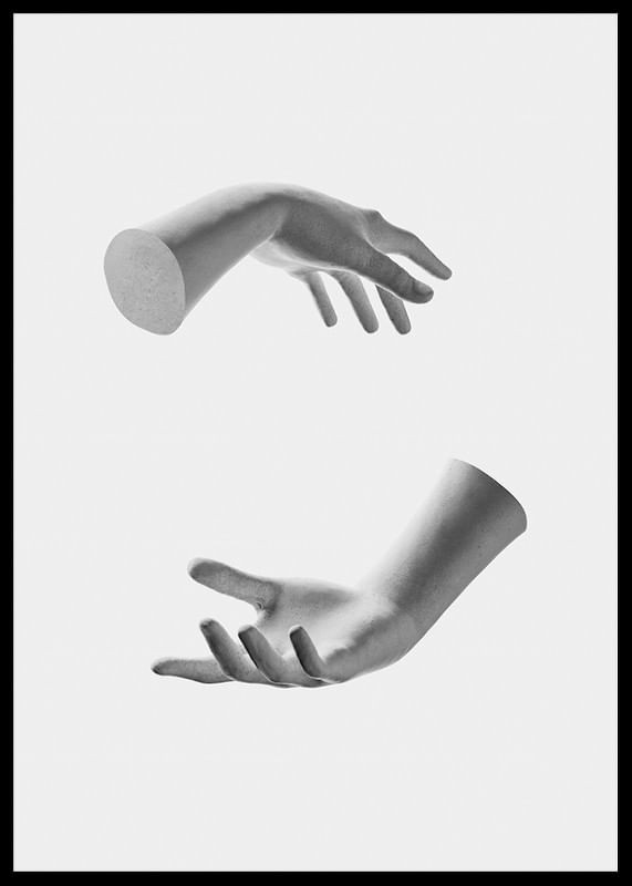 Två realistiskt avbildade händer svävar mitt emot varandra i svartvitt mot en ljust grå bakgrund. Fingrarna är lätt utsträckta och ger känslan av att hålla något osynligt. Den minimalistiska kompositionen ger postern en modern prägel och samspelar väl med både avskalade och kreativa interiörer.
