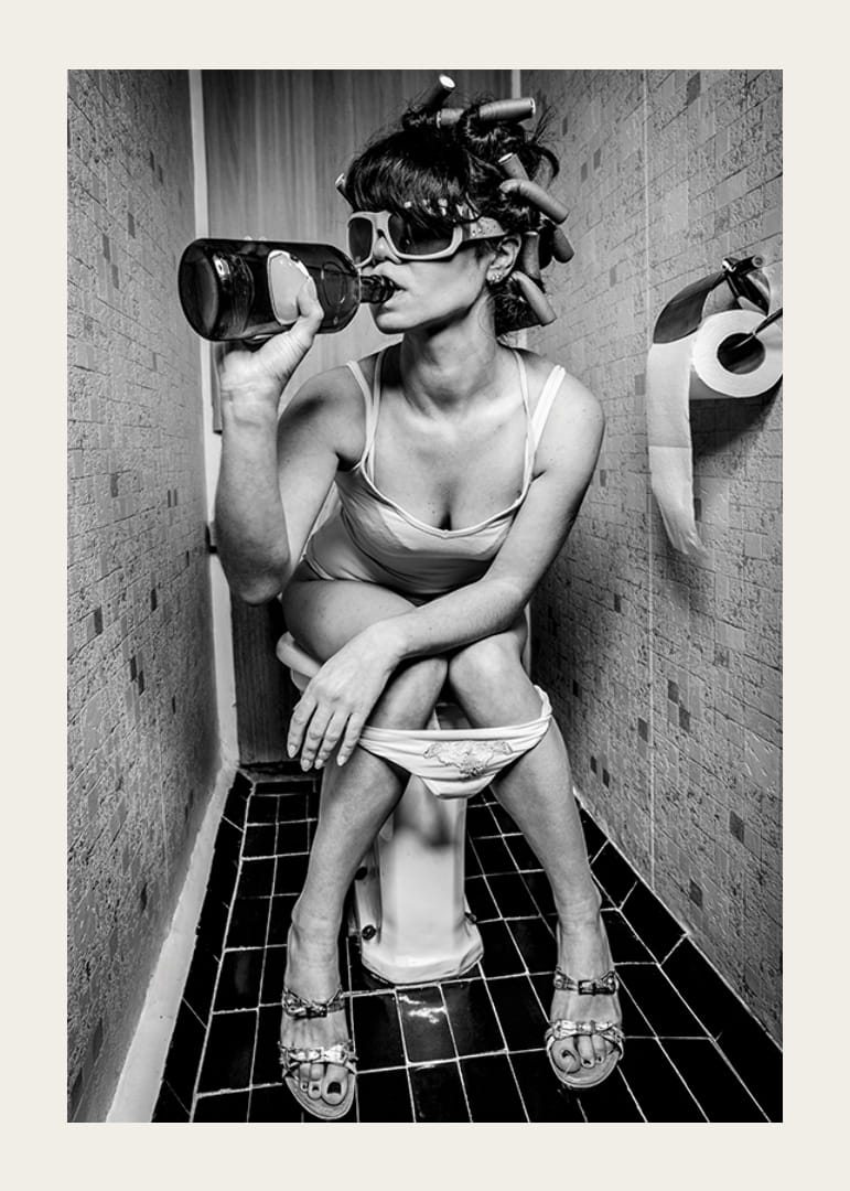 Motivet består av en kvinna med papiljotter och solglasögon som sitter iklädd underkläder på en toalett och dricker direkt ur en flaska. De svartvita kontrasterna och den trånga miljön ger motivet en stilren och samtidigt humoristisk karaktär. Denna poster passar i moderna hem med plats för attityd och lekfullhet.