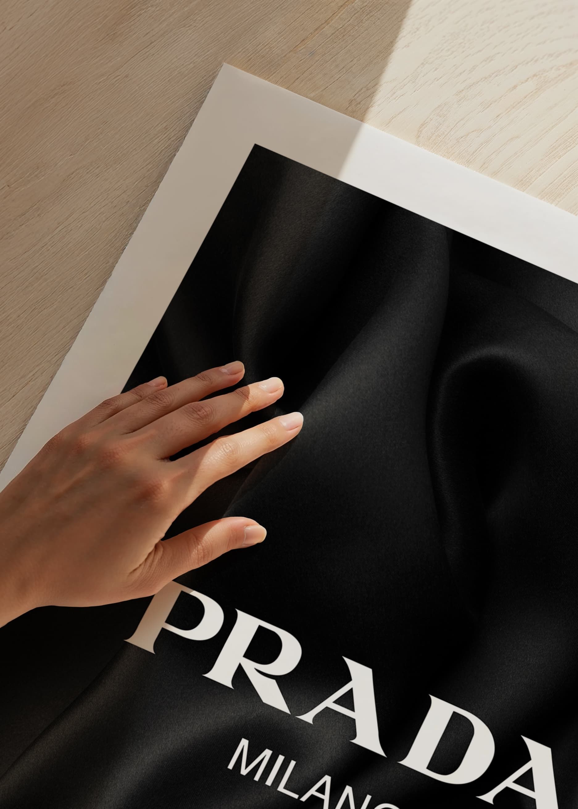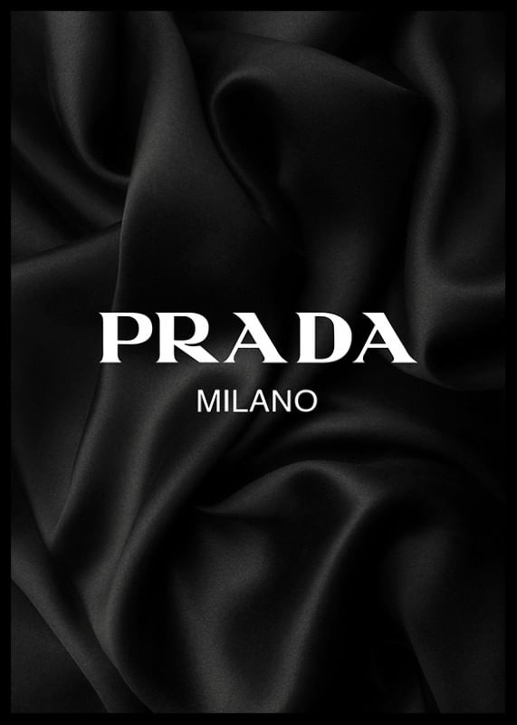 Stora vita bokstäver stavar ut Prada Milano mot en bakgrund av mjukt veckad svart satäng. Den svartvita kontrasten i motivet ger en stilren och modern känsla. Passar poster i modeinspirerade rum, exempelvis sovrum, garderob eller hall, där en elegant och grafisk detalj önskas i inredningen.