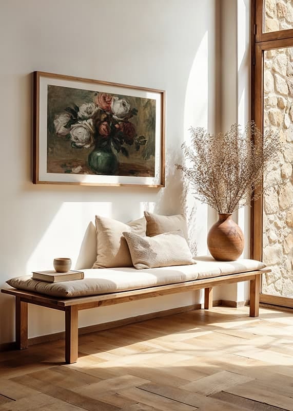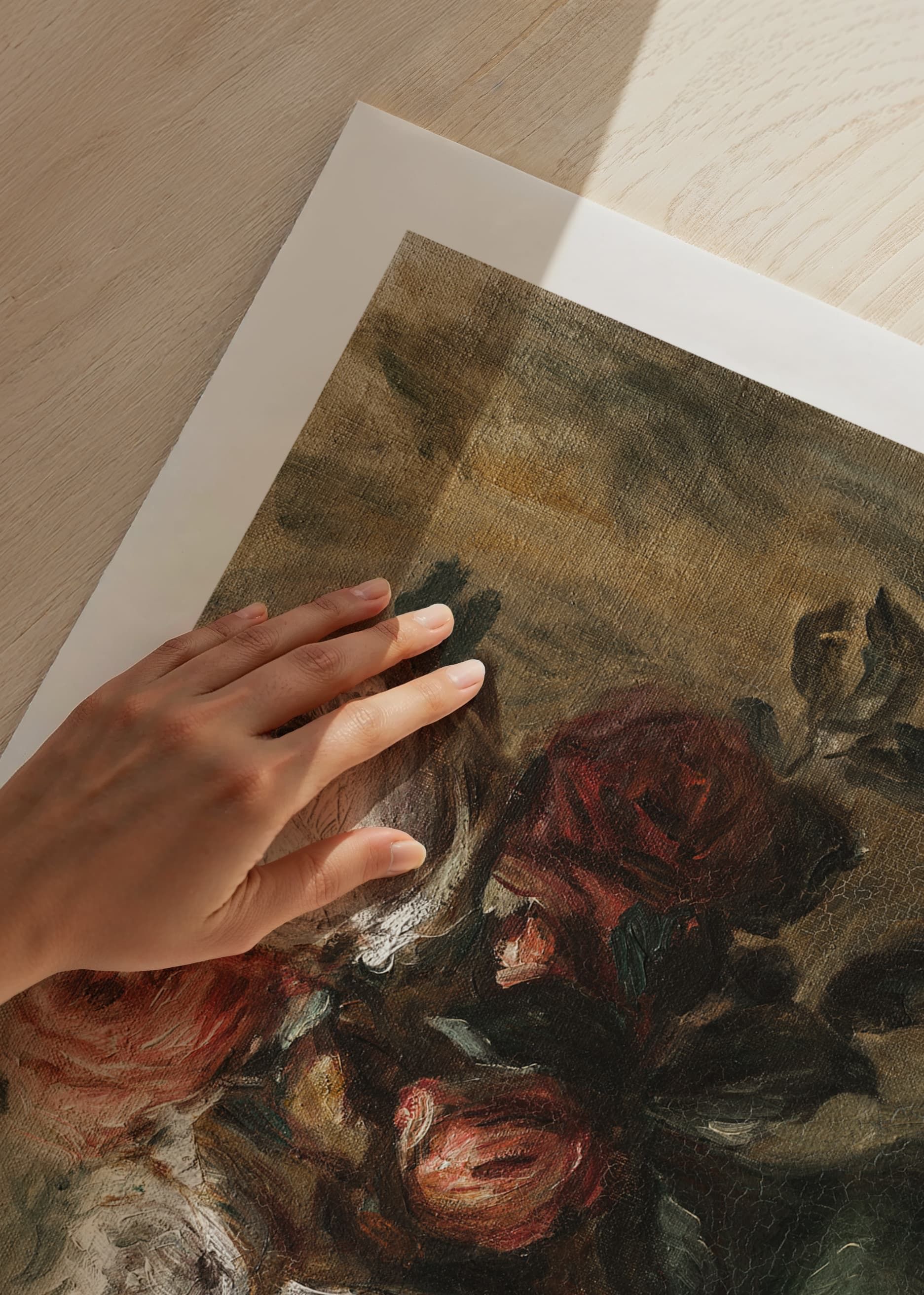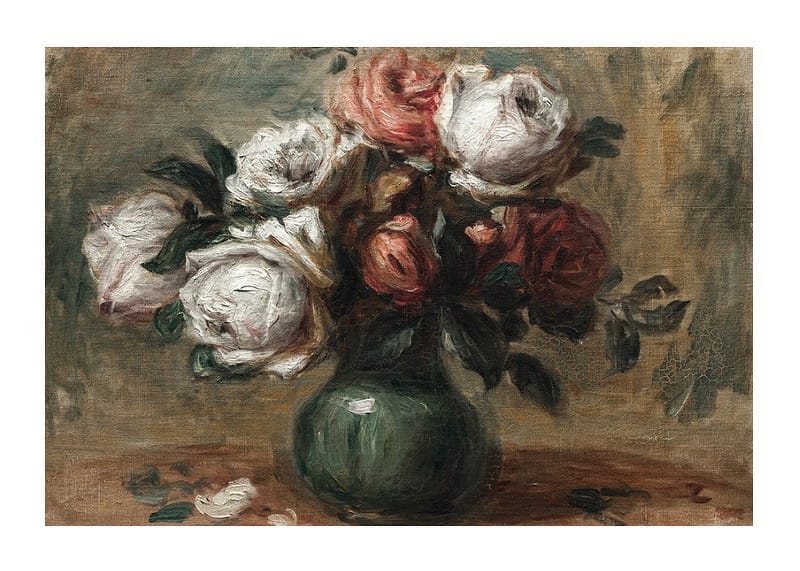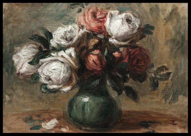 Poster med målningen "Roses In A Vase" av den franske konstnären Pierre-Auguste Renoir från år 1872. Pierre-Auguste Renoir (1841-1919) var en målande fransk impresionistisk konstnär som är känd för sina lekfulla, koloristiska landskapsmålningar och porträtt. Han föddes i närheten av Paris i ett fattigt arbetarklasshem, där hans far var mekaniker och hans mor var en syerska. Hans intresse för konst vaknade tidigt och han började att studera målning vid 14 års ålder. Renoir studerade senare vid Beaux-Arts i Paris, vilket ledde till att han blev en av de viktigaste konstnärerna i den franska Impressionismen. Under sin karriär började han tillämpa ljusa, vågiga linjer och levande färger för att fånga atmosfären och känslan med i sina målningar. Han målade främst landskap och porträtt, men han målade även genre- och stillbilder som återspeglade hans livslust och glädje. Renoirs målningar är kända för att fånga naturens innersta skönhet och hans verk har inspirerat många andra konstnärer. Hans största verk är La Balançoire (1876), som visar en lekfull och livfull bild av tre barn som leker vid en gunga. Hans verk har visats på många utställningar och har hållit sig populära i över ett sekel. Renoirs målningar är ett monument över det glada, livliga och koloristiska livet som han försökte fånga med sin konst.