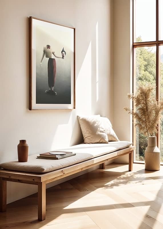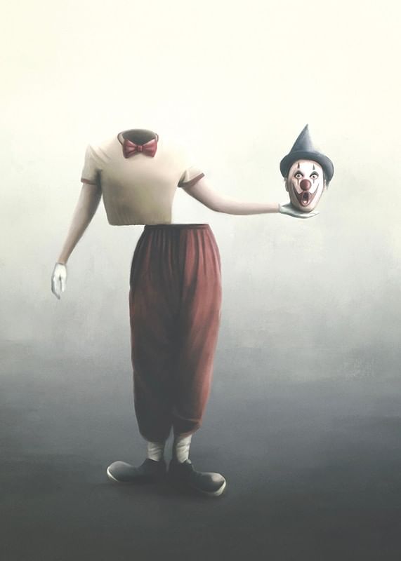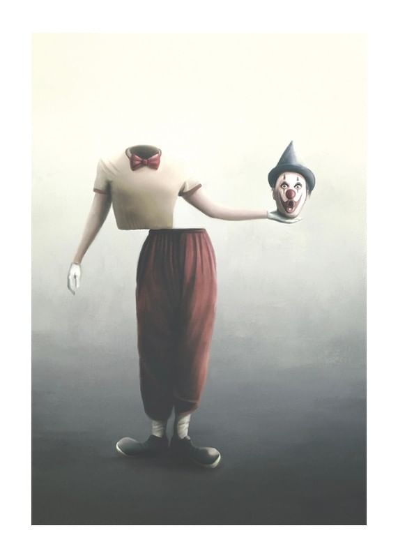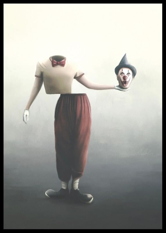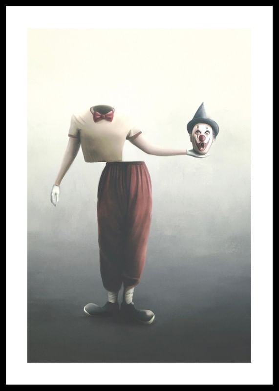 En clownfigur utan huvud står mot en diffus ljus bakgrund, klädd i rödbruna byxor, beige tröja och röd fluga. I ena handen håller clownen sitt eget huvud med klassiskt smink, vit handske och svart partyhatt. Denna poster med surrealistiskt motiv ger rummet en oväntad och konceptuell karaktär.
