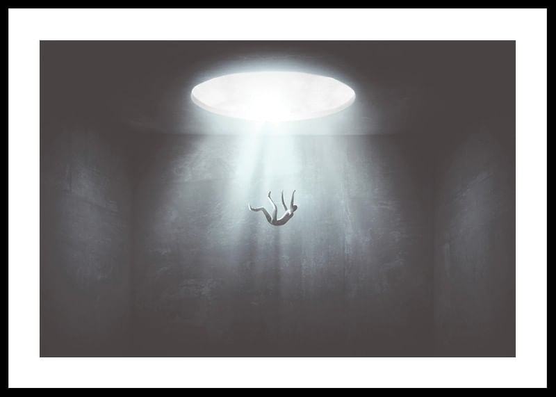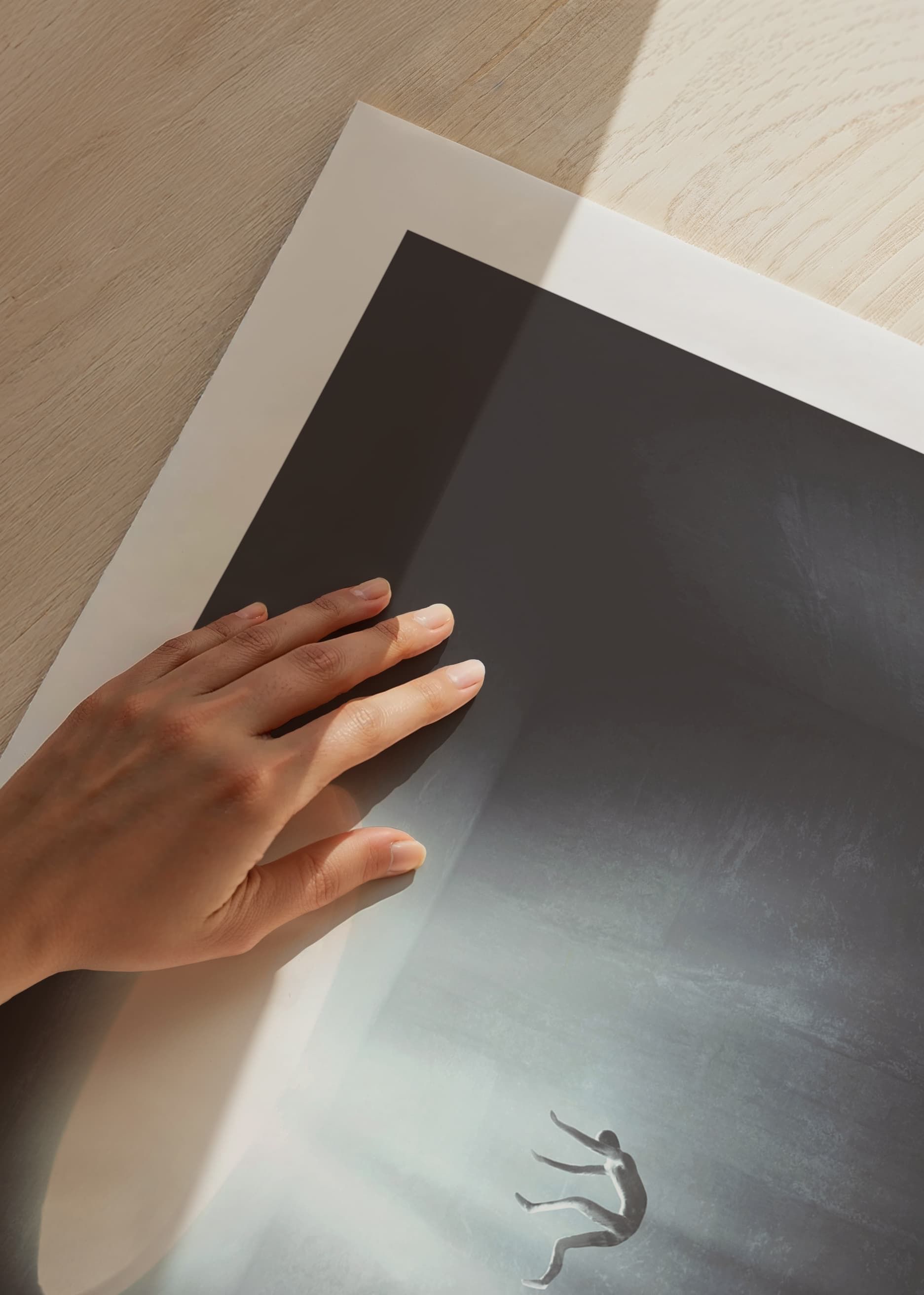 Motivet består av en mänsklig figur som faller nedåt från en rund öppning där starkt ljus strömmar in. Rummet omkring är dunkelt med gråbetongliknande väggar. Kontrast mellan ljus och mörker ger postern en konceptuell och dramatisk känsla. Passar i moderna och kreativa miljöer.