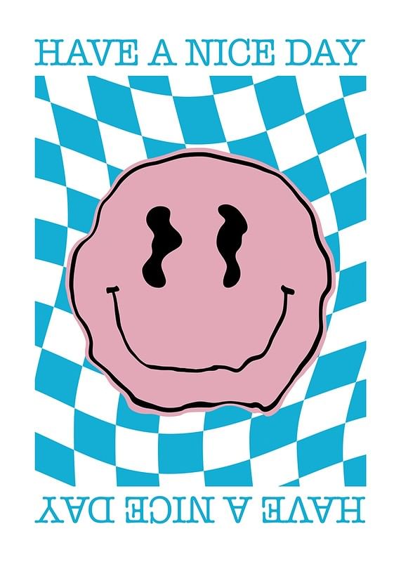 En vågig, handtecknad smiley i rosa står i centrum mot ett rutigt blåvitt mönster med illusion av rörelse. Ovanför och nedanför motivet syns texten 'Have A Nice Day' i blåa bokstäver. Denna poster ger ett lekfullt och modernt uttryck och passar fint i allt från ungdomsrum till hemmakontor eller kreativa miljöer.