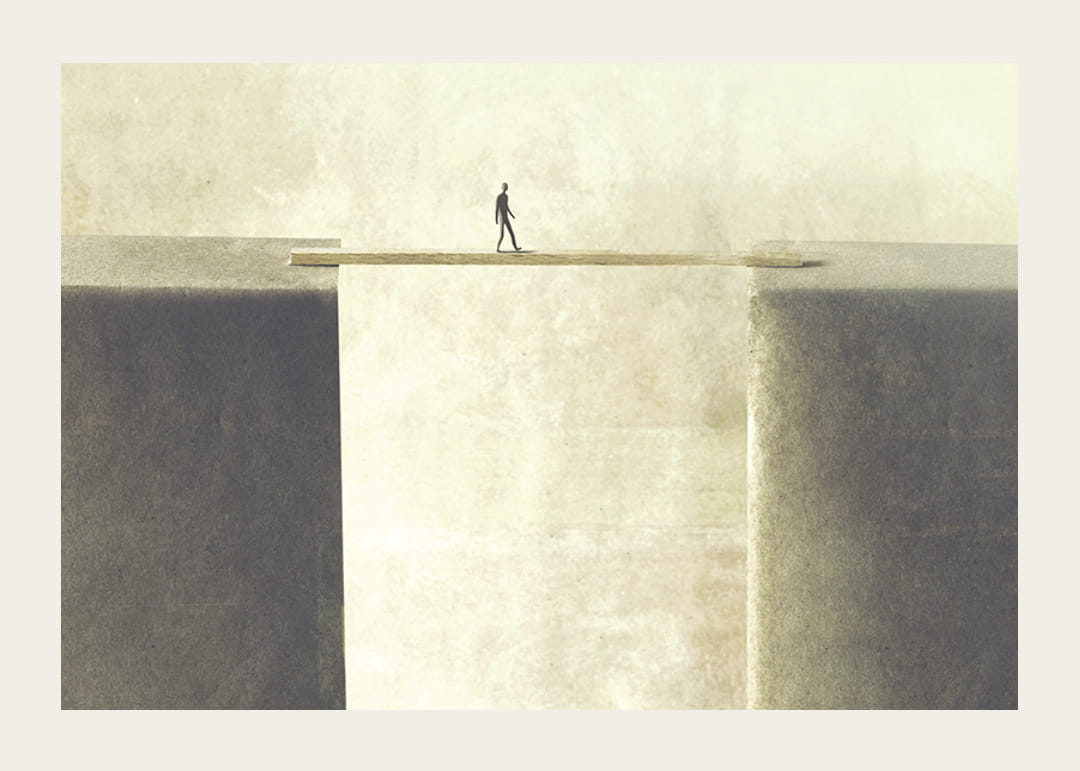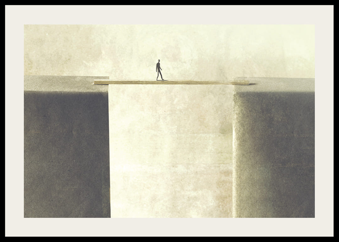 En ensam silhuett av en människa går på en smal bräda som förbinder två massiva, ljusgrå klippblock över en djup avgrund. Bakgrunden är ljust beige och minimalistisk, vilket ger motivet en luftig känsla. Postern fungerar som en konceptuell detalj i hemmet och passar bra i moderna miljöer.