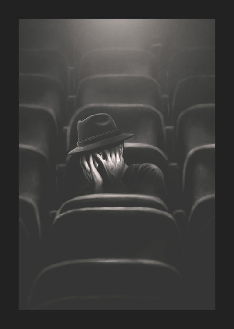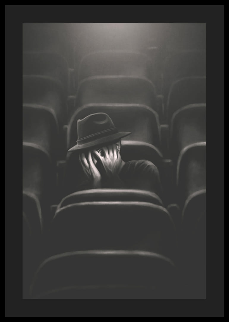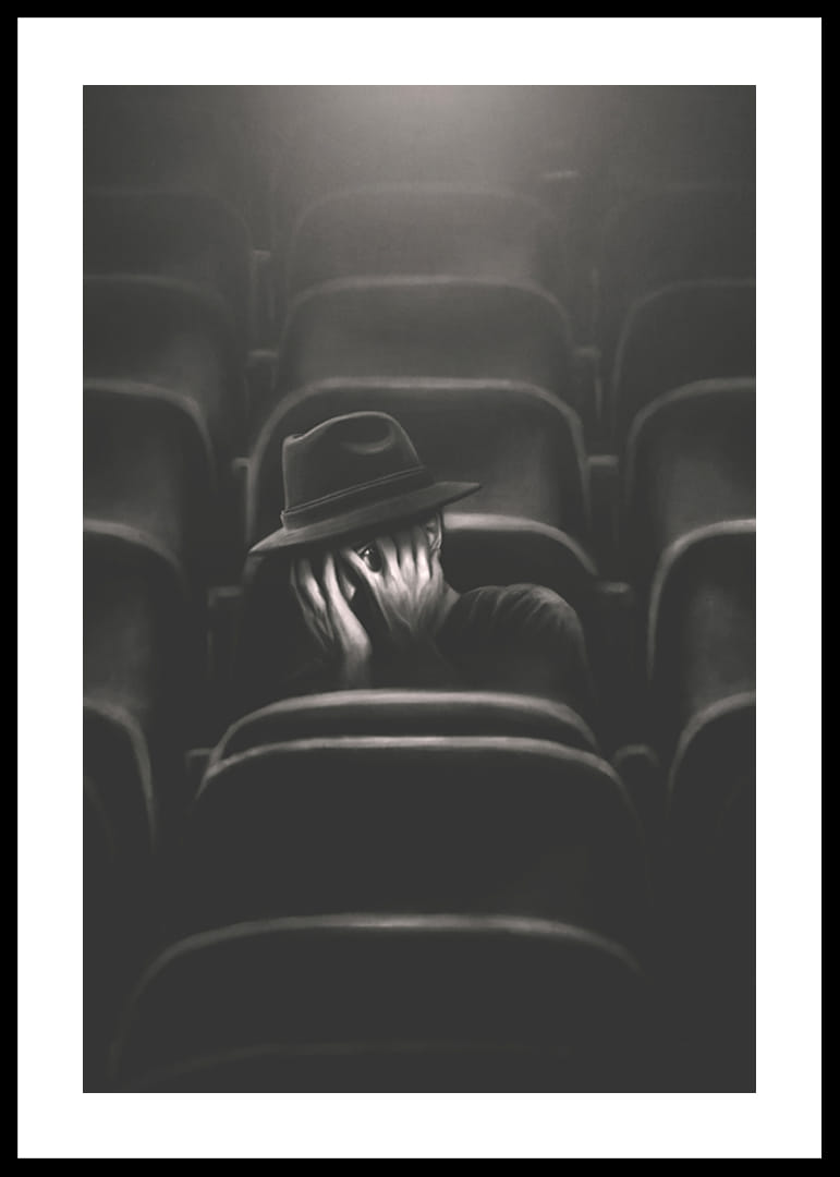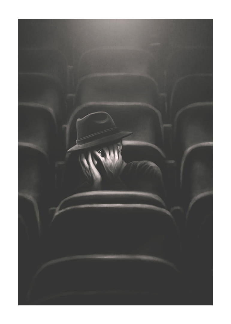 En ensam man sitter bland tomma stolsrader i en dunkelt belyst biosalong och gömmer ansiktet i händerna. Motivets dämpade gråtoner och subtila ljus skapar en känsla av isolering och spänning. Med sitt konceptuella uttryck blir denna poster ett intressant tillskott i vardagsrum, arbetsrum eller hall.